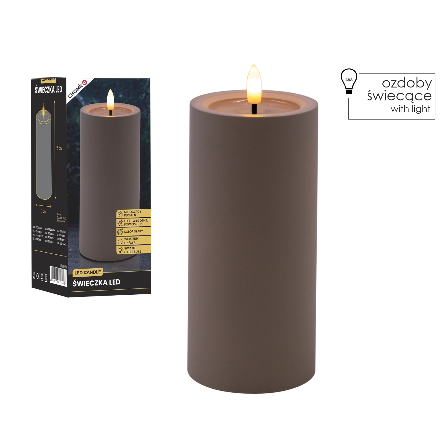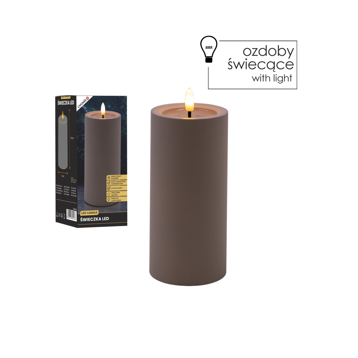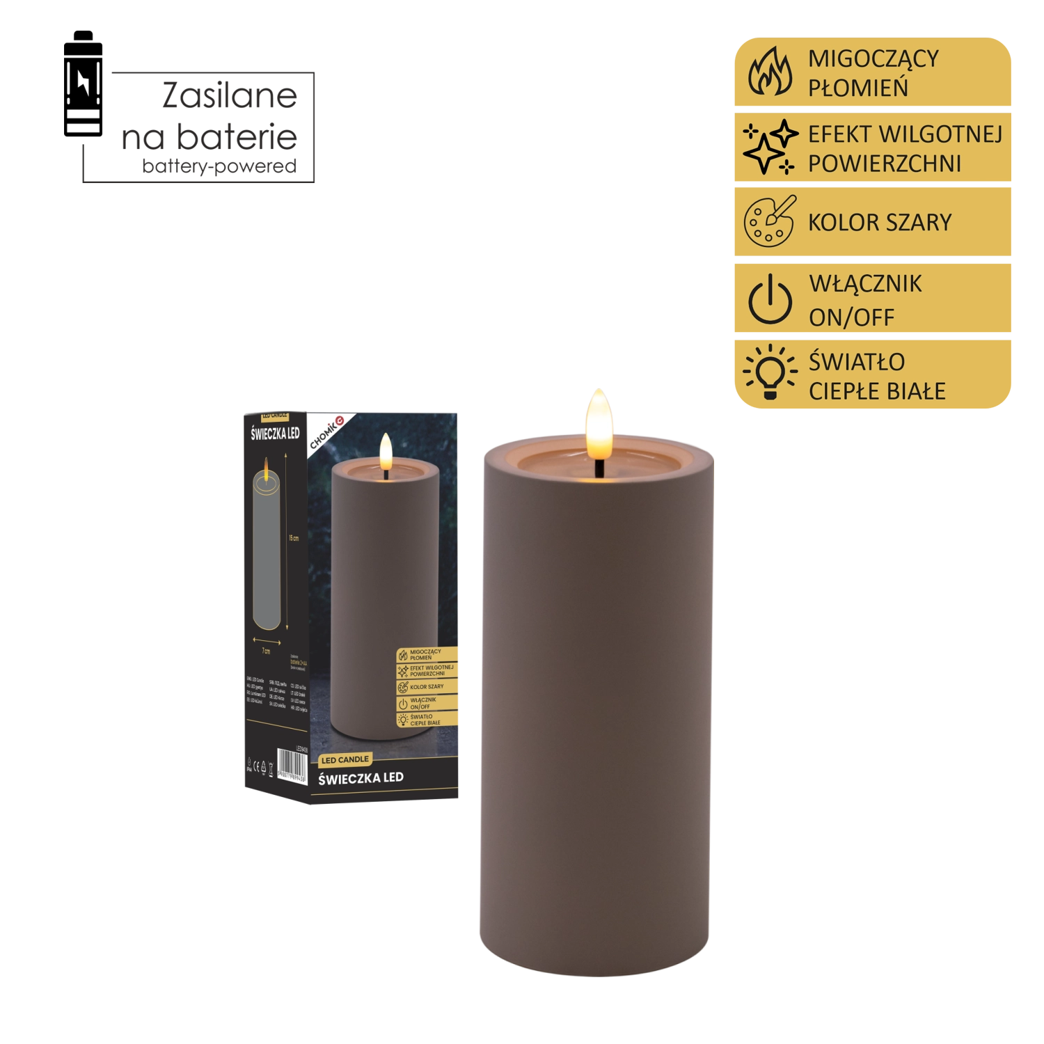 Această lumânare LED gri oferă iluminare sigură și stilată pentru orice încăpere. Datorită luminii alb cald și efectului de flacără pâlpâitoare, imită fidel o lumânare reală, iar efectul special de suprafață superioară umedă îi conferă un aspect autentic.
