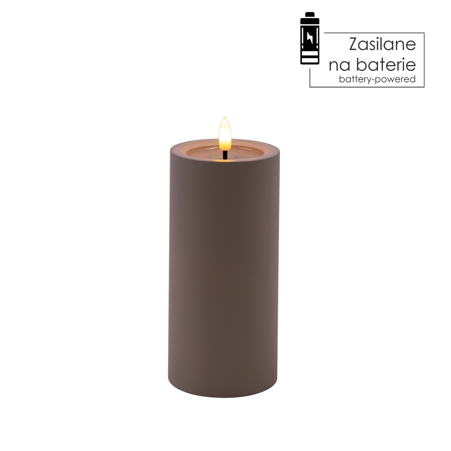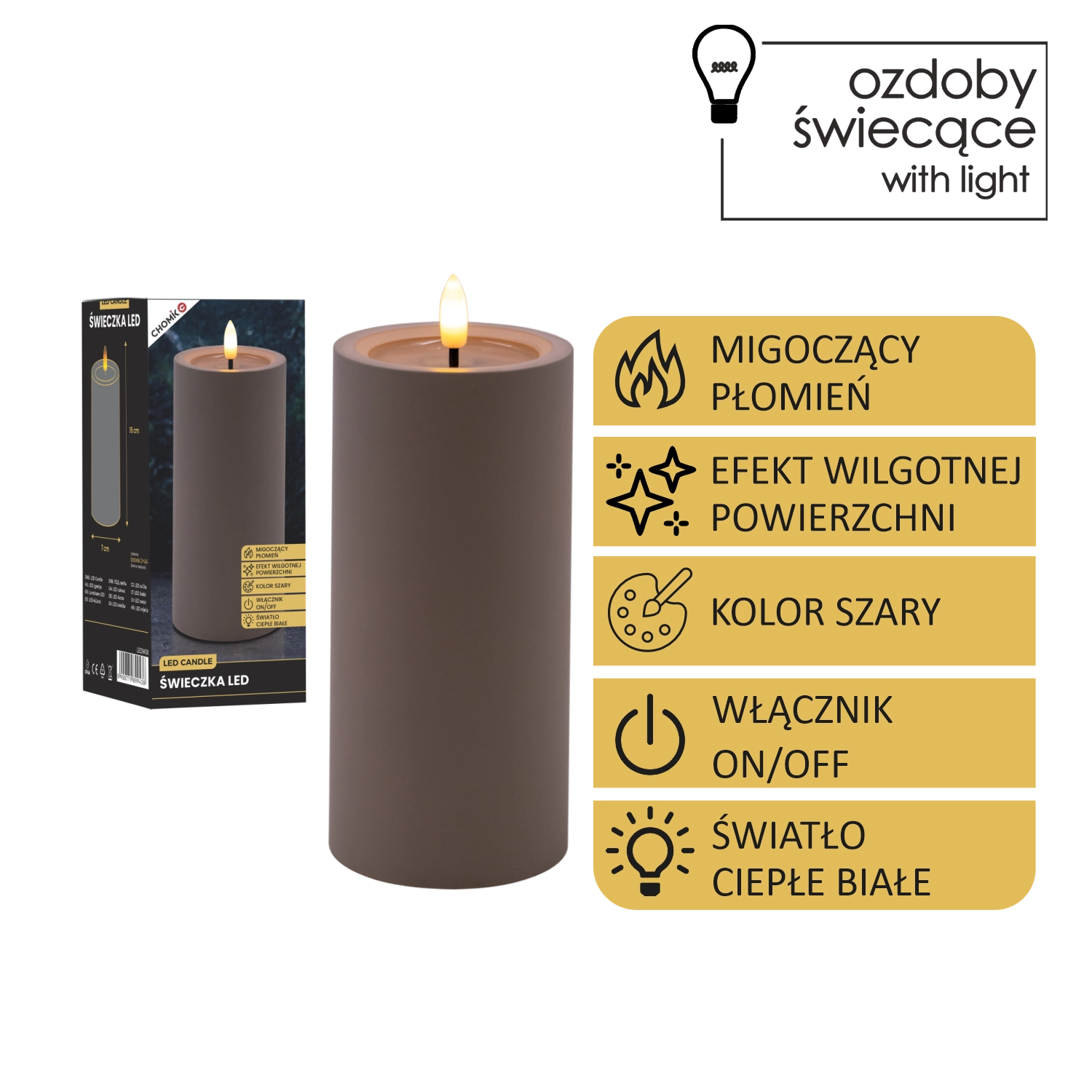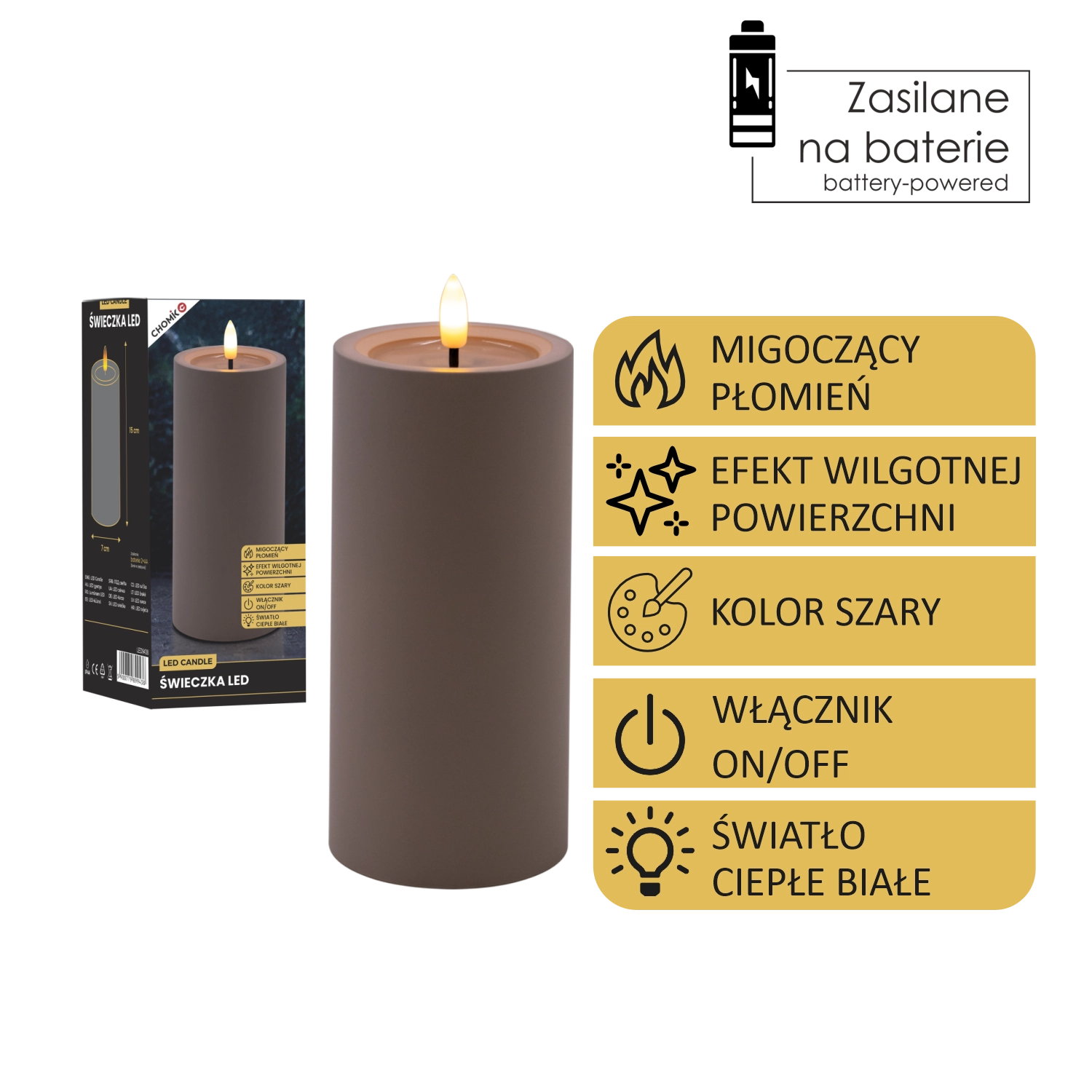 Această lumânare LED gri oferă iluminare sigură și stilată pentru orice încăpere. Datorită luminii alb cald și efectului de flacără pâlpâitoare, imită fidel o lumânare reală, iar efectul special de suprafață superioară umedă îi conferă un aspect autentic.
