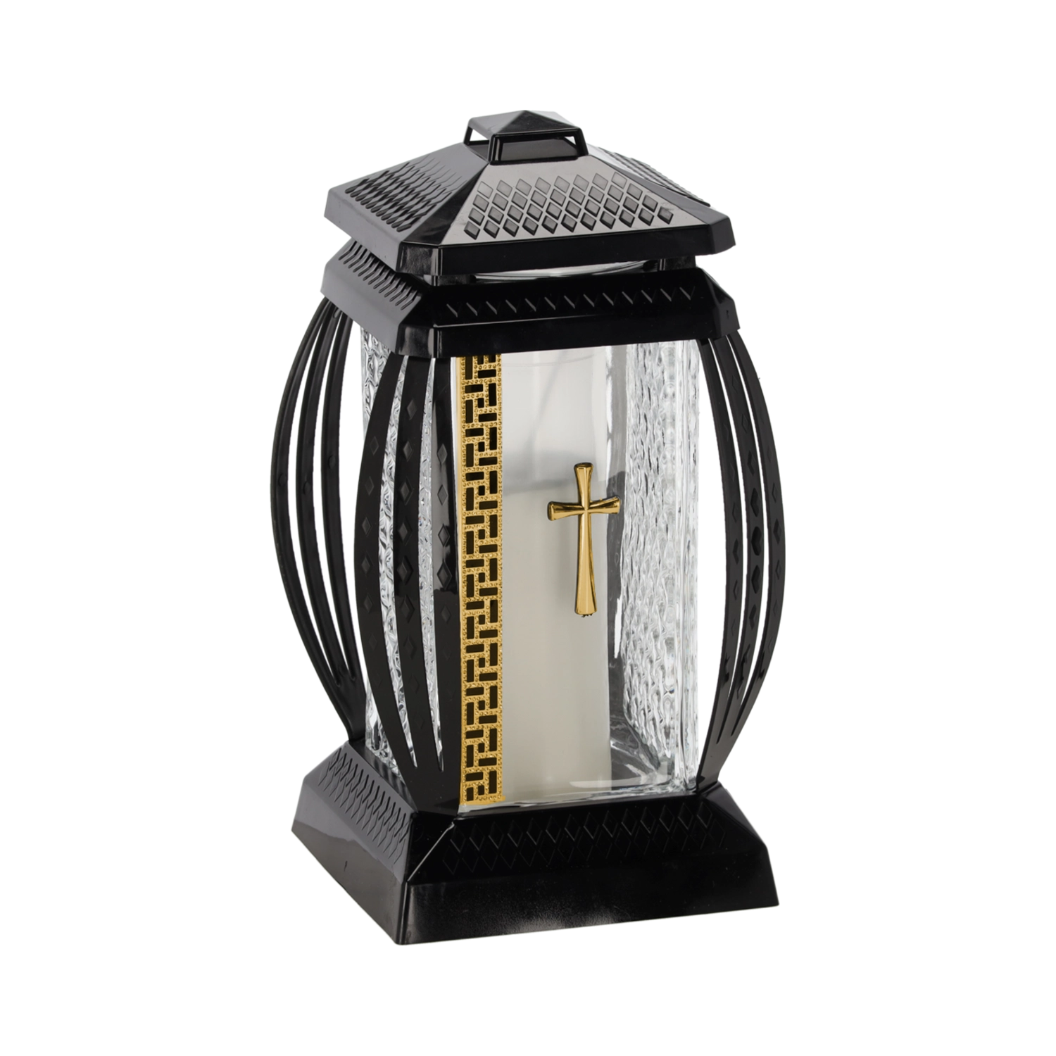 Lumânare cimiterială elegantă model Prima Vera, cu înălțimea de 28 cm, decorată cu sclipici și motiv de cruce, disponibilă în culoare aurie sau argintie. Oferă până la 45 de ore de ardere, îmbinând eleganța estetică cu durabilitatea îndelungată și este ideală pentru decorarea demnă a locului de veci.