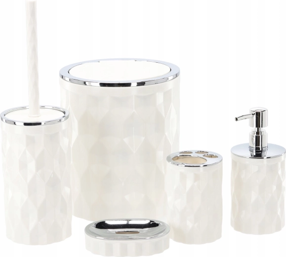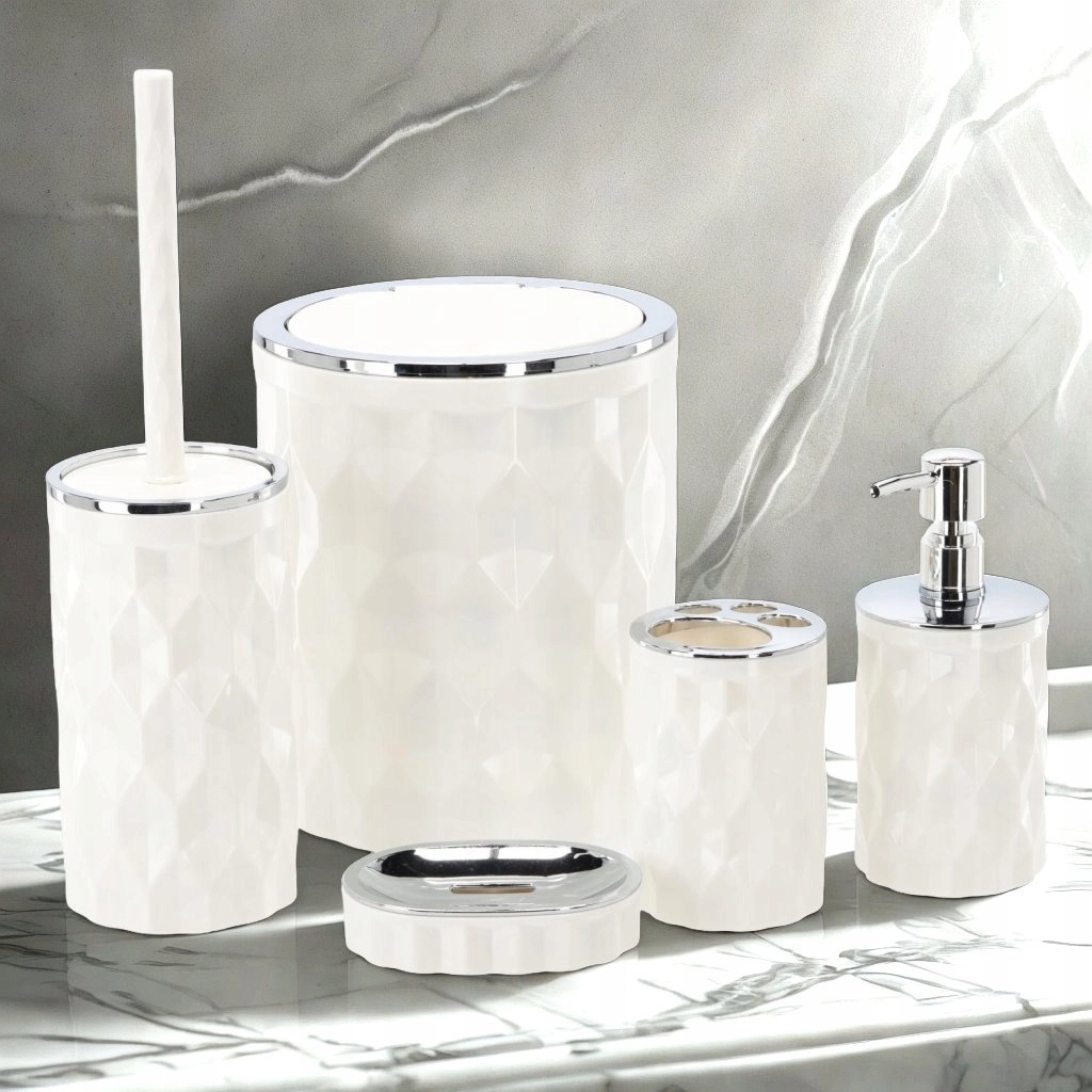 Setul stilat din 5 piese de accesorii pentru baie, în elegantul alb, îți oferă tot ce ai nevoie pentru igiena zilnică și ordine. Datorită designului unitar cu detalii moderne și dispunerii practice a elementelor, obții un aspect curat, armonizat al băii și o întreținere ușoară. Setul include coș de gunoi, suport cu perie pentru WC, dispenser pentru săpun lichid, suport pentru periuțe de dinți și savonieră.