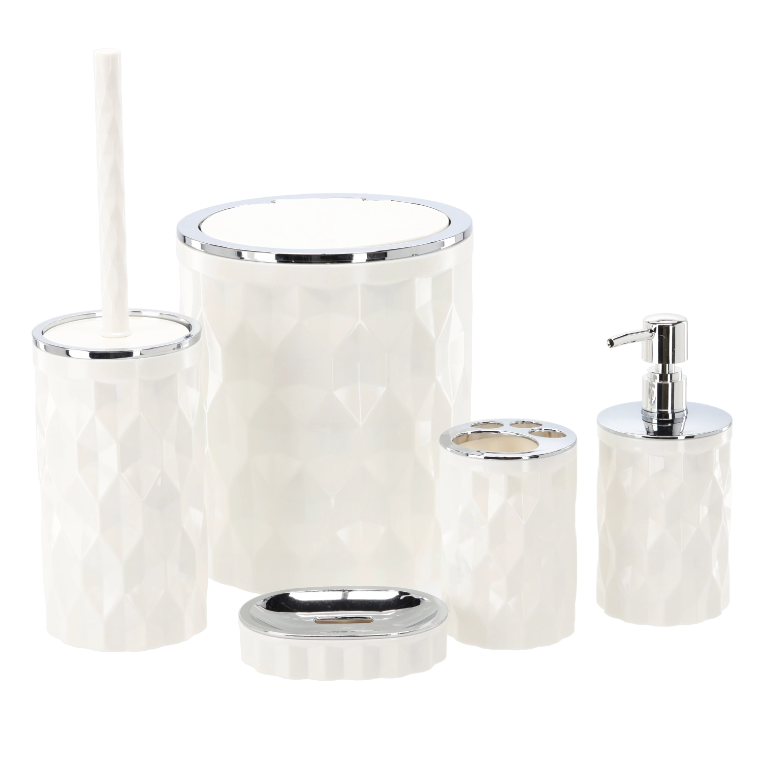 Cinci accesorii de bază într-un design unitar: coș, perie WC, dispenser de săpun, suport pentru periuțe și savonieră. Start ideal pentru orice baie.