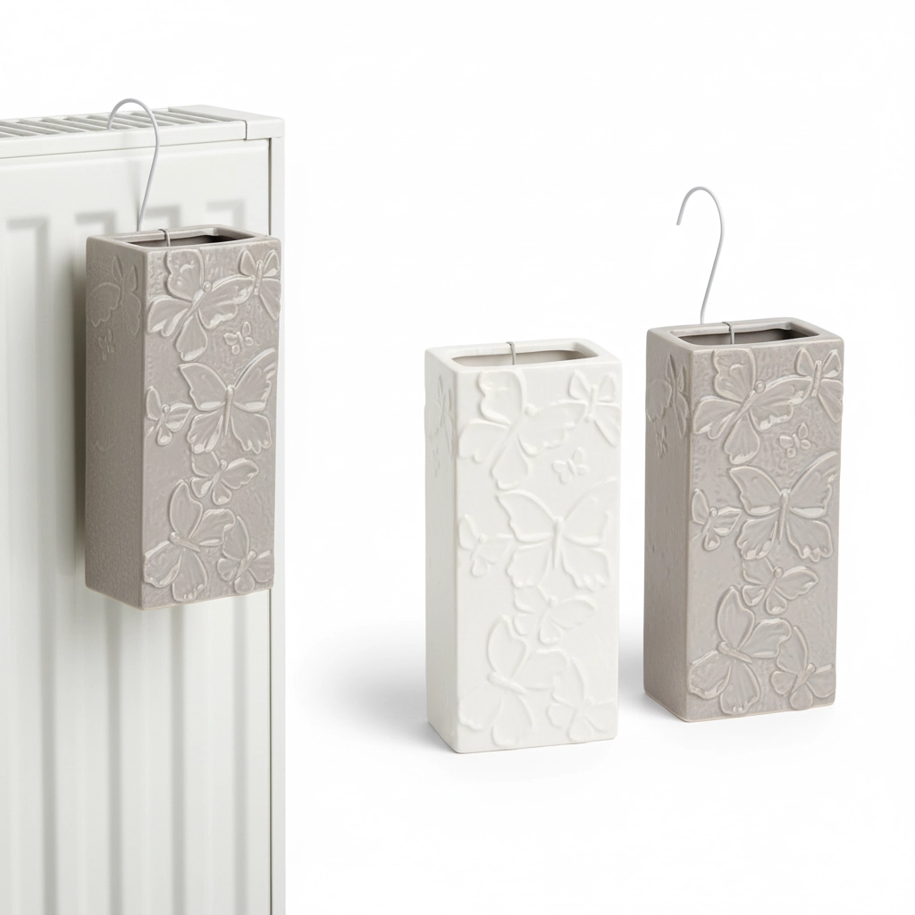 Creați un climat plăcut acasă cu umidificatoarele ceramice pentru calorifer, cu relief delicat de fluturi. Este suficient să le umpleți cu apă și să le agățați pe calorifer – căldura asigură evaporarea treptată și umidificarea naturală a aerului fără consum de electricitate, filtre sau zgomot. Setul de 6 bucăți acoperă mai multe camere din apartament sau casă.
