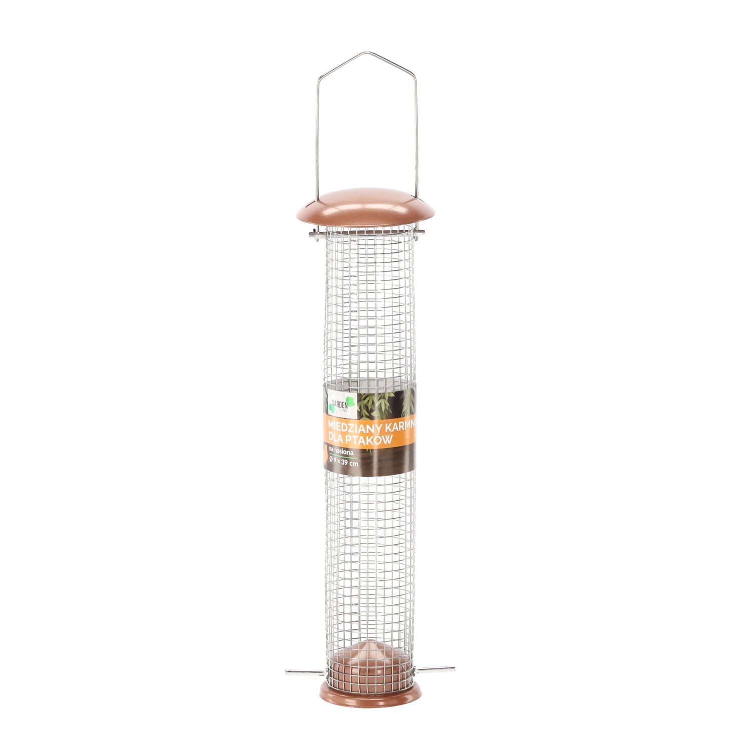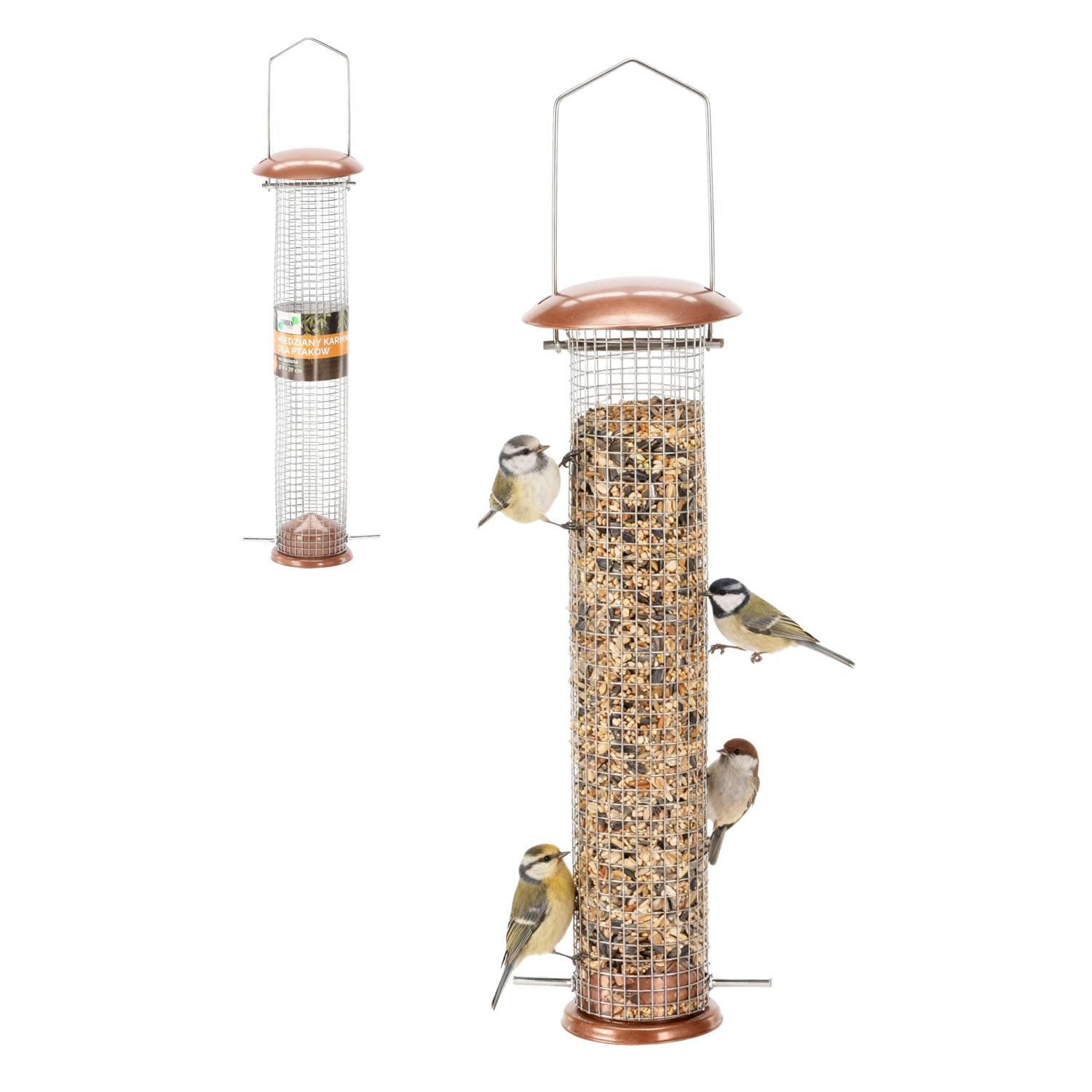 Acest hrănitor de păsări din cupru, în formă de tub, este conceput pentru hrănirea comodă a păsărilor mici pe tot parcursul anului. Corpul metalic și plasa de sârmă permit accesul fluent la semințe și, în același timp, păstrează conținutul bine ventilat. Datorită cârligului practic pentru agățare, îl puteți poziționa cu ușurință pe o ramură, pe un cui sau pe balustrada balconului.