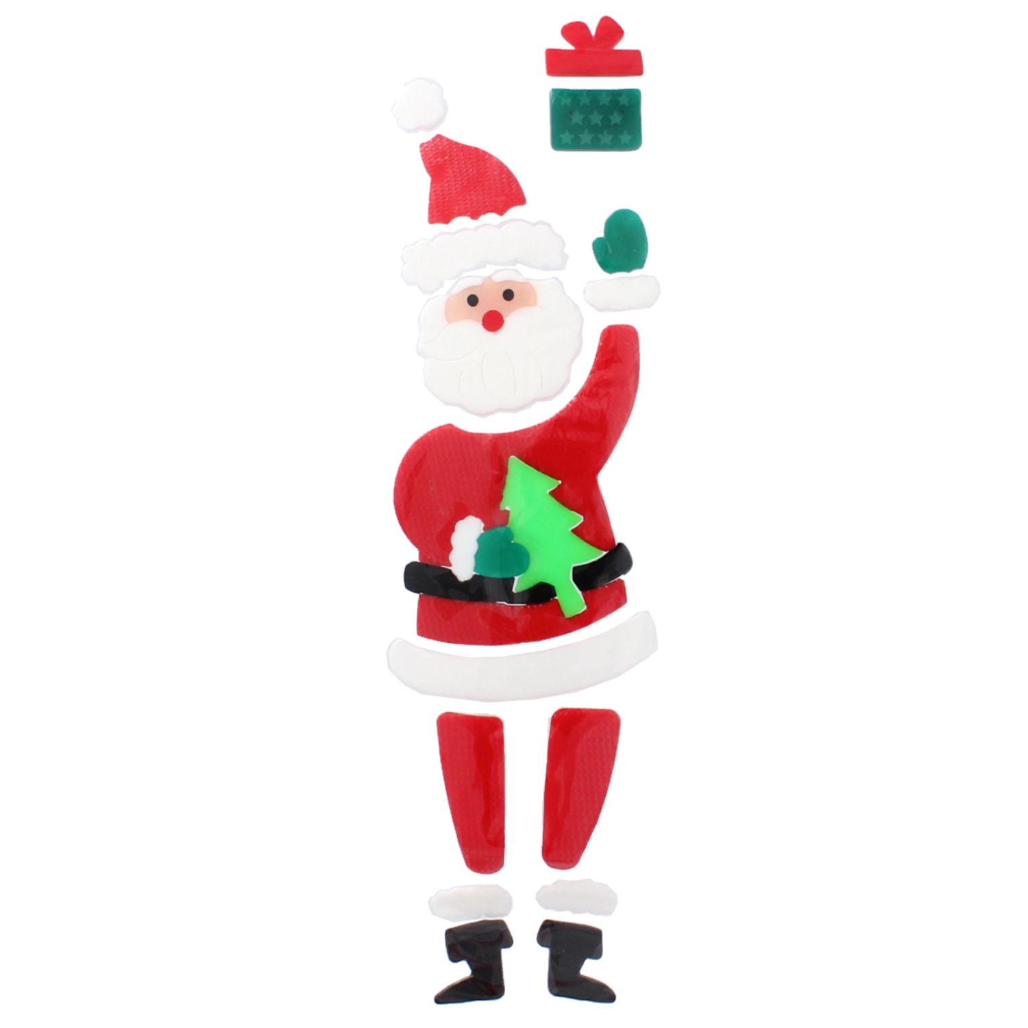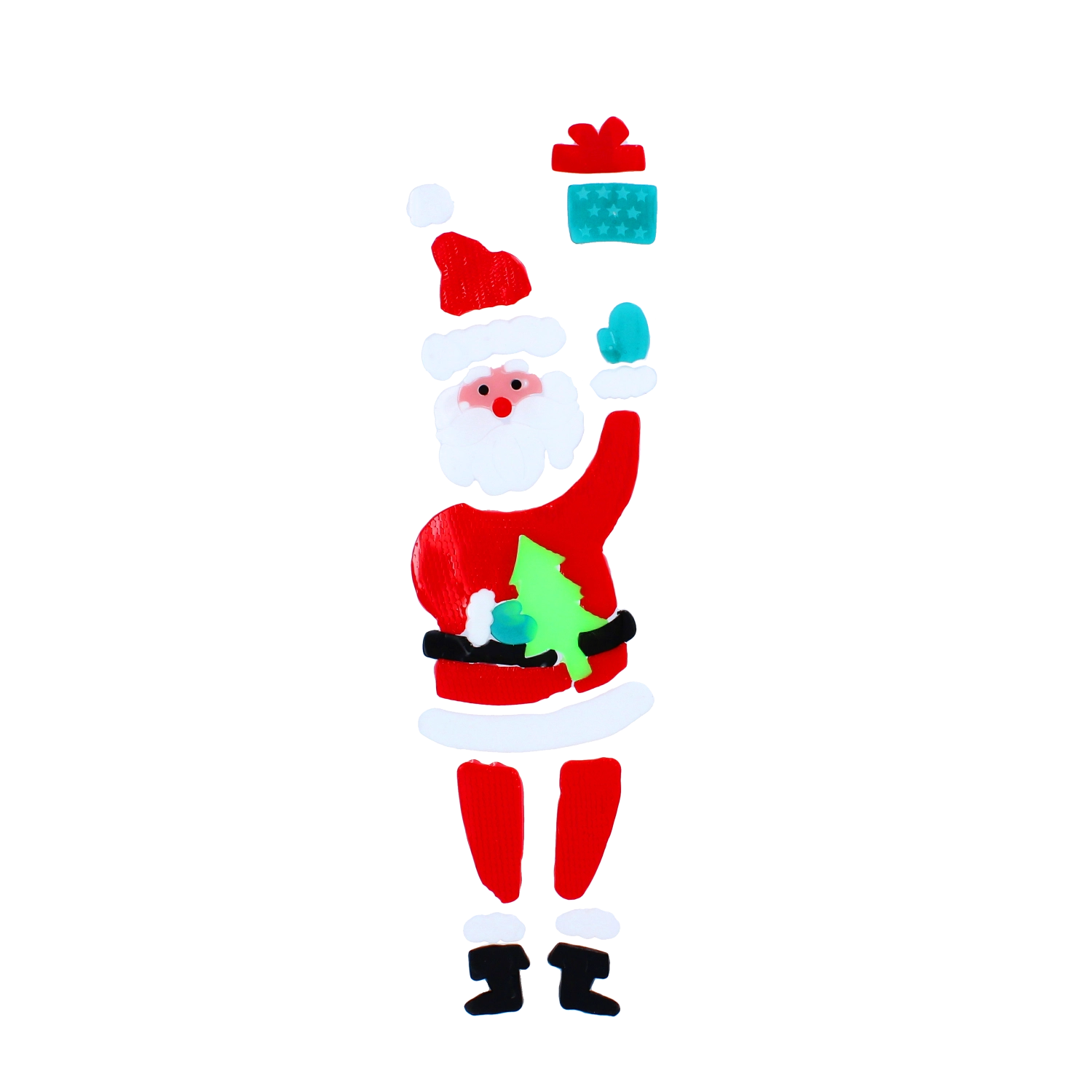Motivul segmentat cu MOȘ CRĂCIUN și cadou se așază ușor pe geam și se poate rearanja oricând – fără adeziv și fără urme.