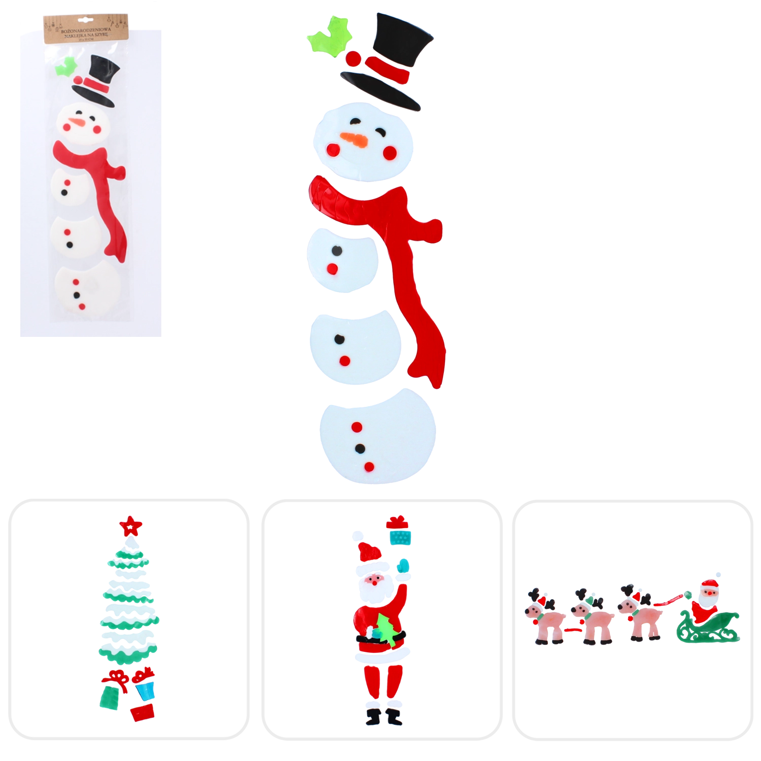 Setul cu patru designuri vă permite să combinați motivele după preferințe: MOȘ CRĂCIUN iconic, omul de zăpadă cu fular și pălărie, brăduțul de Crăciun cu stea și sania cu reni. Piesele sunt segmentate, astfel încât le puteți aranja creativ și crea compoziții originale pe ferestre, vitrine sau în camerele copiilor.