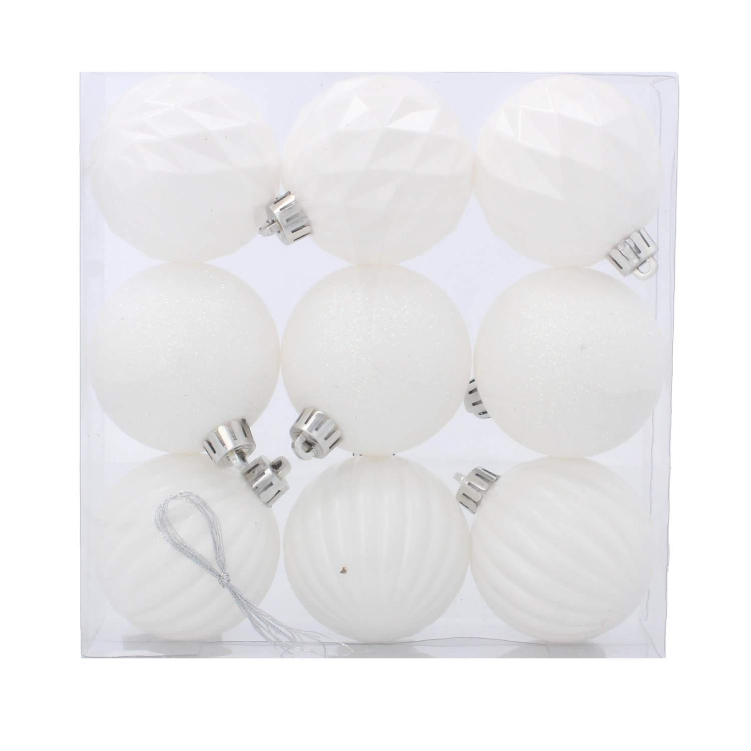 Set elegant de nouă globuri albe de Crăciun, cu diametrul de 6 cm, care adaugă bradului și interiorului tău o notă festivă. Combinația de suprafețe mate, lucioase și sclipitoare creează un ansamblu armonios, ușor de asortat cu alte decorațiuni. Plasticul ușor și rezistent asigură o utilizare sigură și neruperibilă în locuințele cu copii și animale de companie.