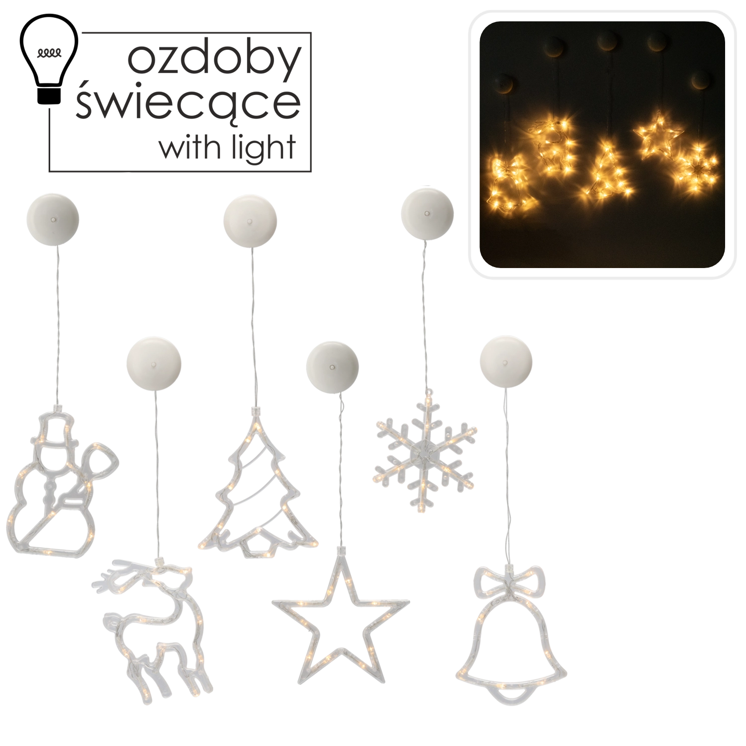 Decorațiunea este alimentată de 3× AAA, astfel încât o poți amplasa exact acolo unde ai nevoie. Cablul transparent și designul discret pun în evidență motivul în sine – brad, ren, clopoțel, stea, fulg de zăpadă sau om de zăpadă. Ventuza aderă fiabil pe suprafețe netede, ideal pe sticlă.