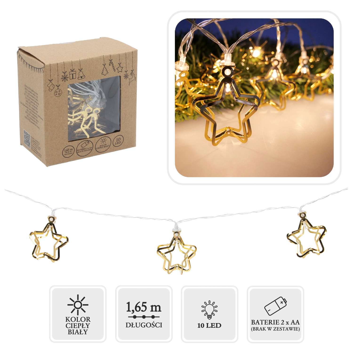 Adu farmecul sărbătorilor în casa ta cu un șir LED stilat, cu stele metalice aurii 3D. Lumina alb cald creează o atmosferă primitoare, iar datorită alimentării pe baterii (2× AA) îl poți așeza oriunde fără cabluri – pe masă, comodă, șemineu sau coroniță.