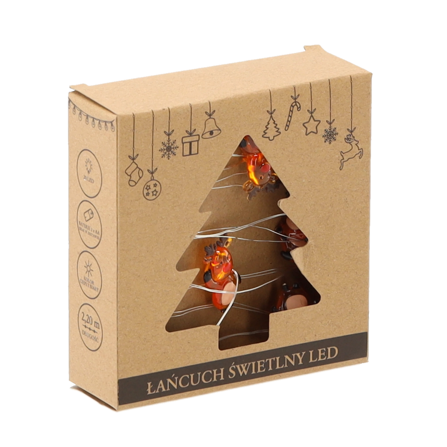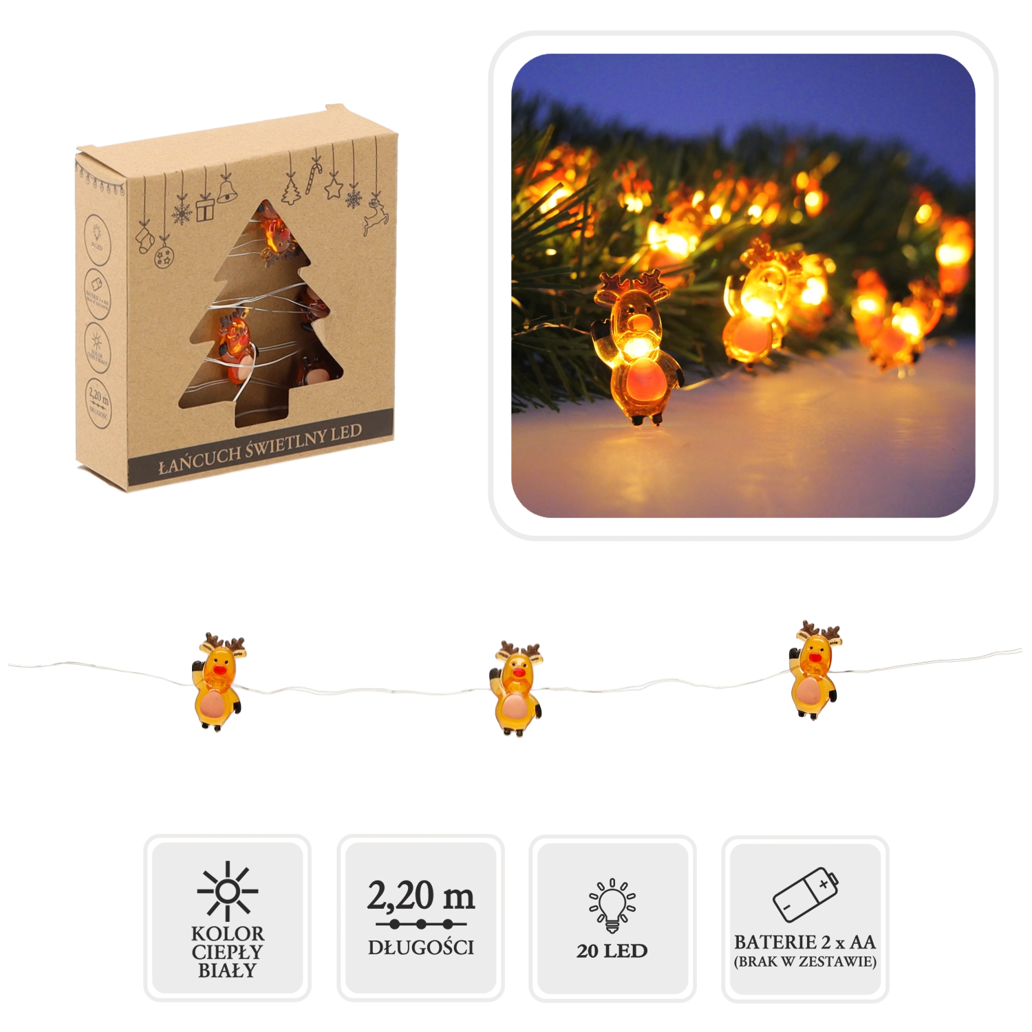 Adu în casă farmecul Crăciunului cu un șir luminos decorat cu căprioare drăgălașe. 20 de LED-uri calde creează o atmosferă primitoare, iar firul flexibil se înfășoară ușor în jurul decorațiunilor; alimentarea cu 2× AA permite amplasarea fără cabluri. Ideal pentru fereastră, polița șemineului, coroniță sau camera copiilor.