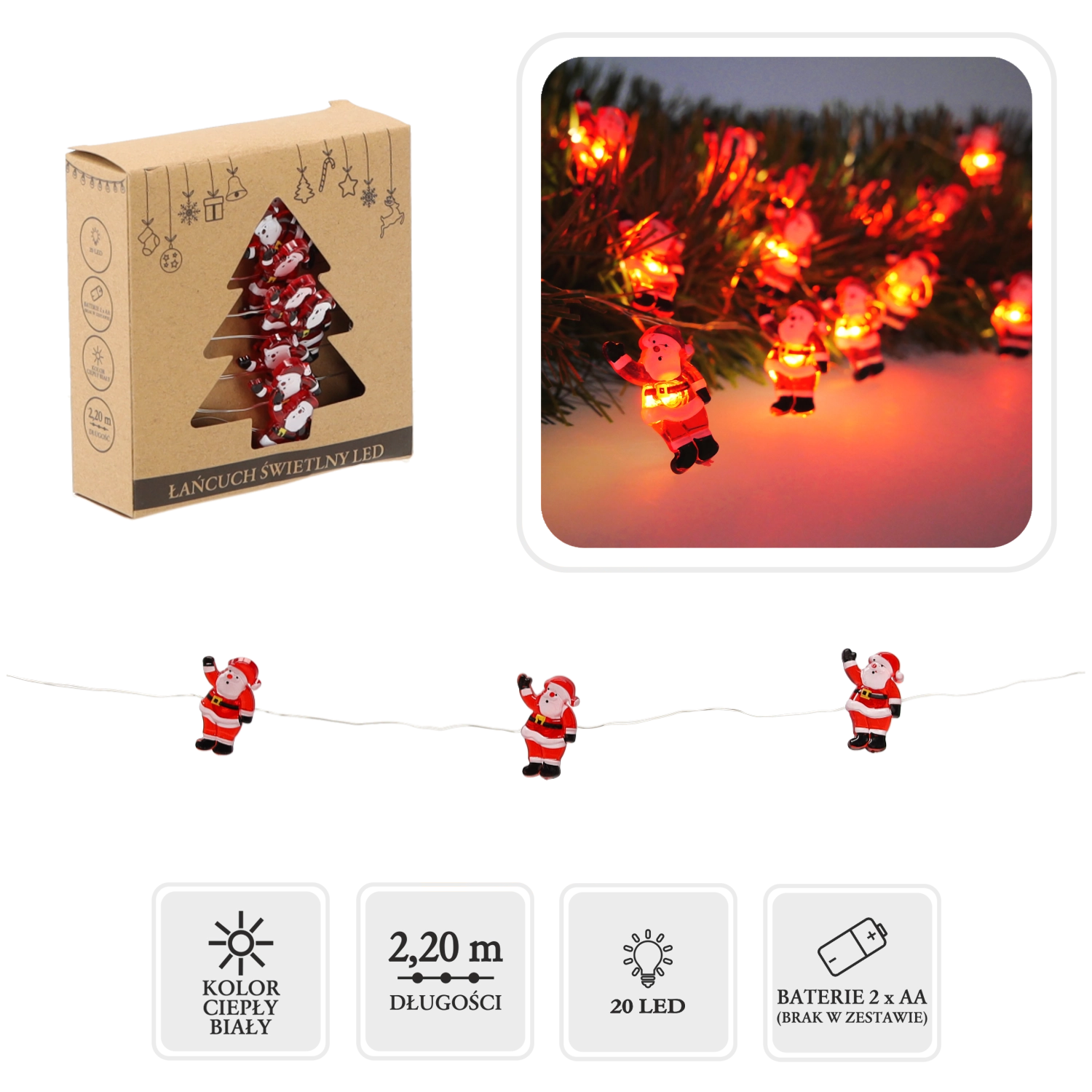 Ghirlanda luminoasă de Crăciun cu MOȘ CRĂCIUN este o decorațiune jucăușă care aduce instantaneu în interior o atmosferă plăcută și călduroasă. Fiecare LED este acoperit de un motiv drăguț cu Moș Crăciun, care arată minunat pe crengile bradului, pe polița șemineului sau în camera copiilor.