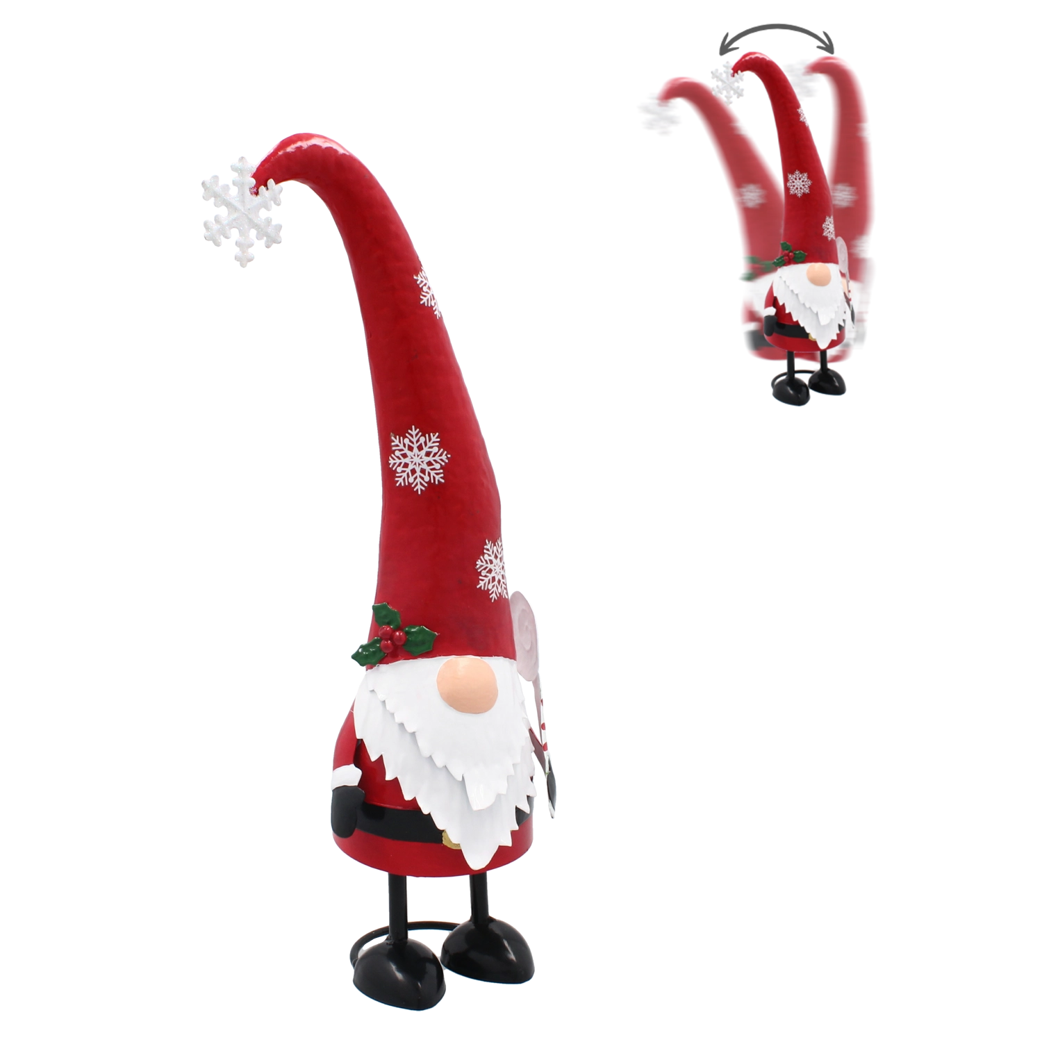 Elegantul spiriduș de Crăciun din metal cu căciulă lungă îți va lumina casa și va aduce în ea farmecul Sărbătorilor. Datorită execuției de calitate, construcției metalice stabile și combinației stilate de roșu și argintiu, devine o decorațiune festivă de neignorat pe raft, pervaz sau masă.