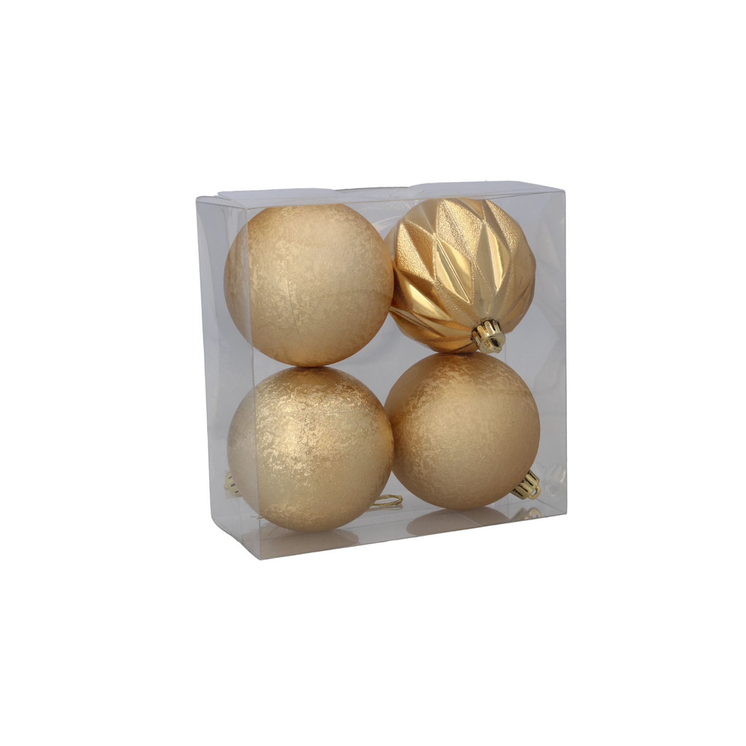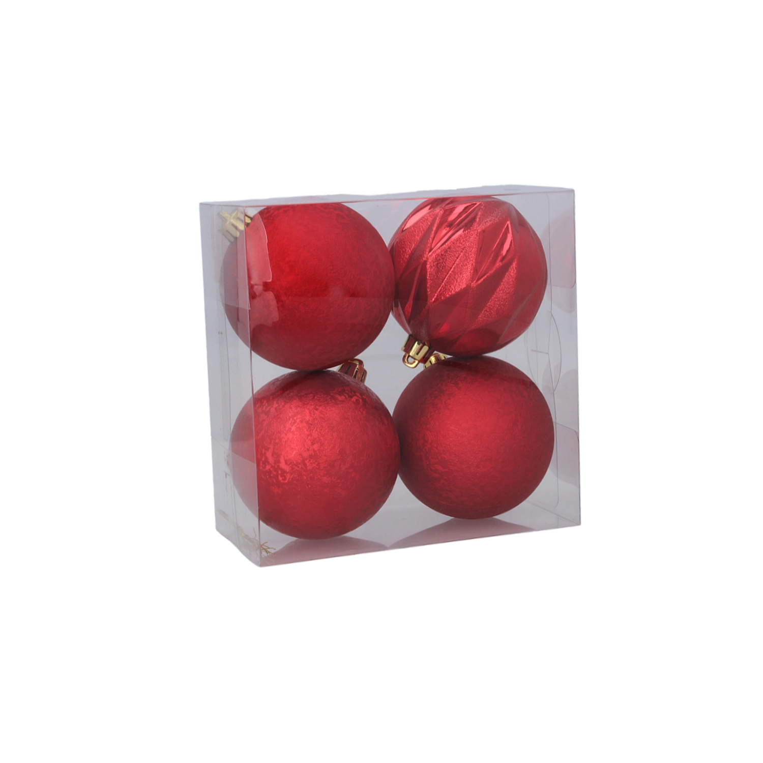 Acest set elegant de patru globuri de Crăciun din plastic aduce o combinație armonioasă de roșu, auriu și argintiu. Fiecare glob are o finisare diferită – de la mată și fin texturată până la lucioasă și fațetată – creând un aspect dinamic, dar echilibrat și de bun gust în bradul tău.