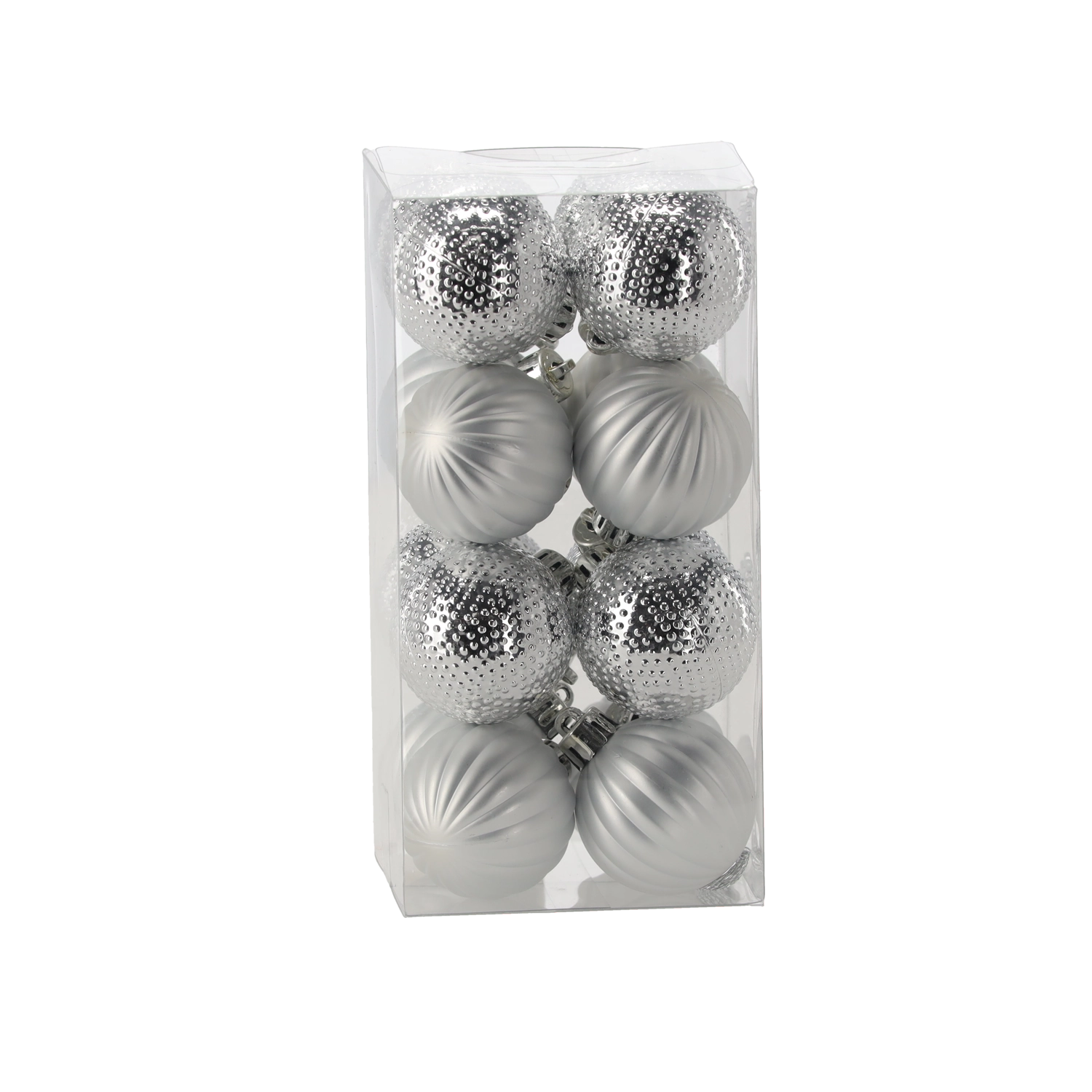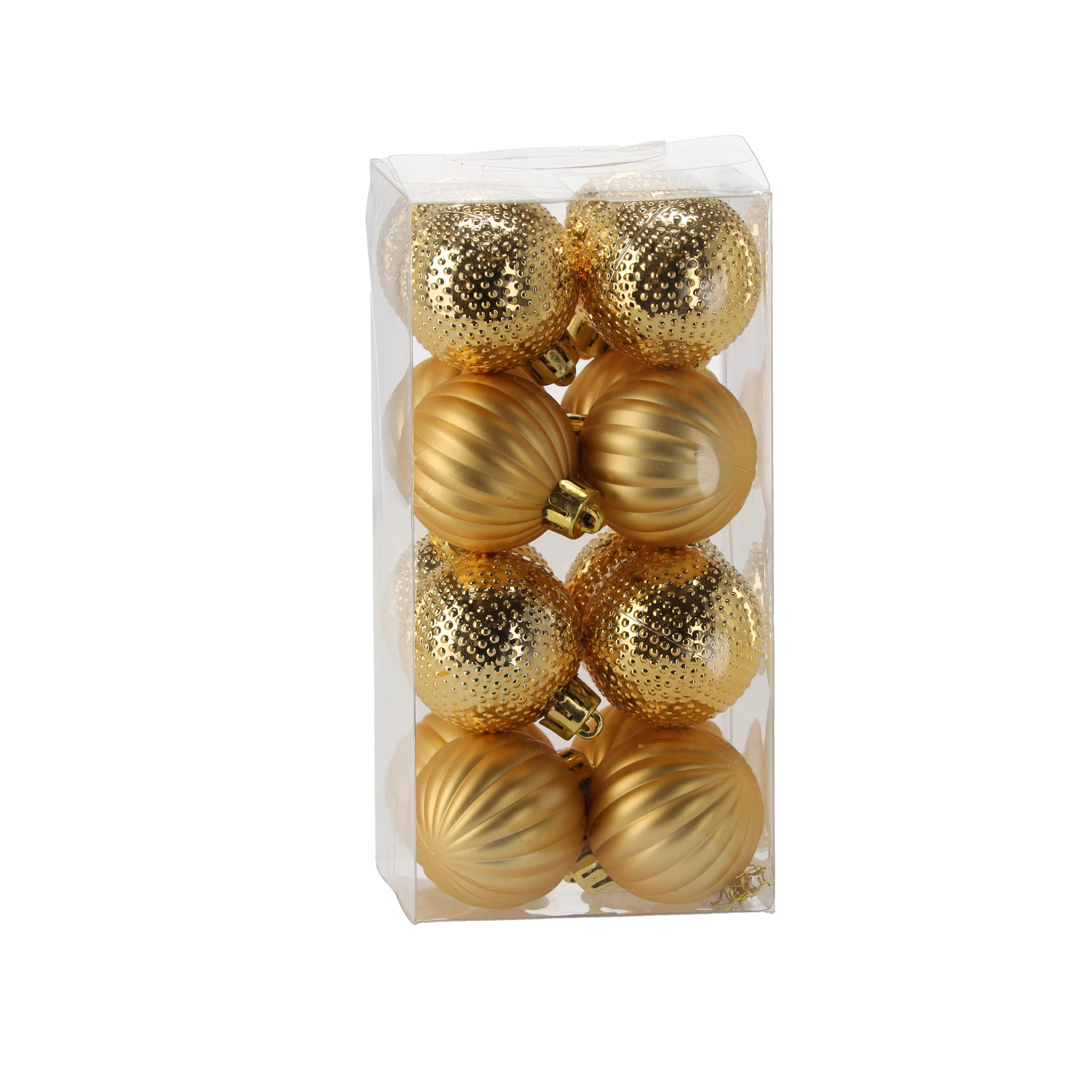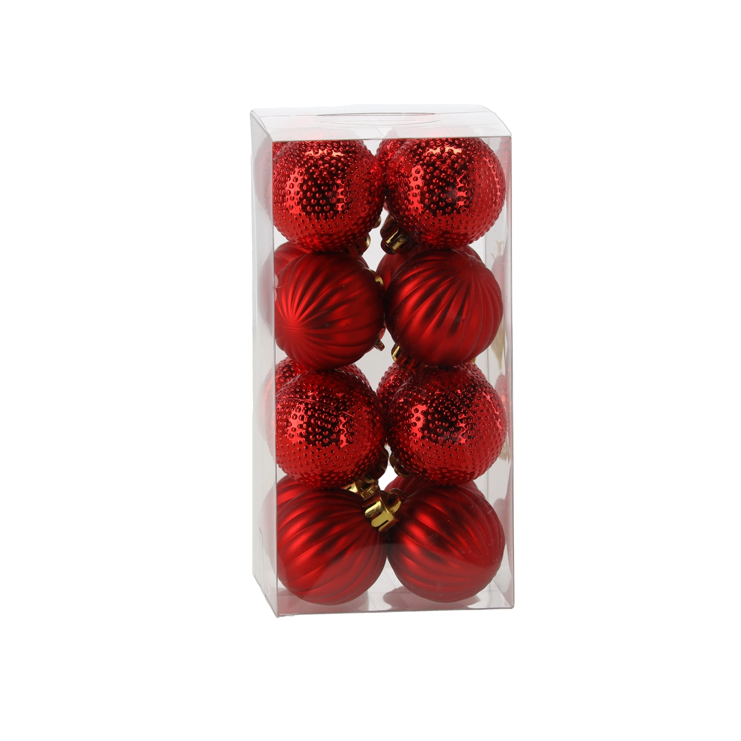 Set elegant de 16 globuri de Crăciun cu diametrul de 4 cm, într-o combinație de culori roșu, auriu și argintiu. Diferitele finisaje lucioase și mate cu modele în relief oferă bradului profunzime, strălucire și o atmosferă festivă. Fabricate din plastic rezistent pentru o utilizare sigură și de durată.
