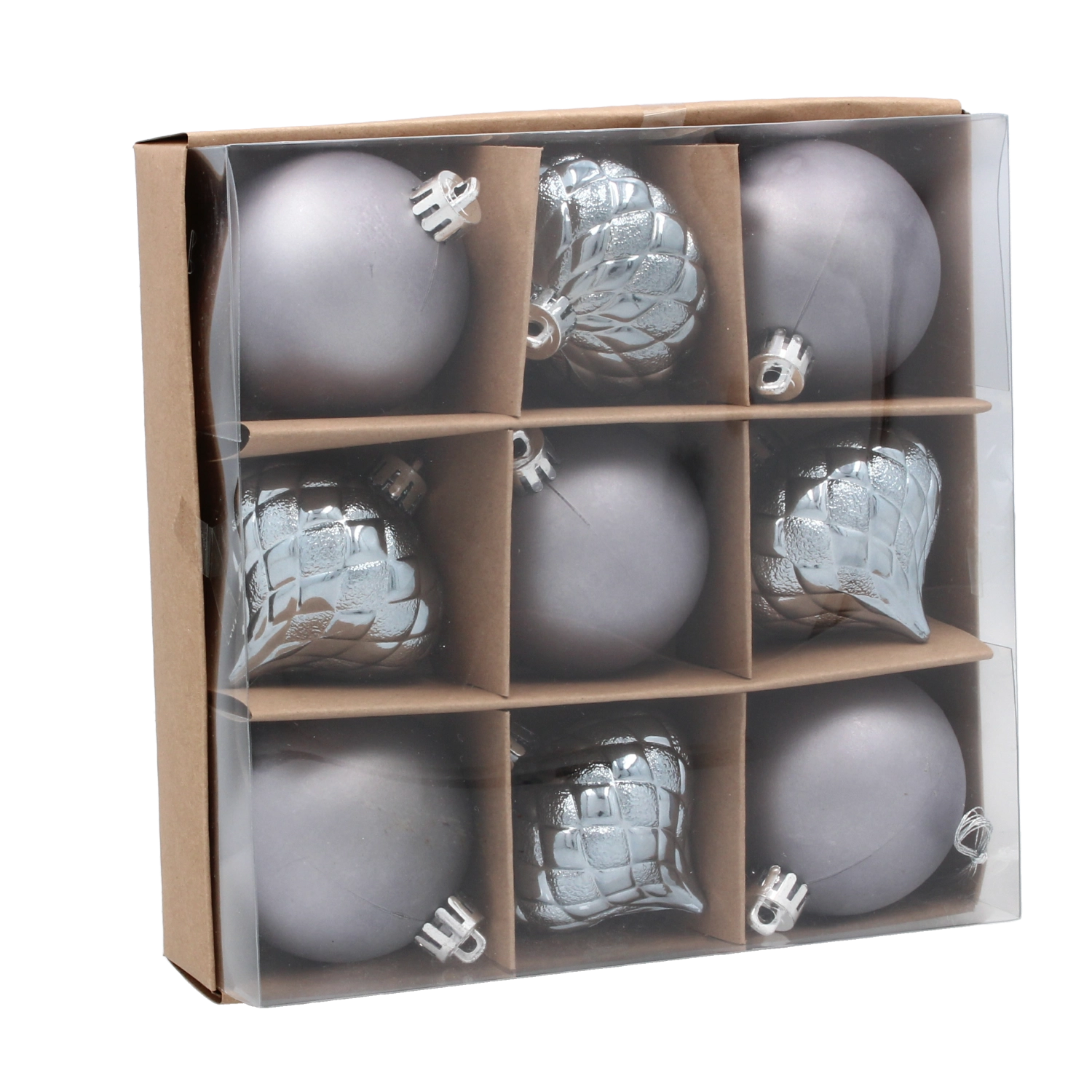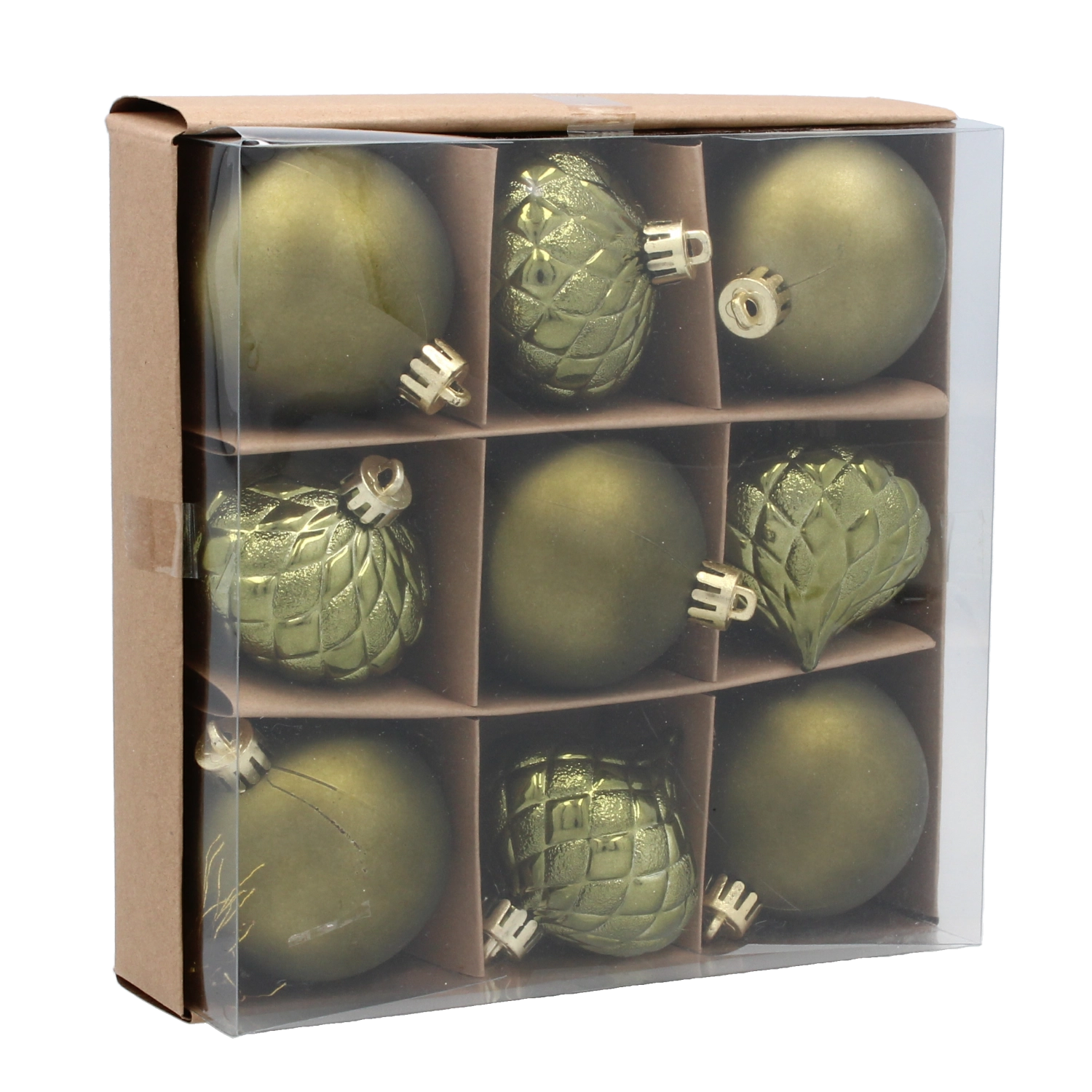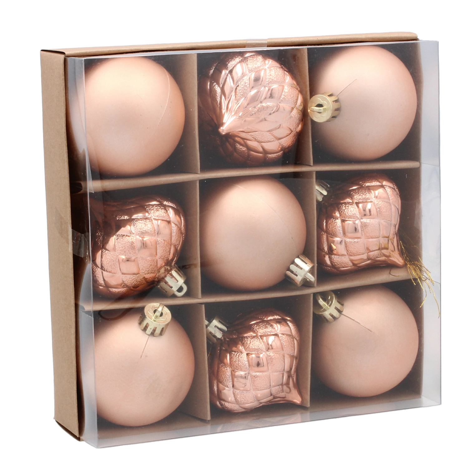 Adaugă bradului un luciu elegant cu setul de 9 globuri cu diametrul de 6 cm în nuanțe de măsliniu, cupru și grafit. Combinația de culori moderne și motive tradiționale creează un aspect sofisticat, iar plasticul durabil asigură o viață lungă și o utilizare în siguranță.