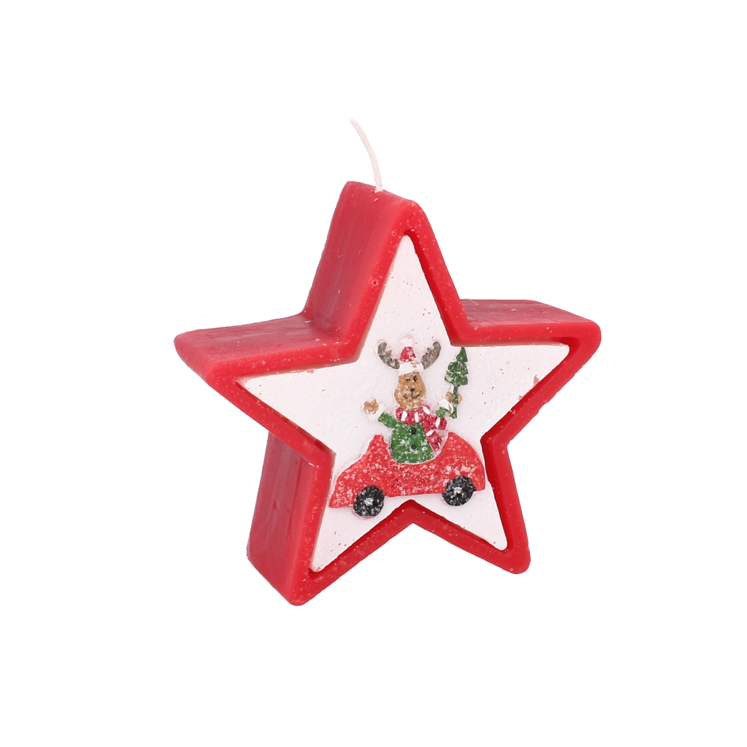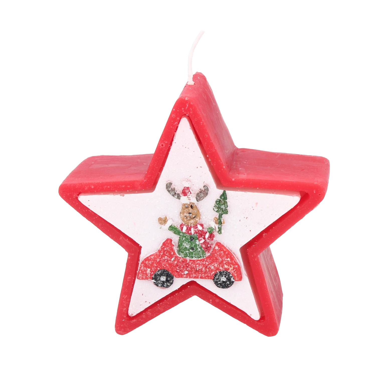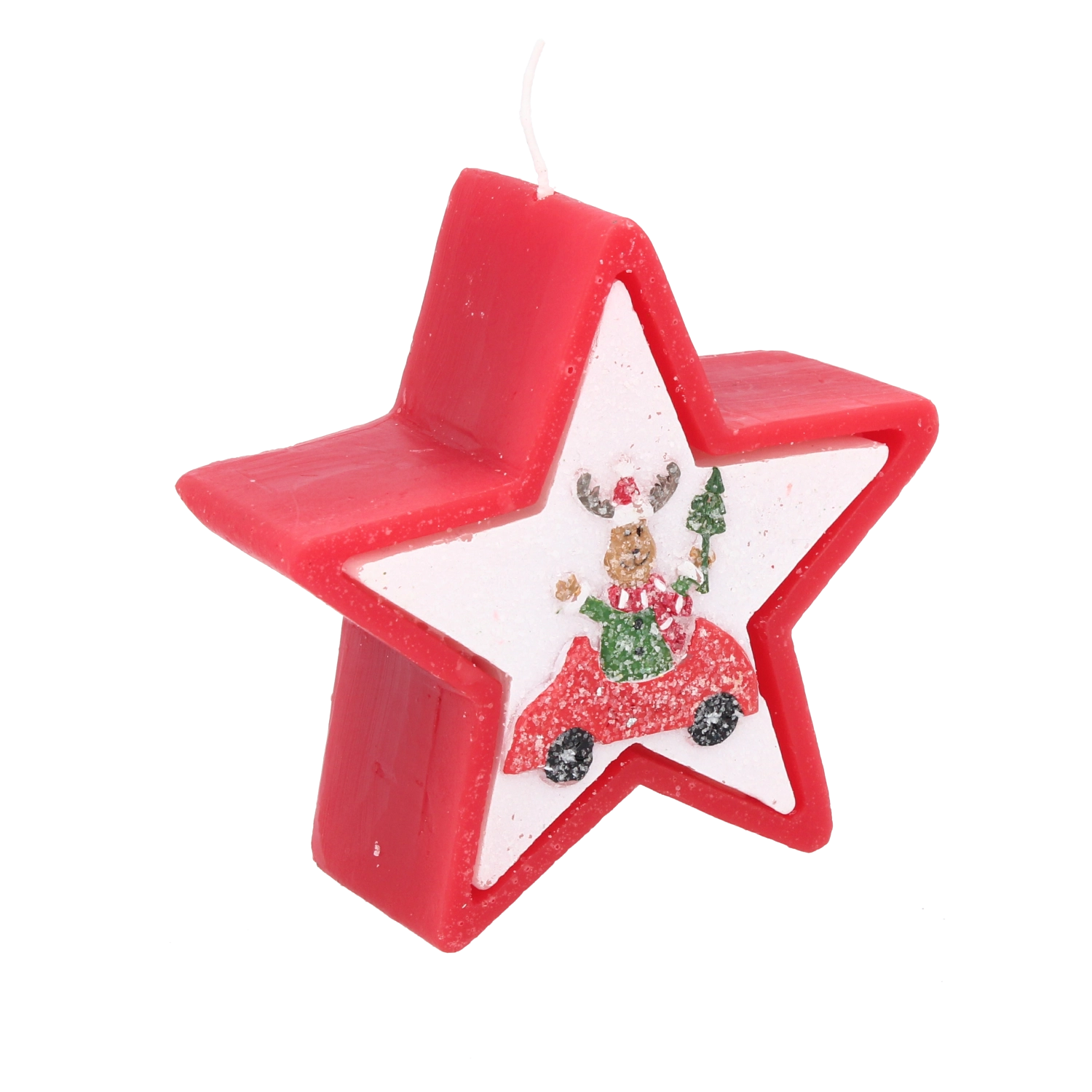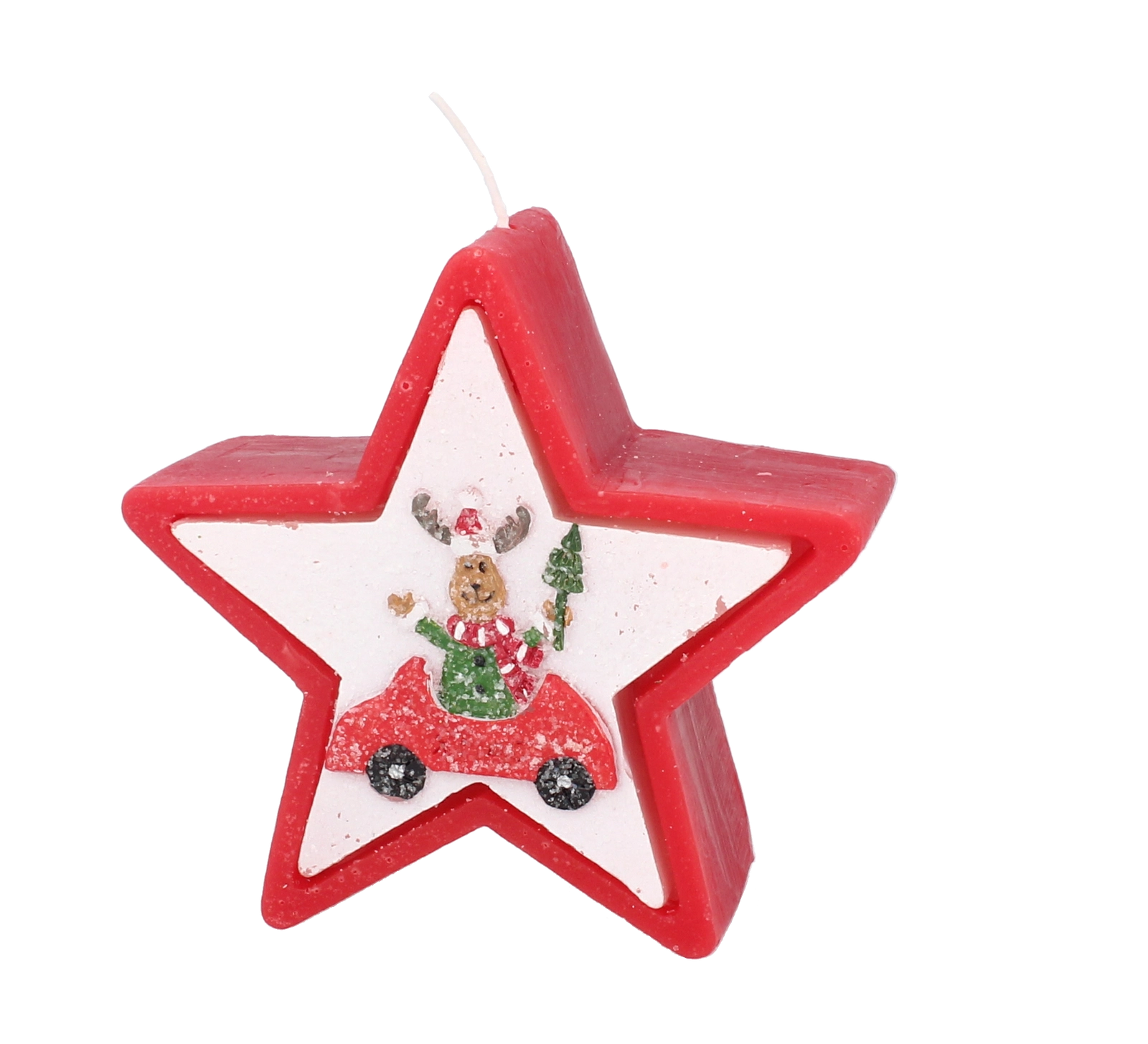 Această lumânare de Crăciun în forma elegantă de stea impresionează prin motivul vesel cu renul în mașină și creează instantaneu o atmosferă caldă de sărbătoare. Ceara de calitate asigură o ardere stabilă și uniformă, astfel încât să te bucuri de lumina ei mai mult timp.