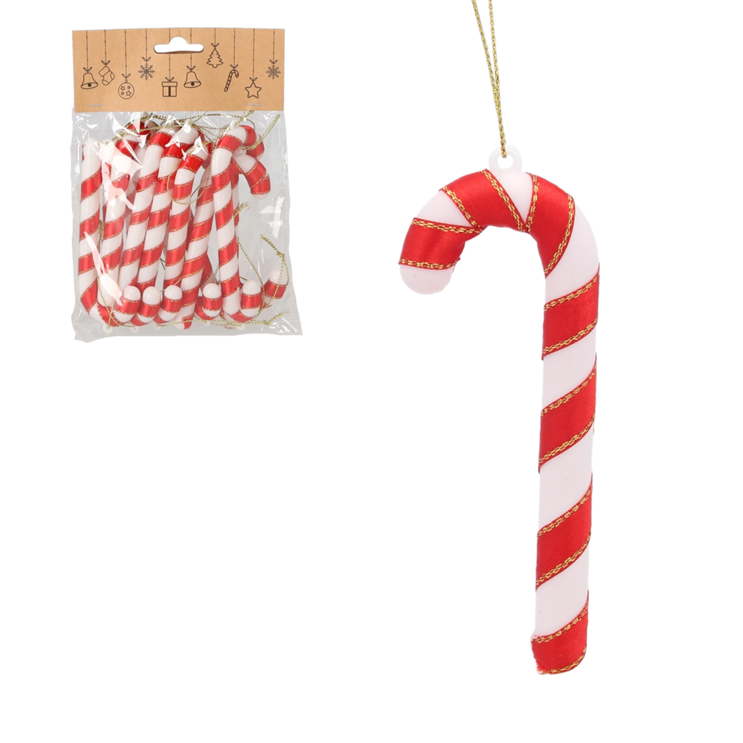 Creați acasă adevărata atmosferă de sărbătoare cu setul de 12 ornamente în formă de bastonaș de zahăr, cu lungimea de 12 cm. Plasticul rezistent garantează durabilitate îndelungată și utilizare repetată, iar dungile roșu-alb clasice oferă decorațiunii un farmec tradițional. Datorită utilizării universale, le puteți agăța cu ușurință pe brad, ghirlande și coroane – comod, cu ajutorul șnurulețelor incluse.