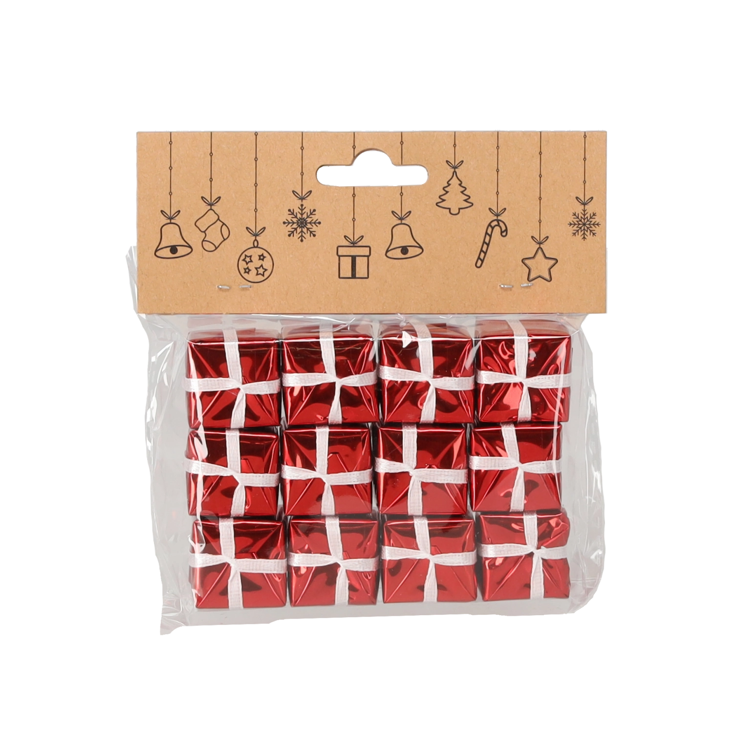 Adaugă casei tale farmecul Crăciunului cu un set de 12 ornamente mici în formă de cadouri, cu dimensiunea de 2,5 cm. Aceste decorațiuni ușoare se agăță cu ușurință pe bradul de Crăciun, ghirlande sau coroane și subliniază perfect atmosfera festivă. Datorită designului universal, le poți combina cu decorațiuni tradiționale sau moderne.