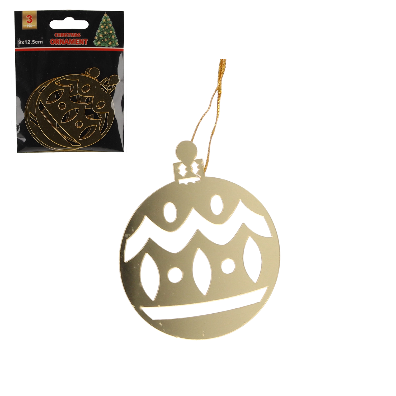 Oferă bradului tău un luciu clasic și eleganță cu setul de trei biluțe de Crăciun aurii cu dimensiunile de 8 × 6 cm. Suprafața lucioasă reflectă frumos lumina, decupajele creează un joc impresionant de umbre, iar ochiul practic asigură agățare ușoară. Materialul rezistent garantează durată lungă de viață și utilizare fără griji.