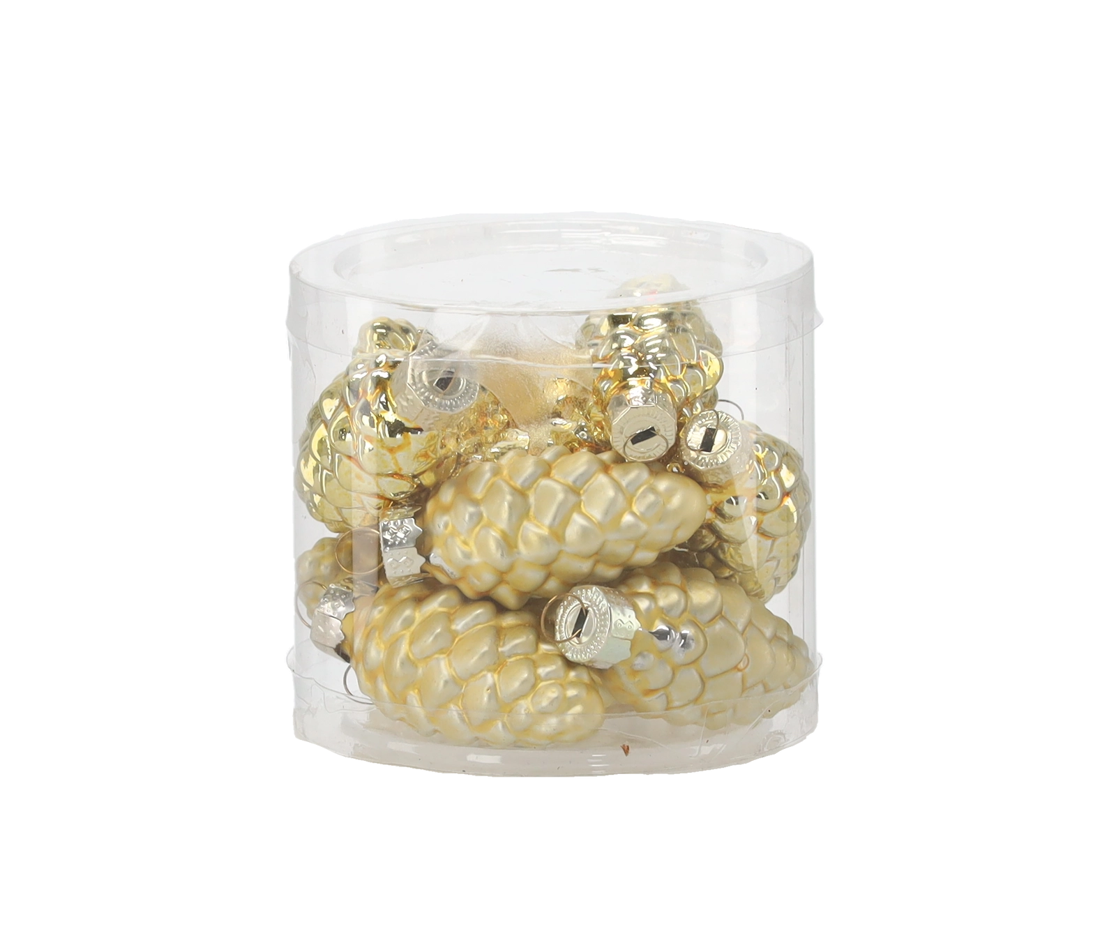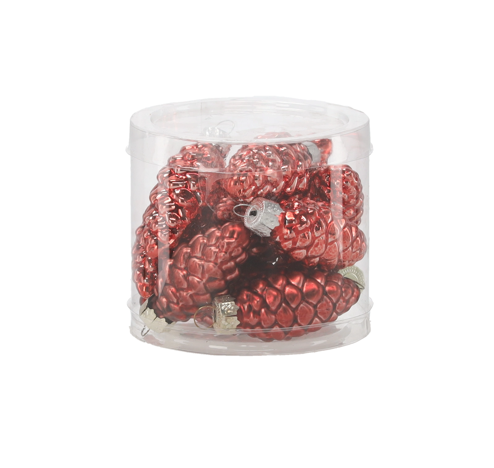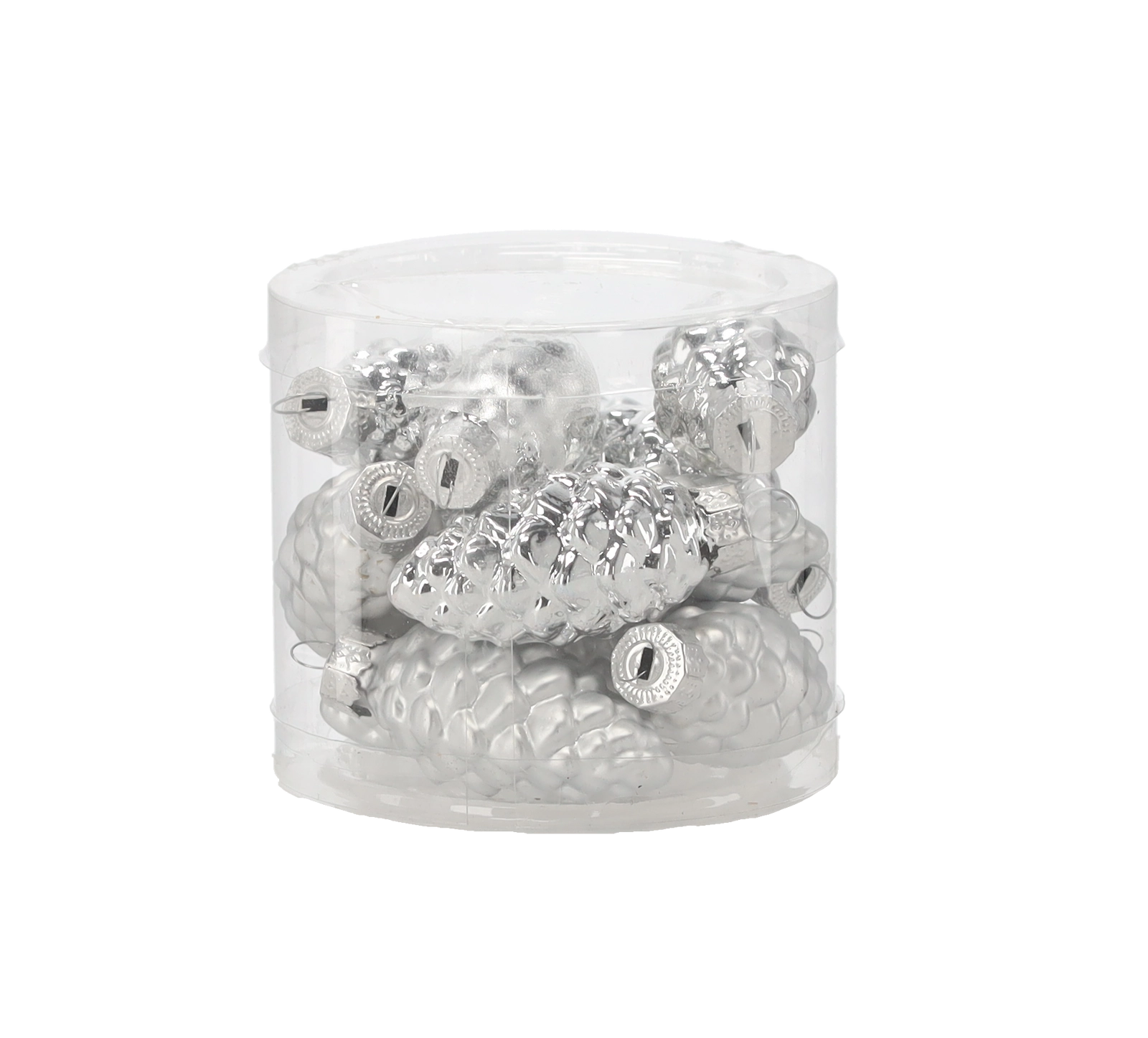 Acest set atemporal de conuri din sticlă se potrivește ușor atât cu decorațiuni tradiționale, cât și moderne. Suprafața precis texturată imită fidel conurile naturale și arată deosebit atât pe verdele acelor, cât și în aranjamente decorative pe coroane sau ghirlande.