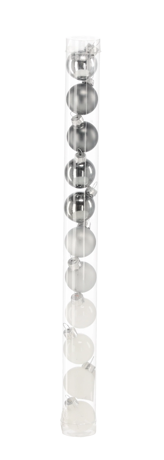 Set elegant cu 11 ornamente din sticlă, cu diametrul de 3 cm, în combinație de alb și argintiu, care oferă bradului un aspect modern și sofisticat. Mixul de finisaje lucioase, mate și transparente reflectă frumos lumina și creează un străluciu festiv delicat. Cutia tub practică facilitează depozitarea și oferirea cadou.