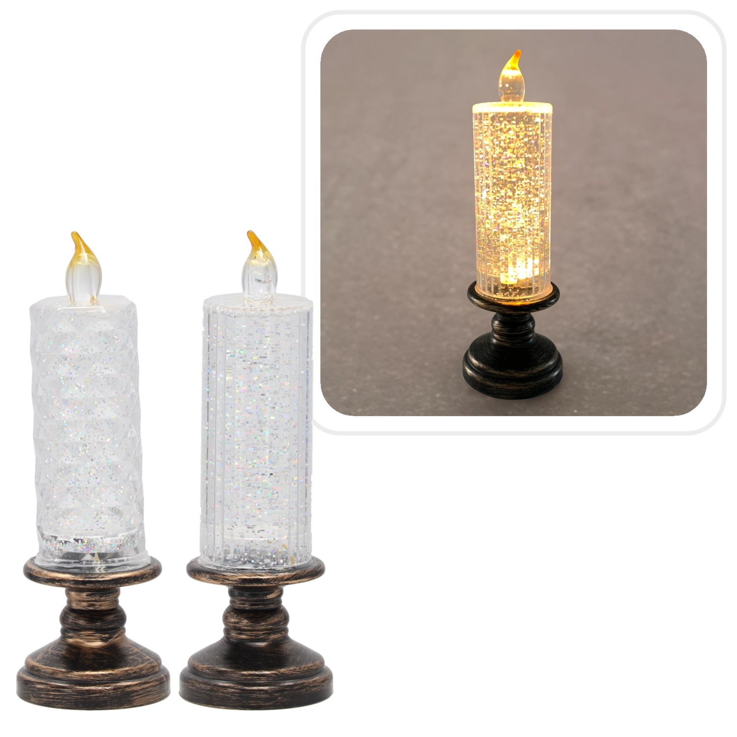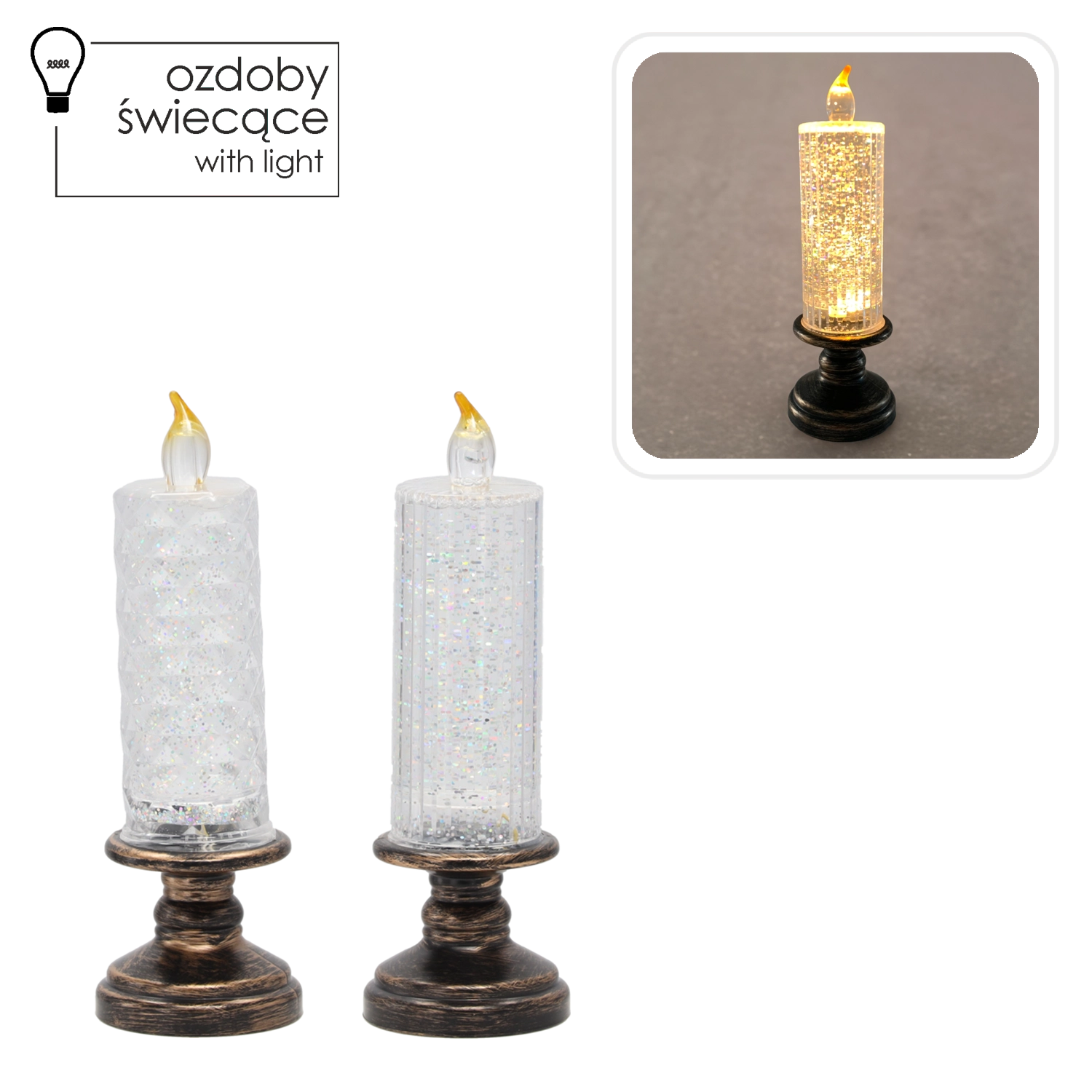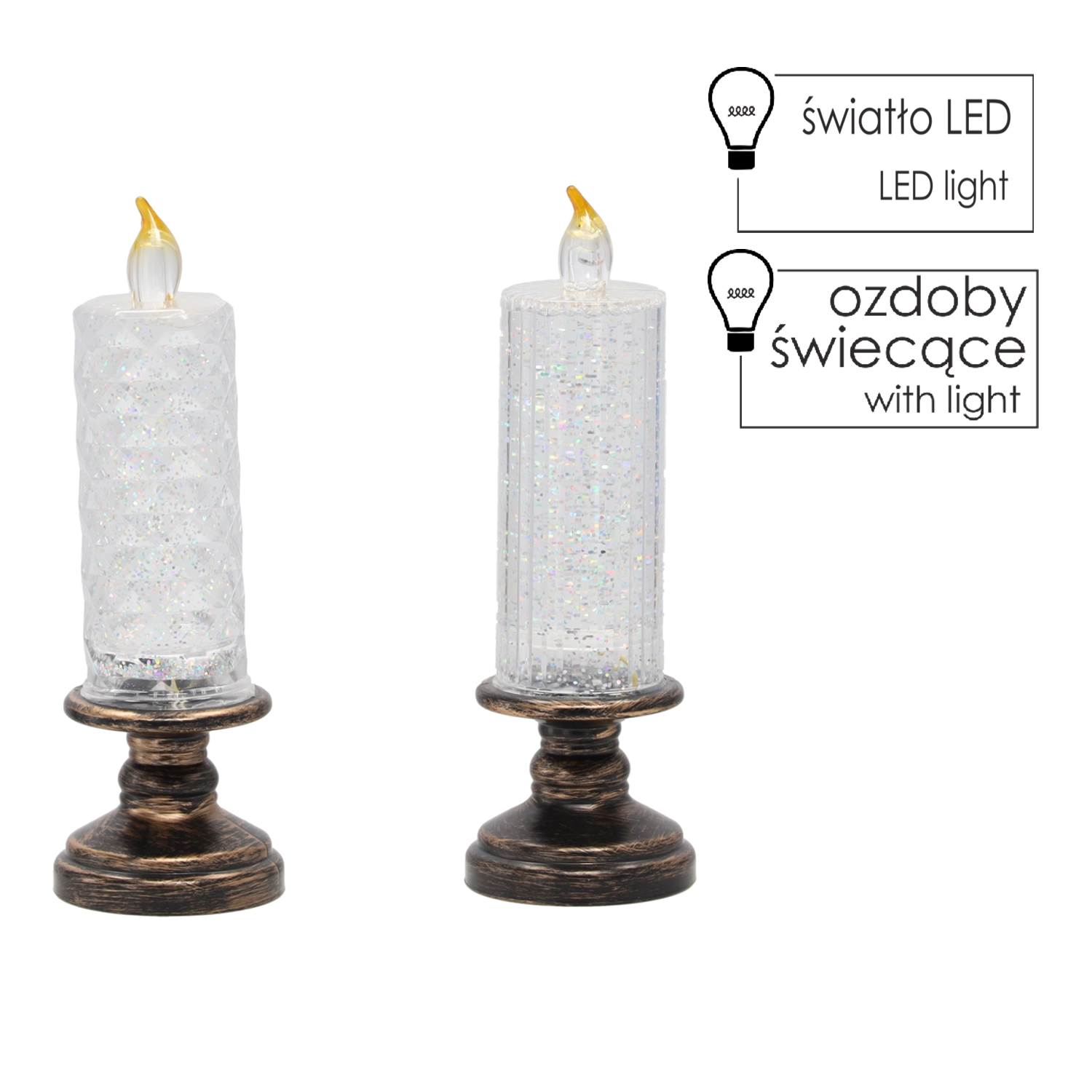Această lumânare LED elegantă combină aspectul unei lumânări clasice cu iluminarea LED modernă. Corpul transparent cu sclipici se aprinde la pornire și creează un efect încântător de scânteiere, adăugând interiorului un farmec festiv sau potrivit pe tot parcursul anului. Datorită dimensiunilor compacte, este ideală pentru decorarea mesei, rafturilor sau recepției.