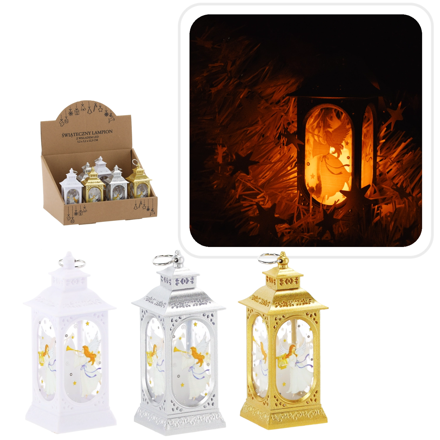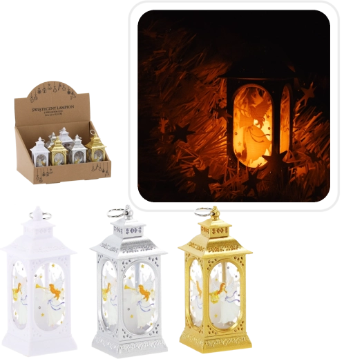 Decorațiunea este disponibilă în trei culori elegante – argintiu, auriu și alb – astfel încât o poți asorta ușor cu stilul tău de Crăciun. Datorită alimentării cu 1× baterie CR2032, poți amplasa lampionul oriunde, fără cabluri și prize.