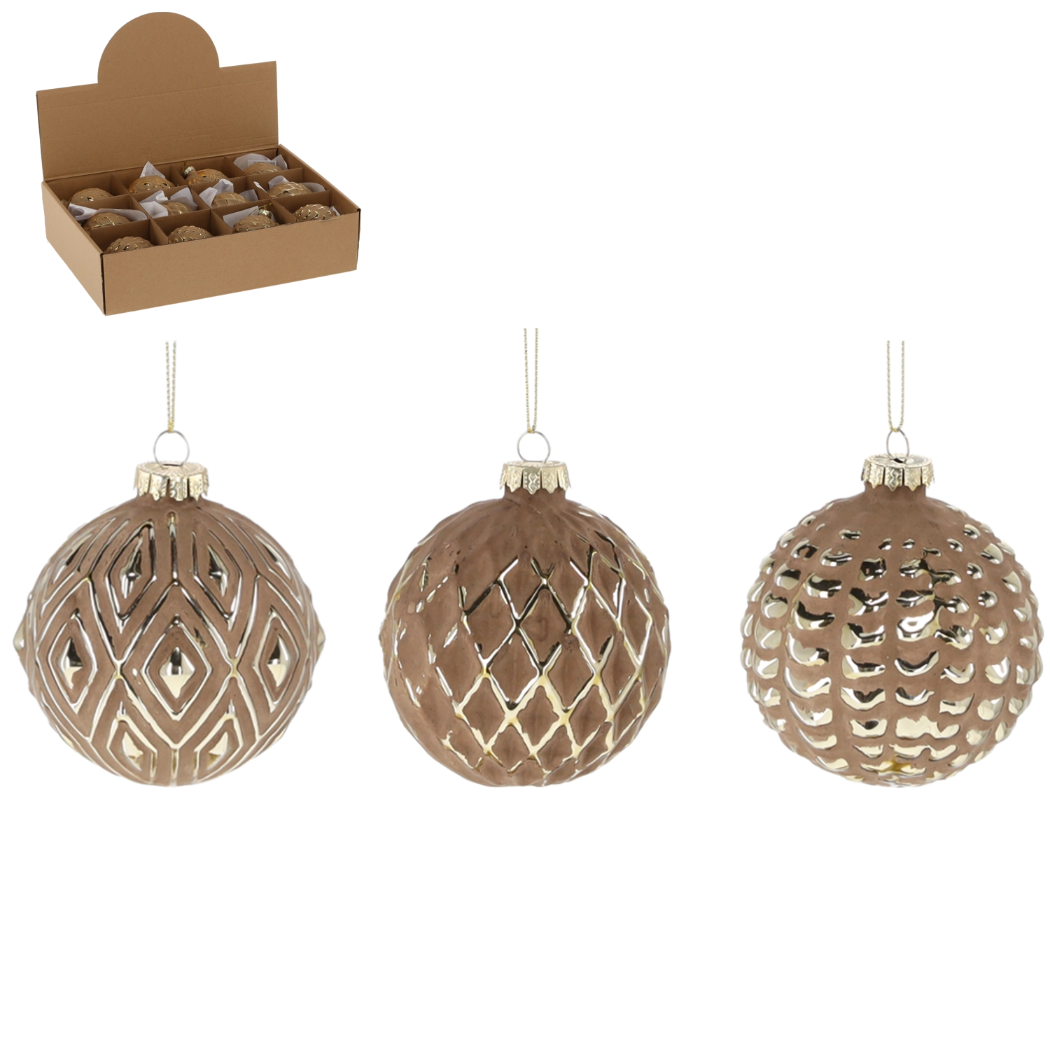 Globuri de Crăciun din sticlă elegante, cu diametrul de 8 cm, în culoare maro, cu ornamente aurii, care oferă decorațiunii tale un aspect luxos și sofisticat. Combinația dintre suprafața mată și detaliile lucioase creează un contrast impresionant care iese frumos în evidență pe brad. Setul conține 12 piese cu modele diferite, ușor de asortat cu alte decorațiuni pentru a crea o atmosferă armonioasă și primitoare de Crăciun.
