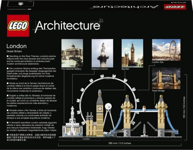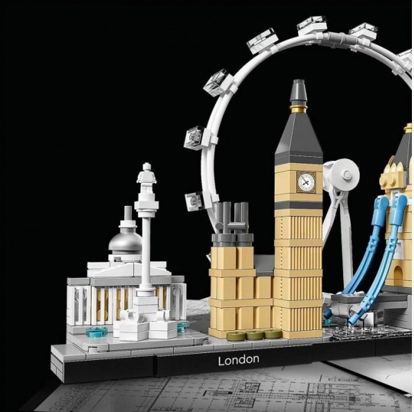 Setul din colecția LEGO Architecture Skyline redă fidel cele mai cunoscute repere londoneze în proporții și culori realiste. Pe un soclu elegant cu plăcuța decorativă „London” vei găsi National Gallery, coloana lui Nelson, London Eye, Big Ben (Elizabeth Tower) și podul Tower Bridge. Piesele transparente din bază reprezintă cursul râului Tamisa, astfel încât modelul arată excelent din orice unghi.