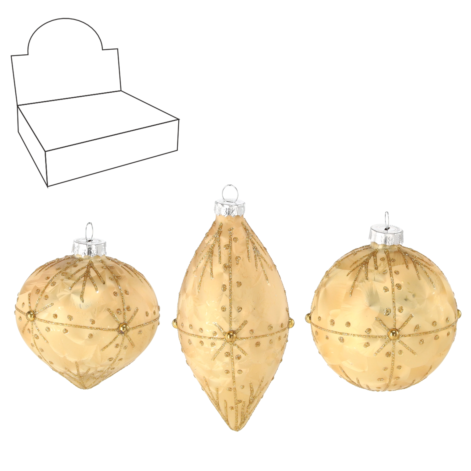 Creează un aspect armonios și stilat al bradului datorită combinației de globuri rotunde și ornamente alungite din sticlă, într-un auriu atemporal. Execuția precisă și decorul oferă reflexii frumoase ale luminii, care accentuează atmosfera caldă de Crăciun.