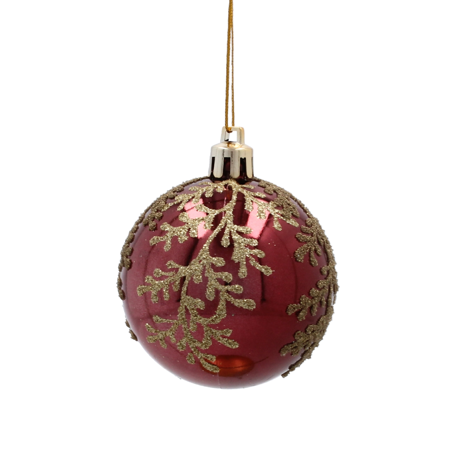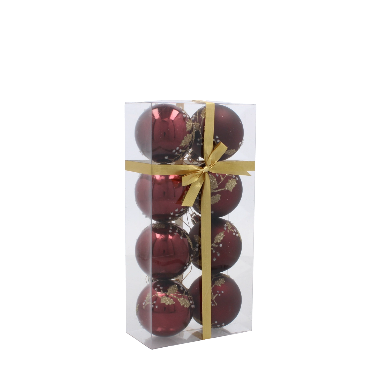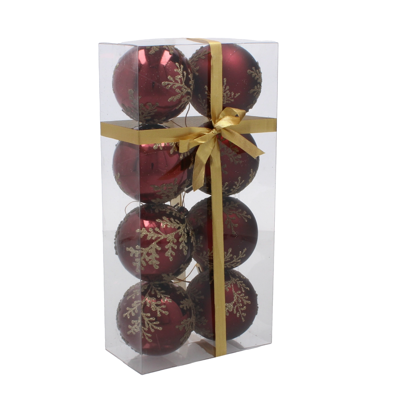 Acest set stilat de ornamente în nuanța profundă de burgund aduce un accent cald și festiv în orice interior. Delicatul motiv auriu cu frunze are un aer luxos și, în combinație cu finisajele mate și lucioase, creează un joc aparte de lumină pe ramurile bradului tău.