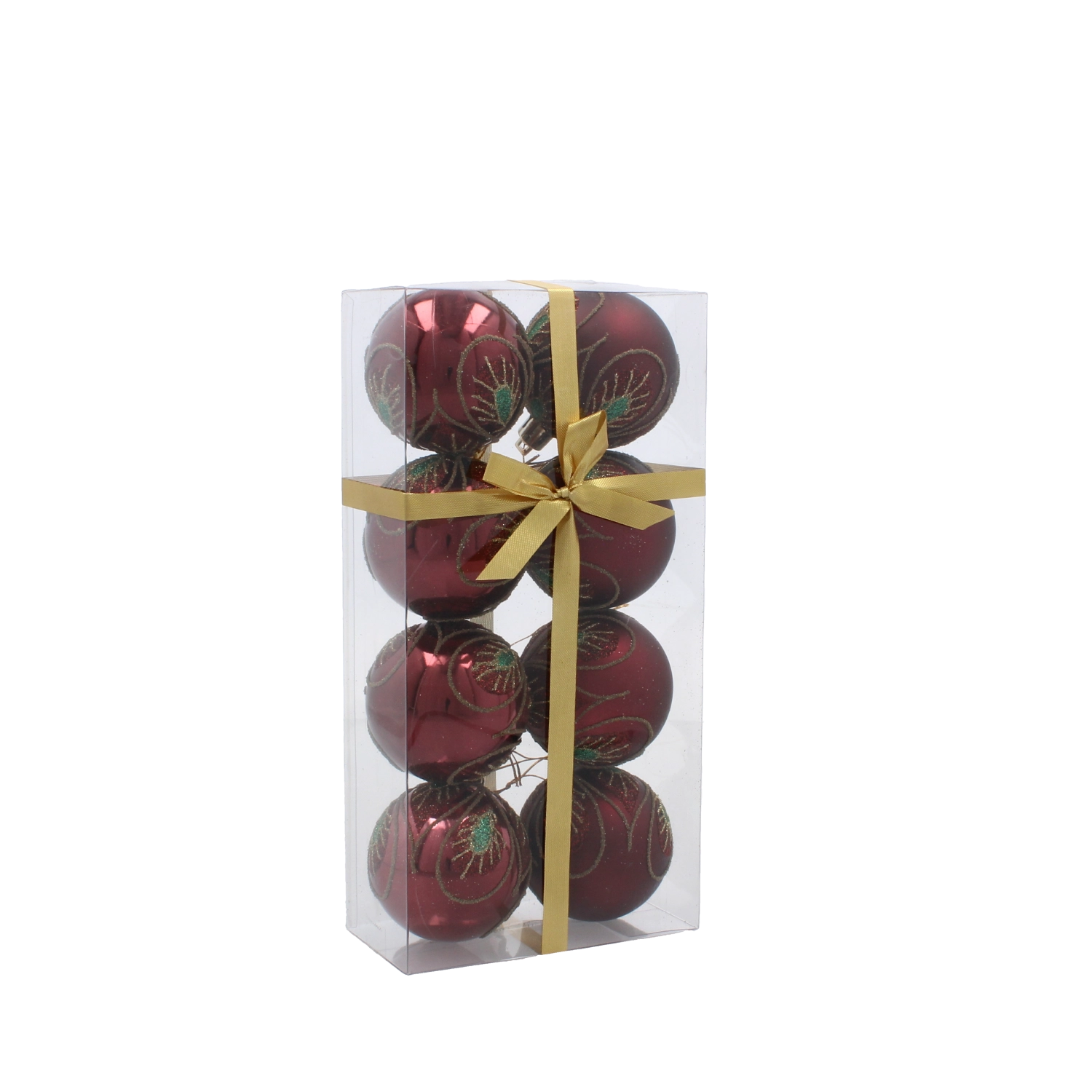 Opt globuri atent asortate, într-o cutie transparentă cu fundă, sunt pregătite pentru decorare instant sau ca un cadou stilat.