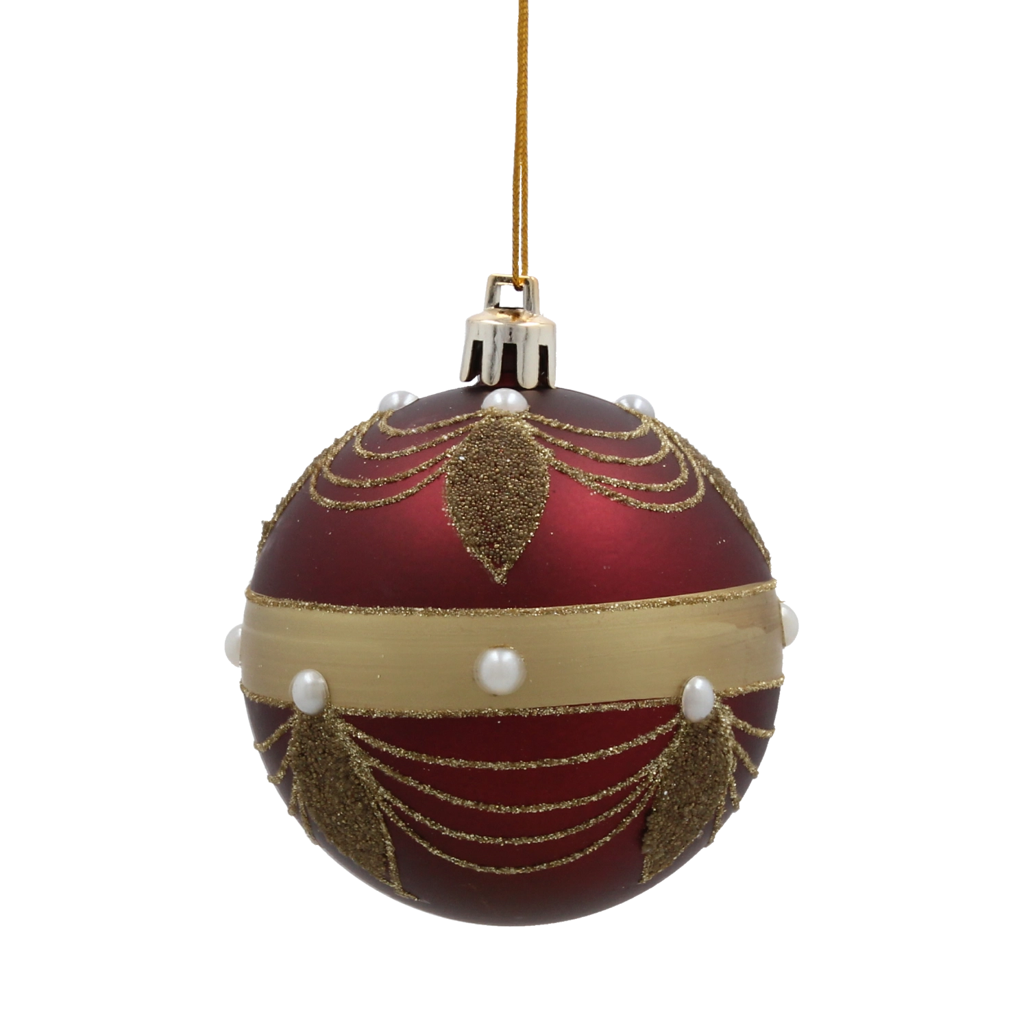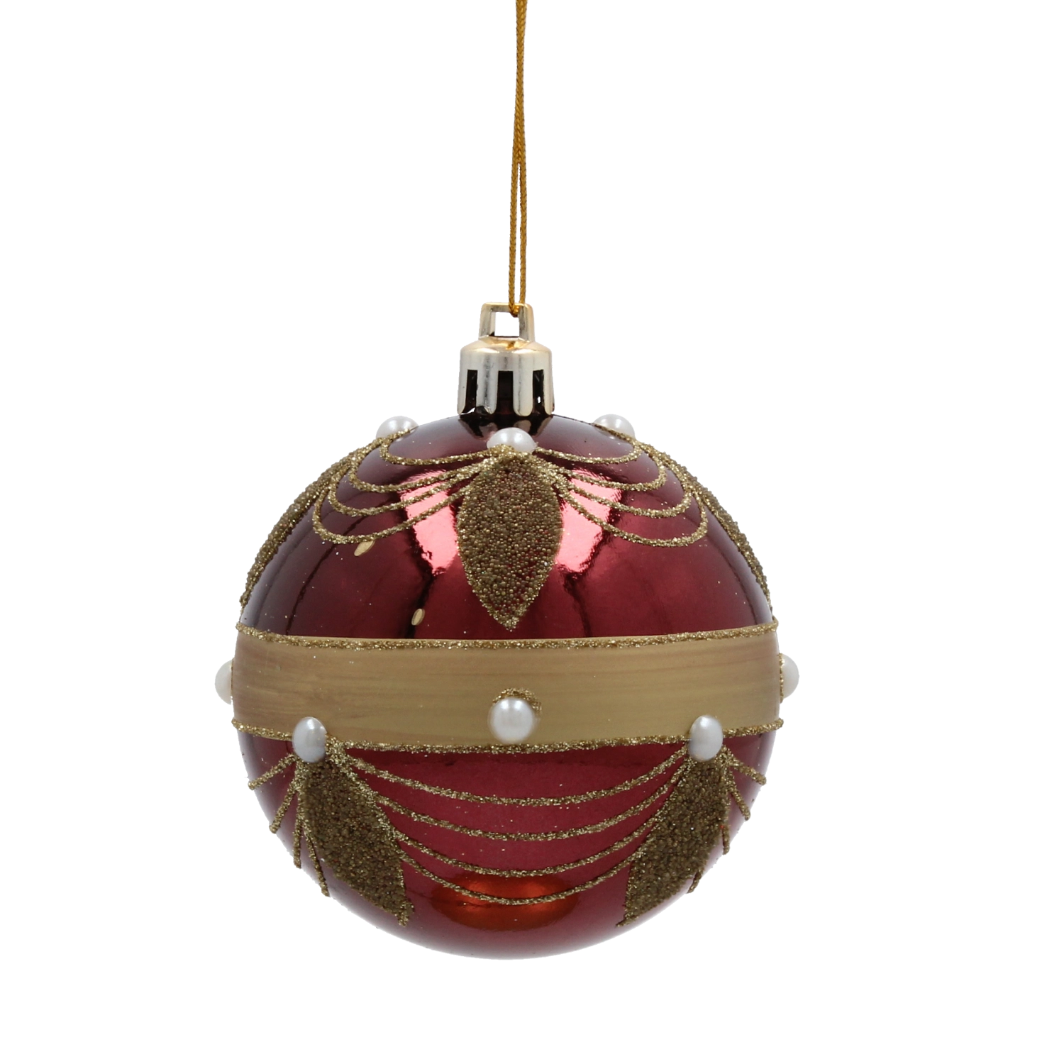 Adaugă casei tale o strălucire festivă cu setul de șase ornamente în nuanță burgund intens. Fiecare glob cu diametrul de 7 cm este decorat cu linii aurii, frunze și perle albe pentru un aspect elegant și glamour. Realizate din plastic indestructibil, sunt sigure pentru copii și animale de companie, iar datorită șnururilor pentru agățare ușoară le poți folosi pe brad și în alte aranjamente festive.