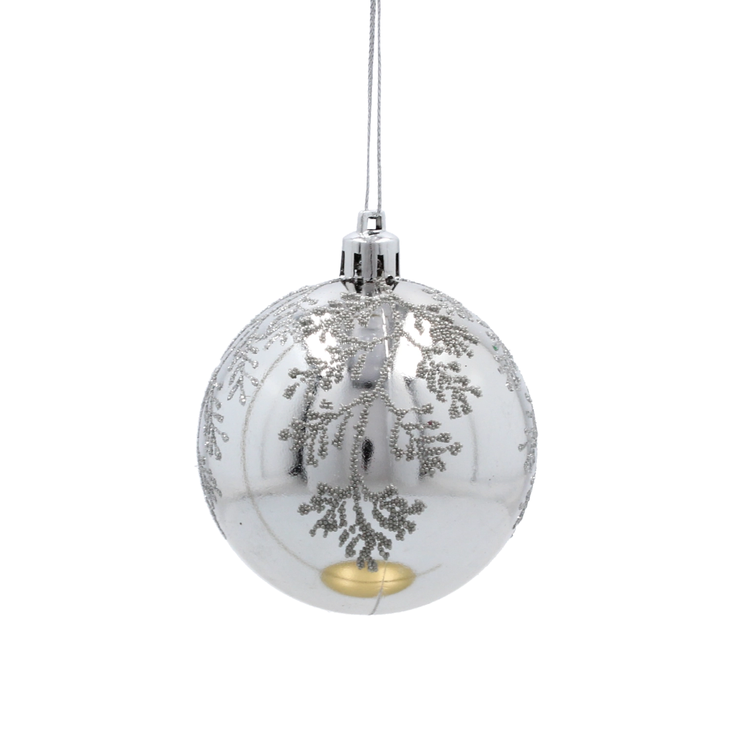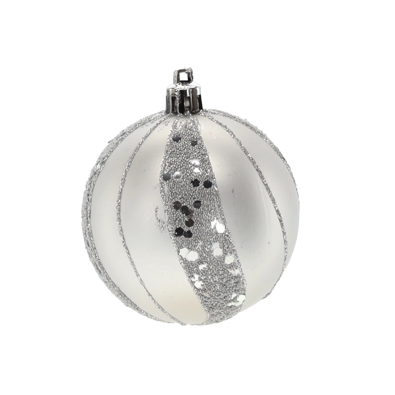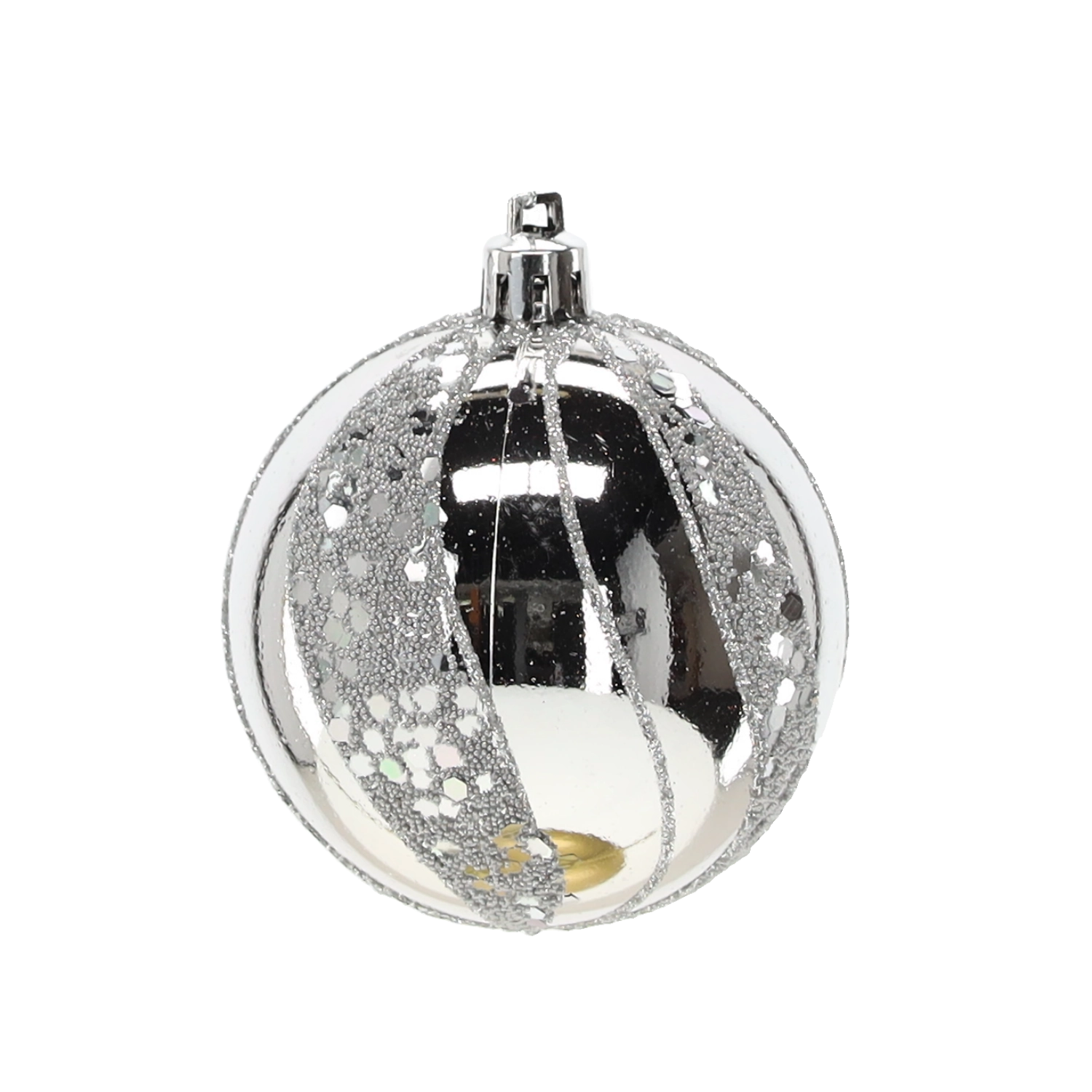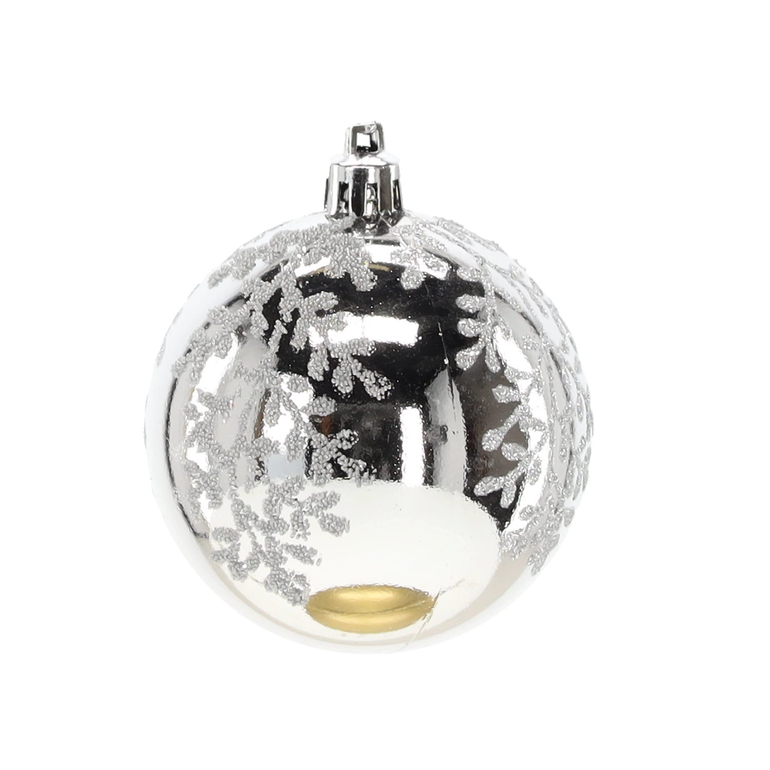 Set elegant de șase globuri argintii de Crăciun, cu diametrul de 7 cm, care adaugă decorului tău strălucire și eleganță. Combinația de finisaje mate și lucioase cu detalii sclipitoare creează o atmosferă festivă plină de farmec. Plasticul ușor și rezistent este sigur pentru copii și ideal pentru agățare ușoară pe brad, coroane, ghirlande sau în aranjamente de masă.