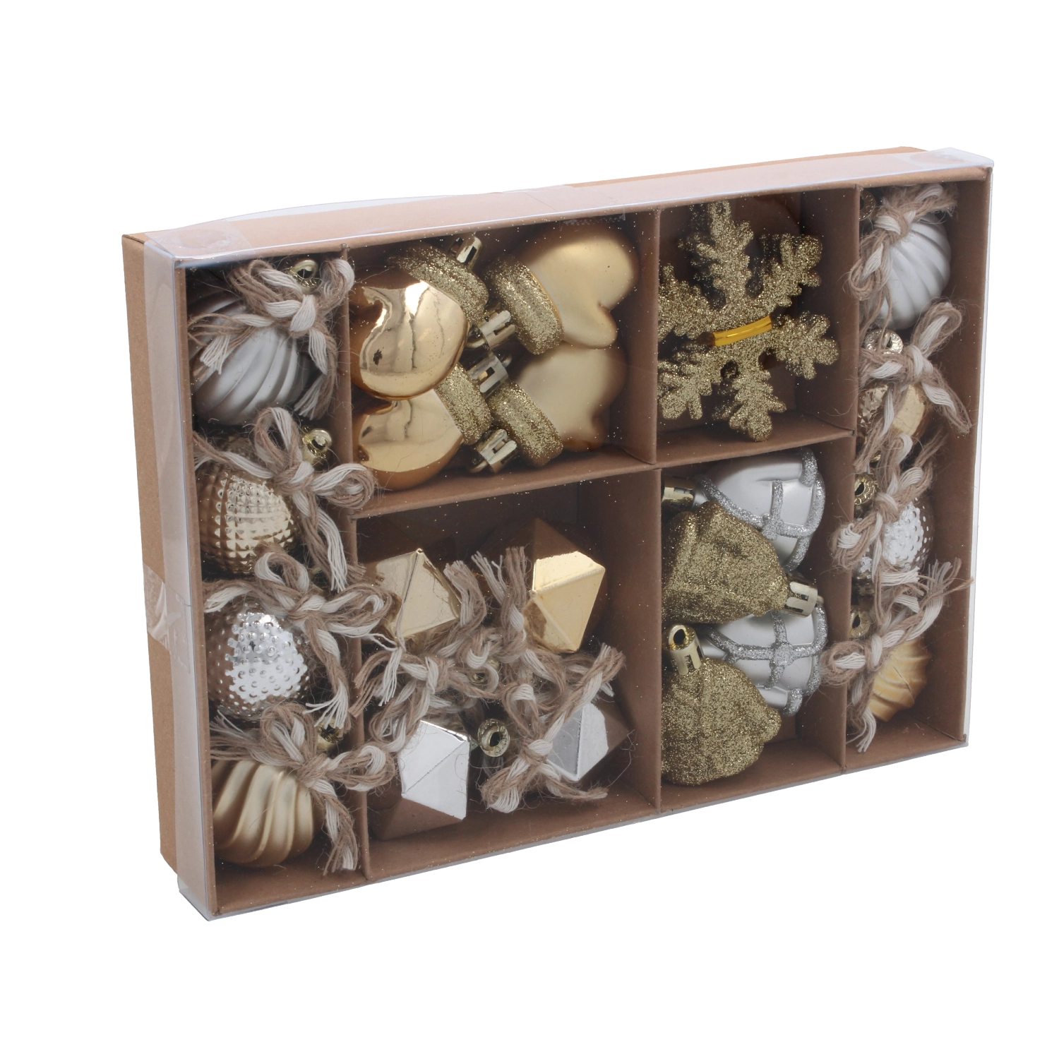 Datorită mixului de forme – de la bile clasice la stele sclipitoare și până la jucăușele mănuși – veți obține cu ușurință o compoziție vizual interesantă. Nuanțele metalice neutre se potrivesc cu decorațiuni naturale, luminițe și alte ornamente, subliniind astfel atmosfera festivă a interiorului.