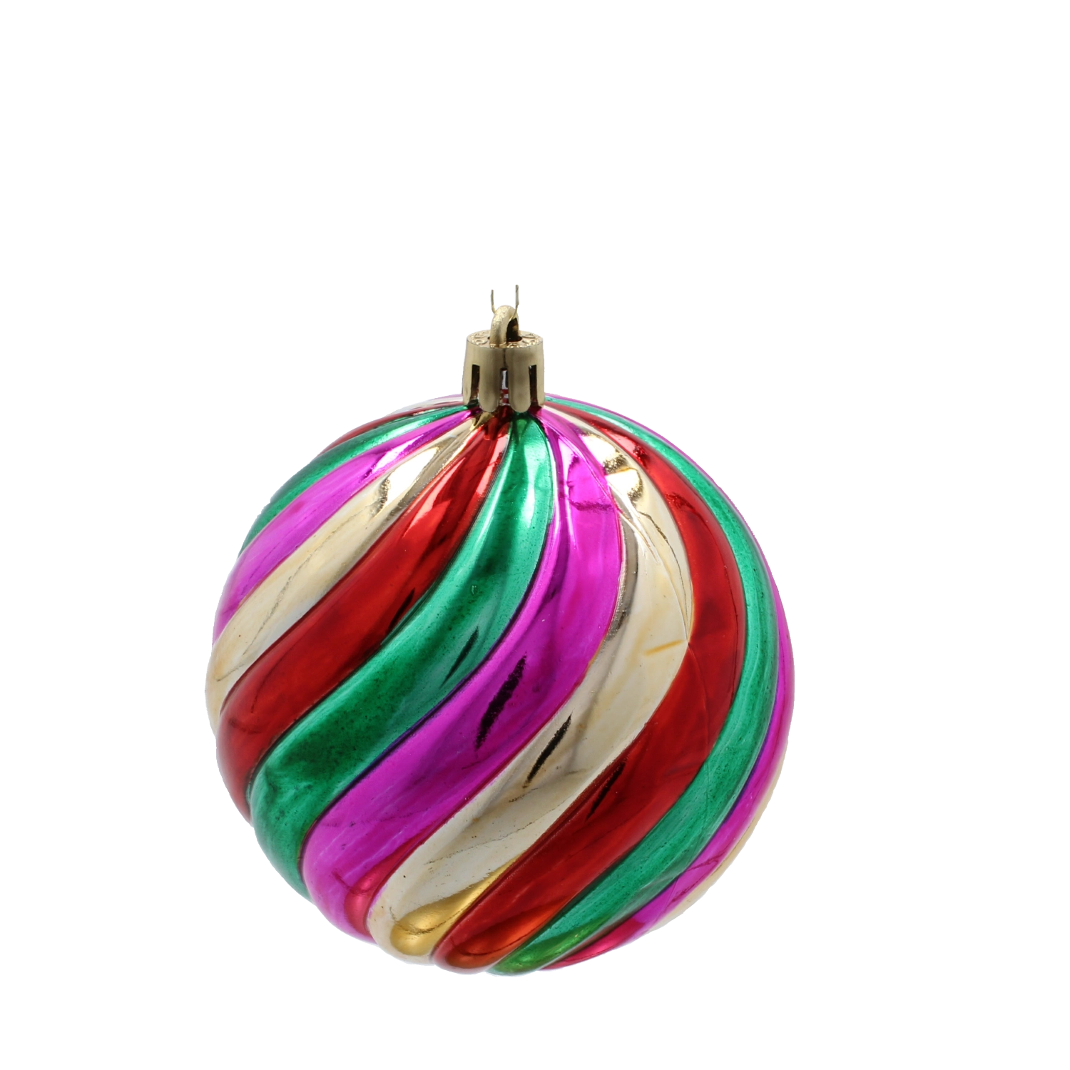 Globurile spiralate în nuanțe de roz, verde, roșu și auriu oferă bradului un accent puternic și o energie festivă.