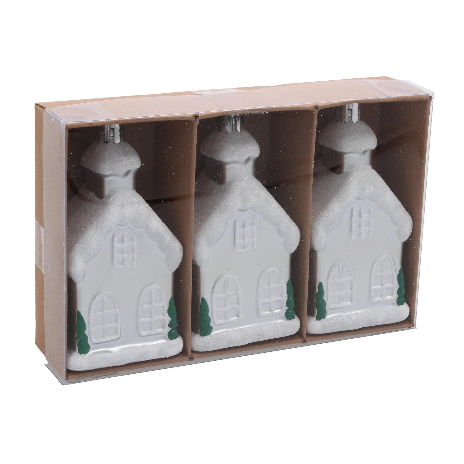 Creați acasă o atmosferă de basm cu setul de trei decorațiuni de Crăciun în formă de căsuțe, cu înălțimea de 9 cm. Decorațiunile din plastic ușor sunt rezistente la spargere, au detalii fine și accente sclipitoare care reflectă frumos lumina. Ideale pentru familii cu copii și animale de companie și potrivite atât pentru decor tradițional, cât și modern.