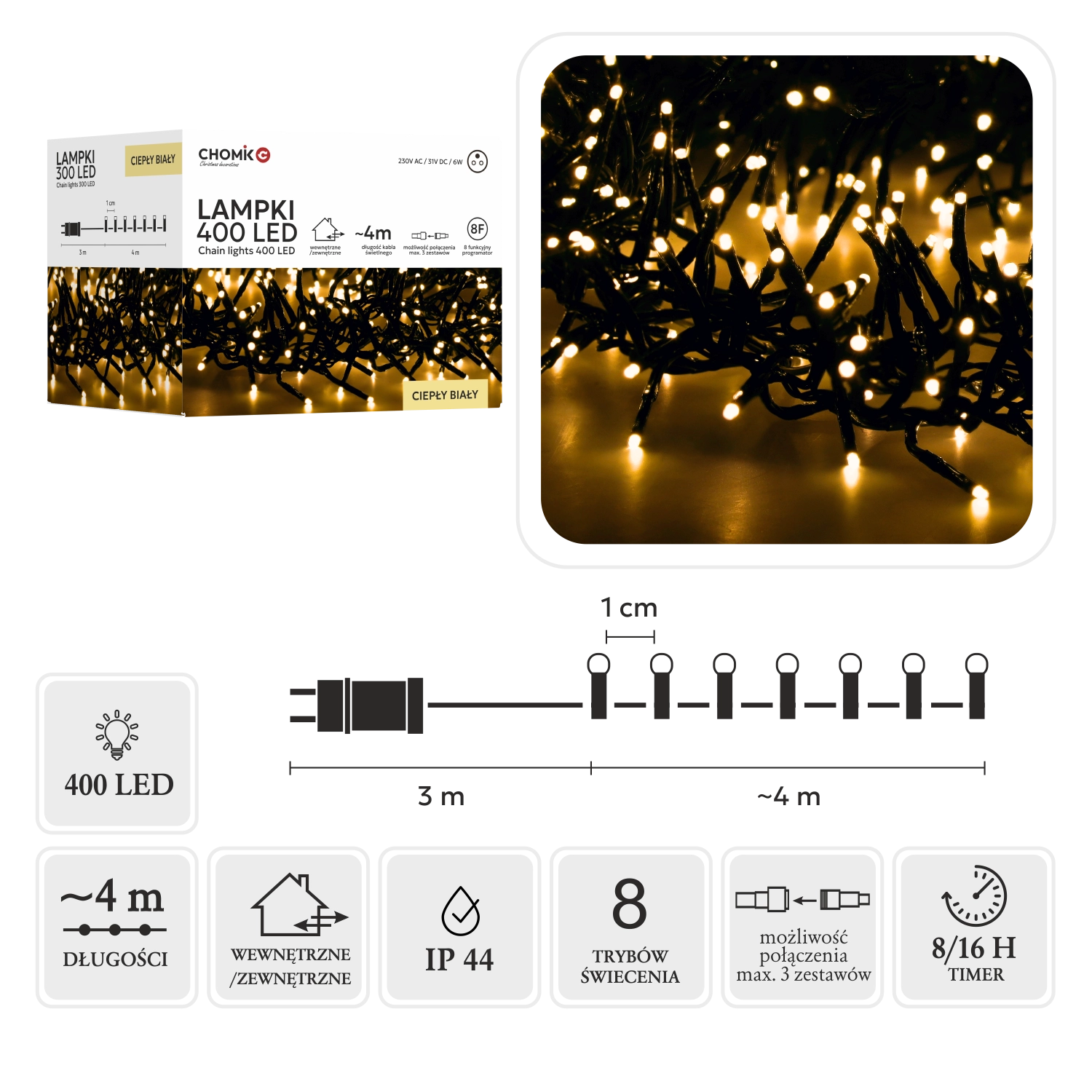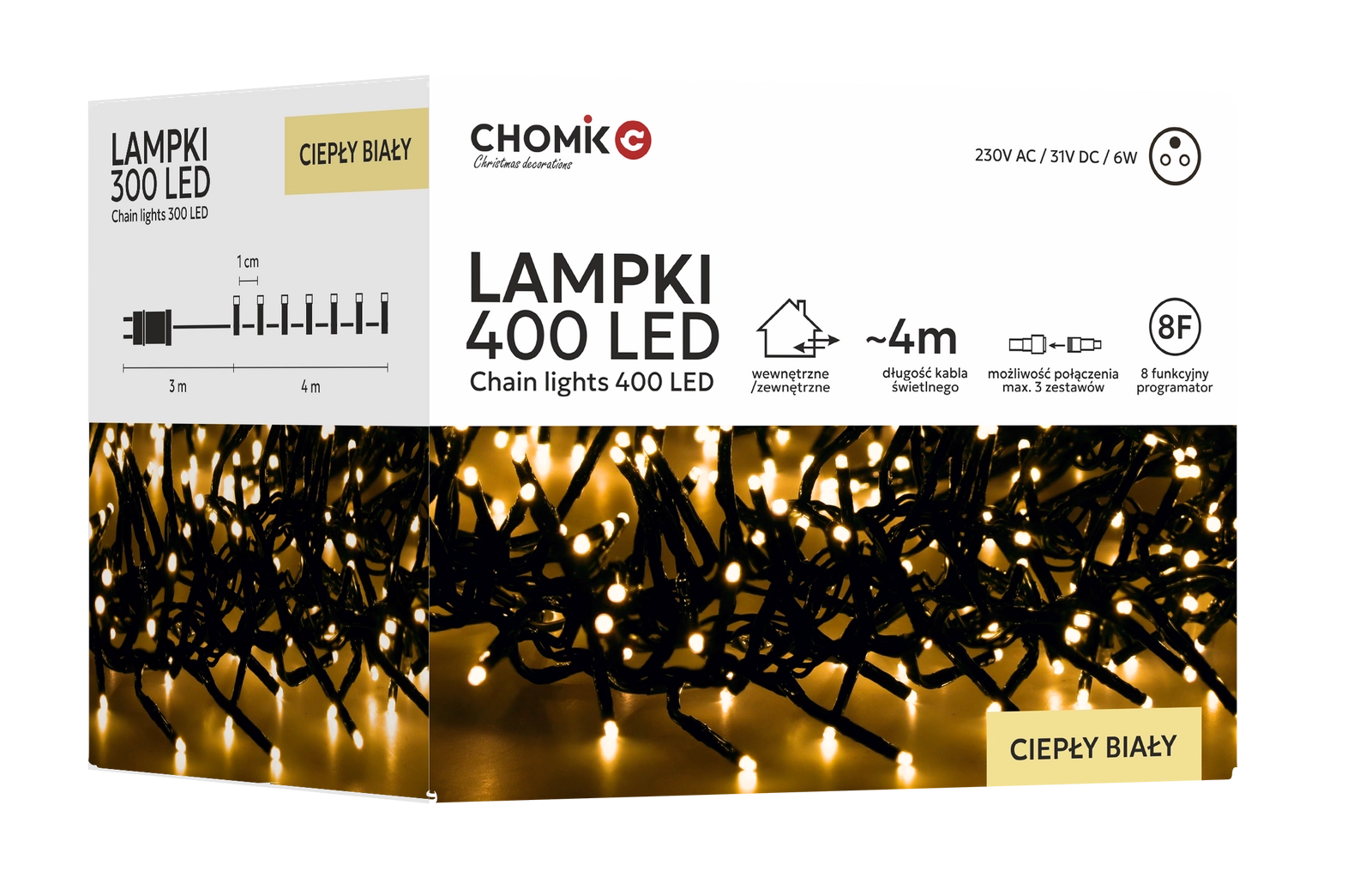 Șirul LED Cluster cu 400 diode oferă o lumină efectivă și densă, care se evidențiază pe bradul de Crăciun, balustradă, perete sau în grădină. Culoarea alb cald creează o atmosferă primitoare, iar cu ajutorul controlerului cu memorie și temporizator vă setați ușor modul preferat fără a fi nevoie de reprogramare.