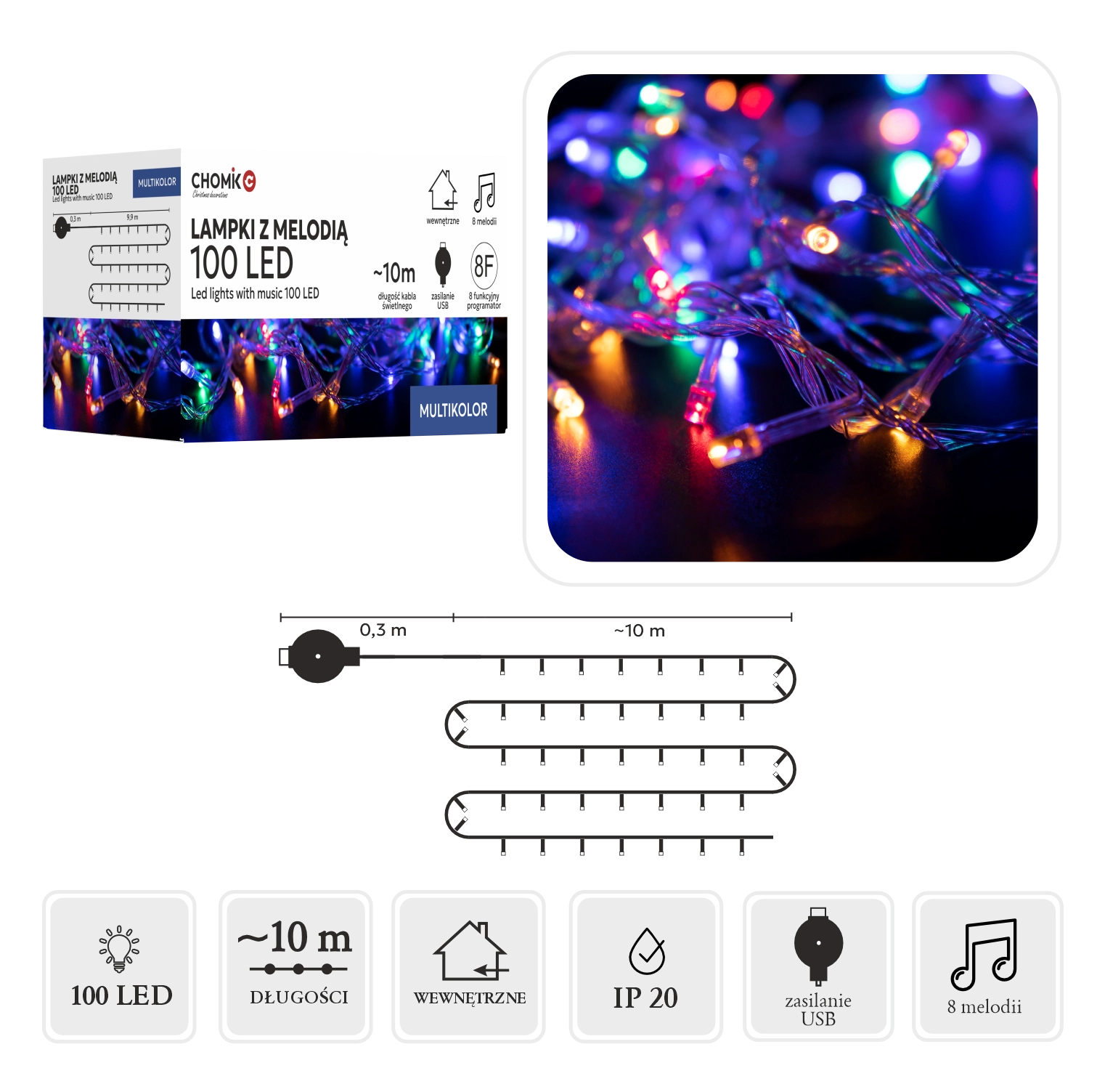 Alimentarea USB cu melodii permite utilizare flexibilă – conectați la baterie externă, laptop sau adaptor de rețea. Datorită protecției IP44, șirul este potrivit pentru decorațiuni de interior și pentru exterior protejat: brazi, balustrade, ferestre sau terase.