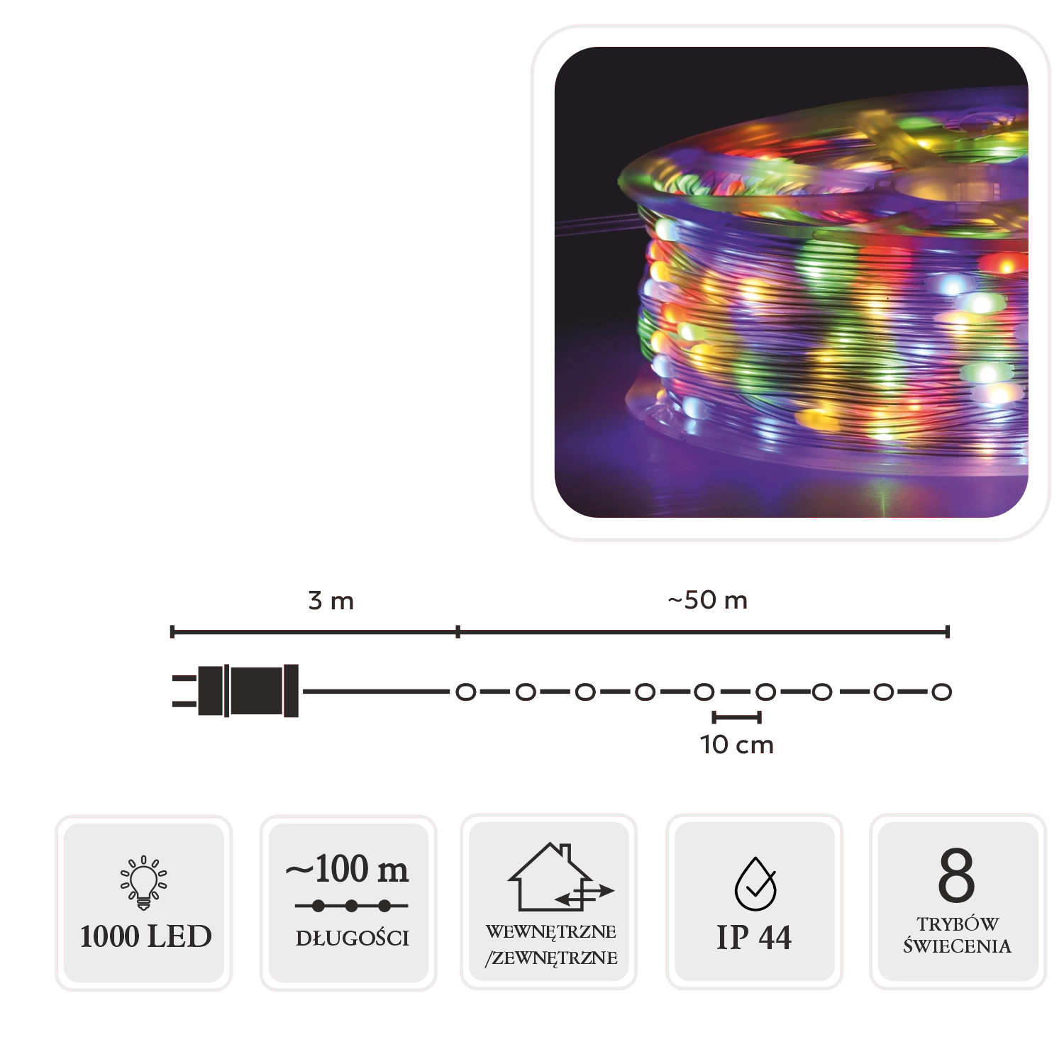 Controlerul cu 8 funcții are memorie pentru ultima setare și temporizator 8/16 h pentru pornire și oprire automată. Bobina din pachet ușurează manipularea, depozitarea și reutilizarea. Datorită protecției IP44, ghirlanda este potrivită pentru interior și spații exterioare protejate.