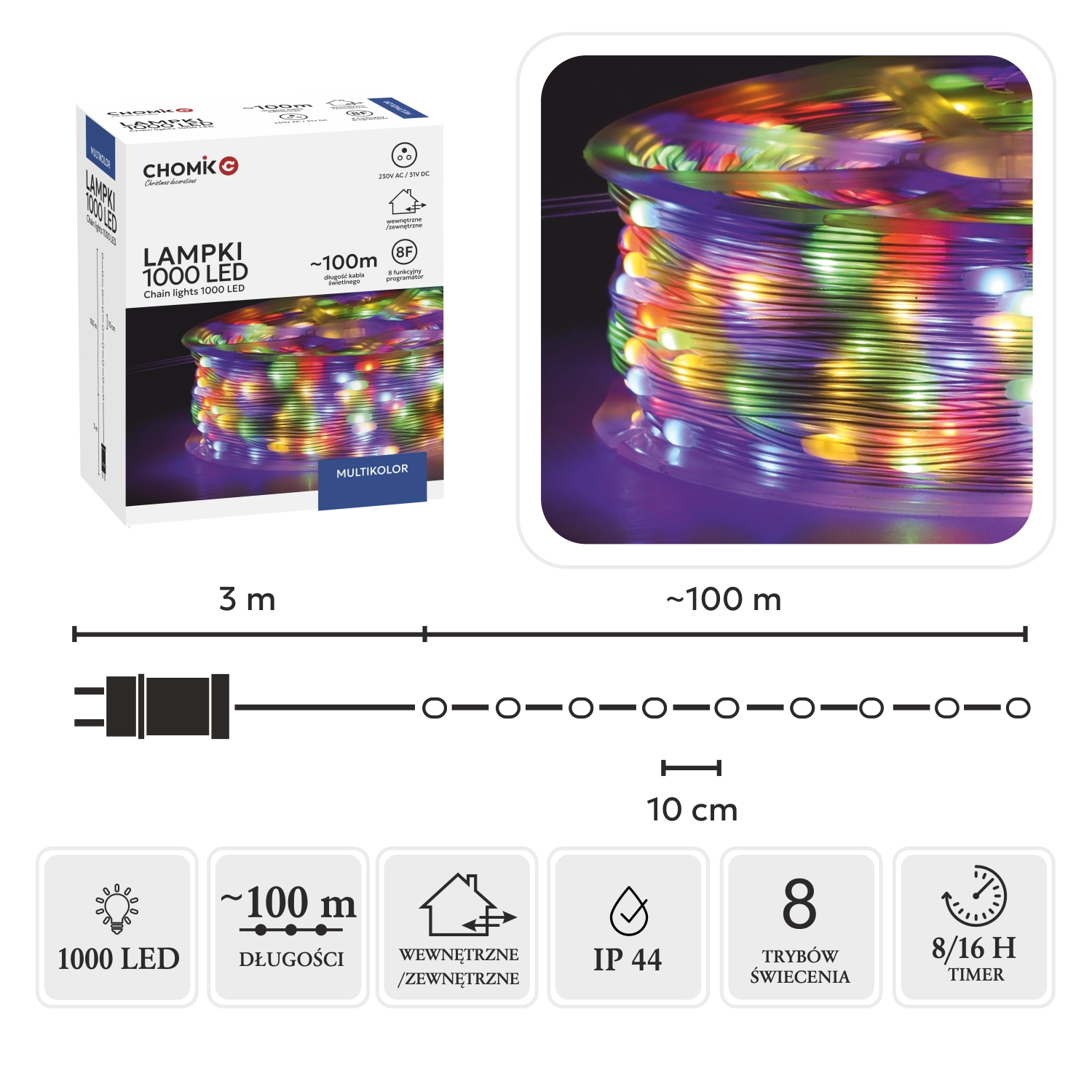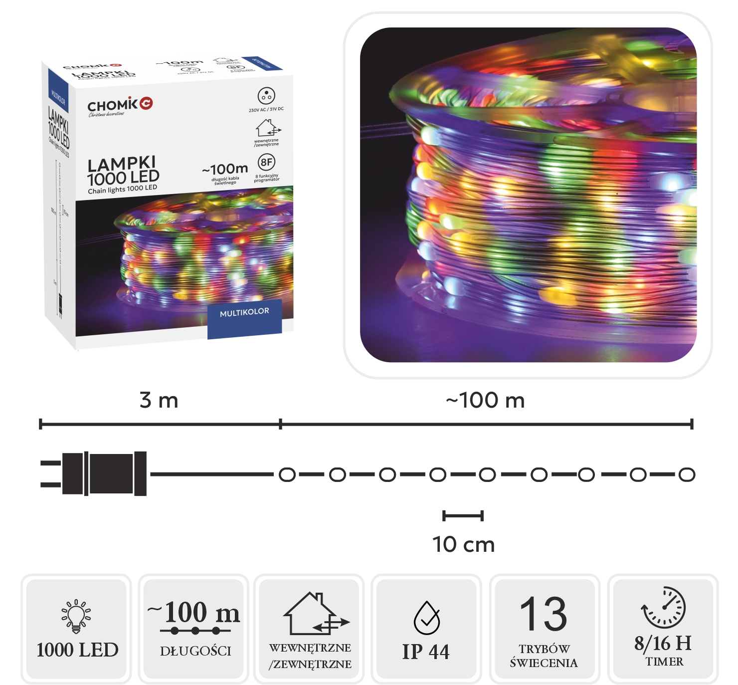 Iluminează-ți casa și grădina cu ghirlanda LED extra lungă de 100 m și cu 1000 de micro LED-uri în variantă multicolor. Datorită cablului transparent, lumina curată iese în evidență, iar 8 moduri cu memorie și temporizator 8/16 h asigură o utilizare comodă. Pachetul include o bobină pentru derulare și depozitare ușoară, potrivită pentru interior și exterior (IP44).