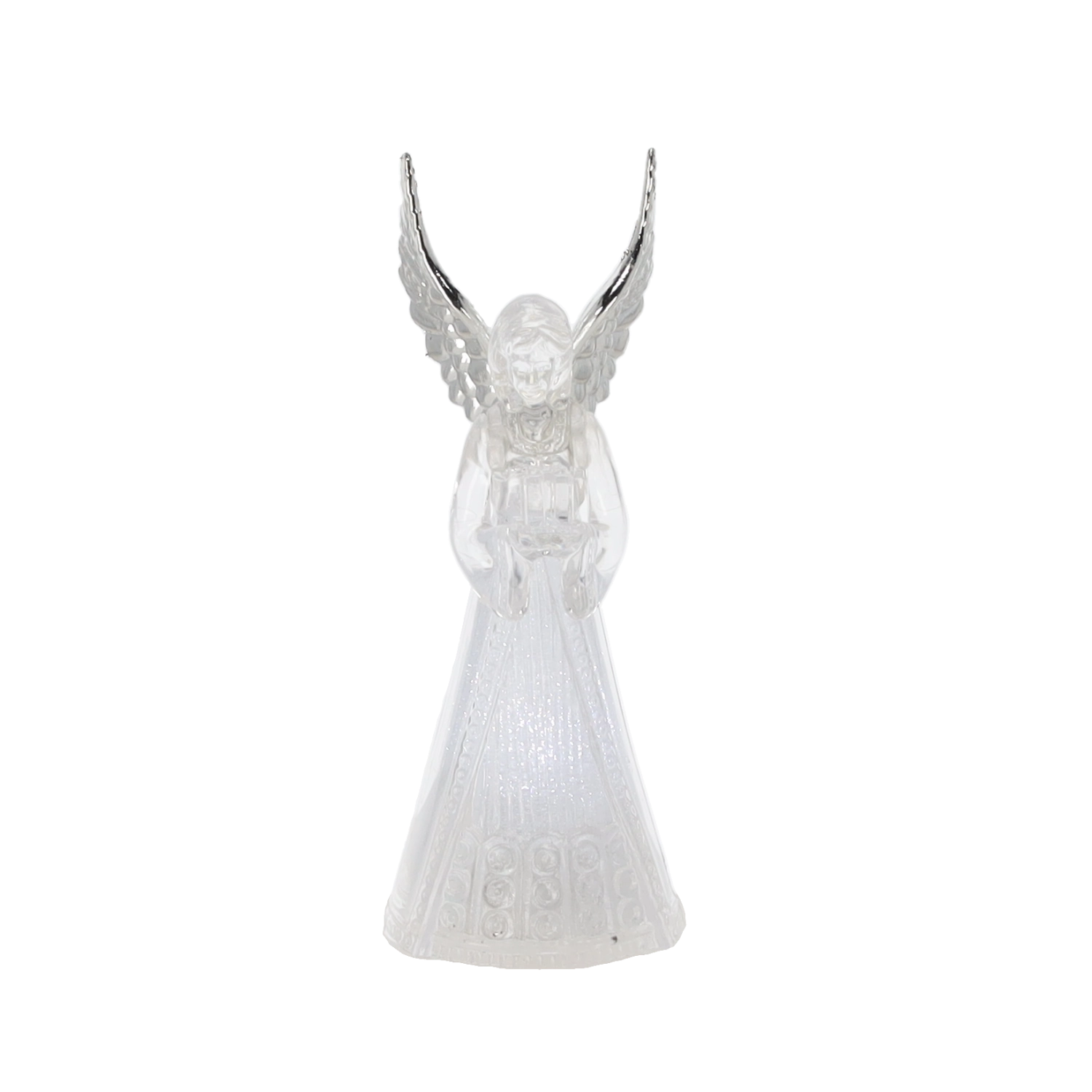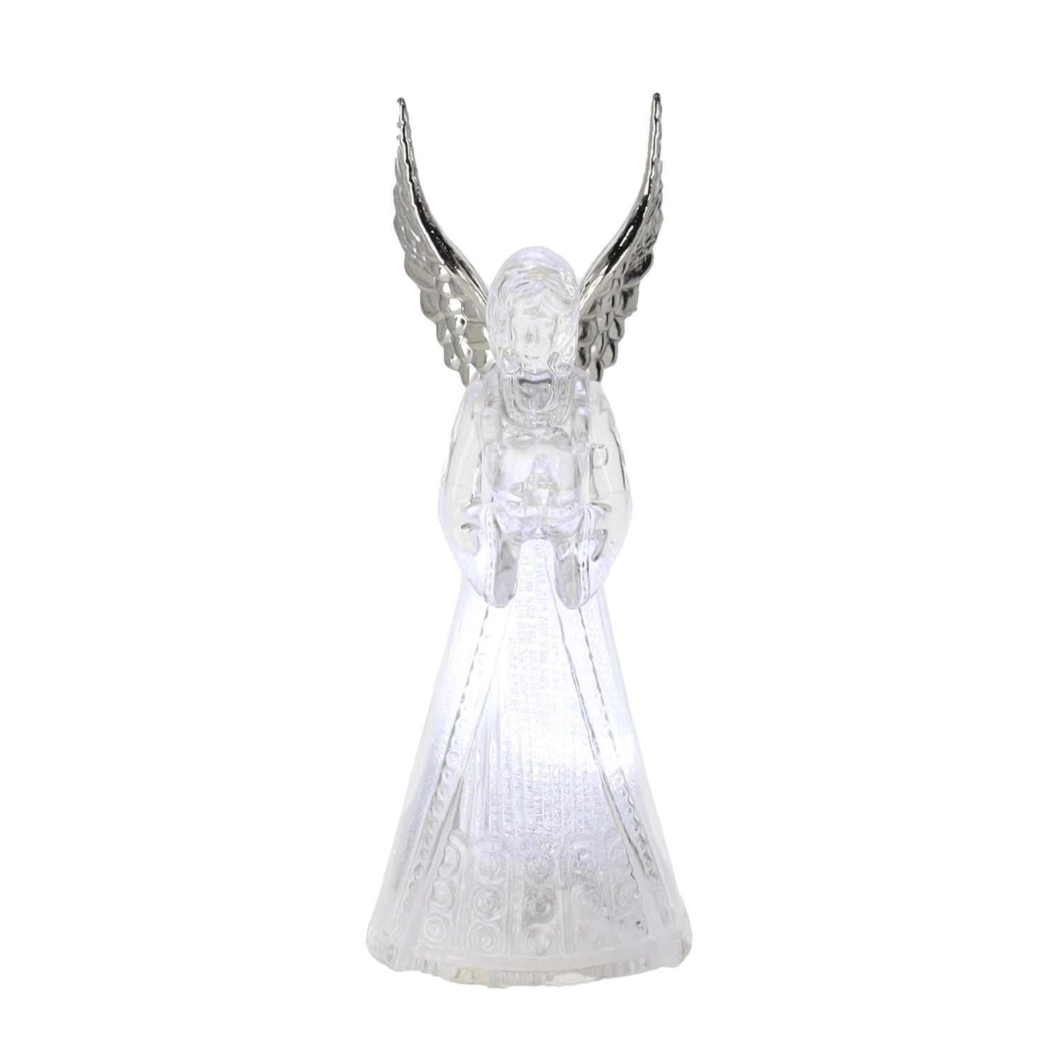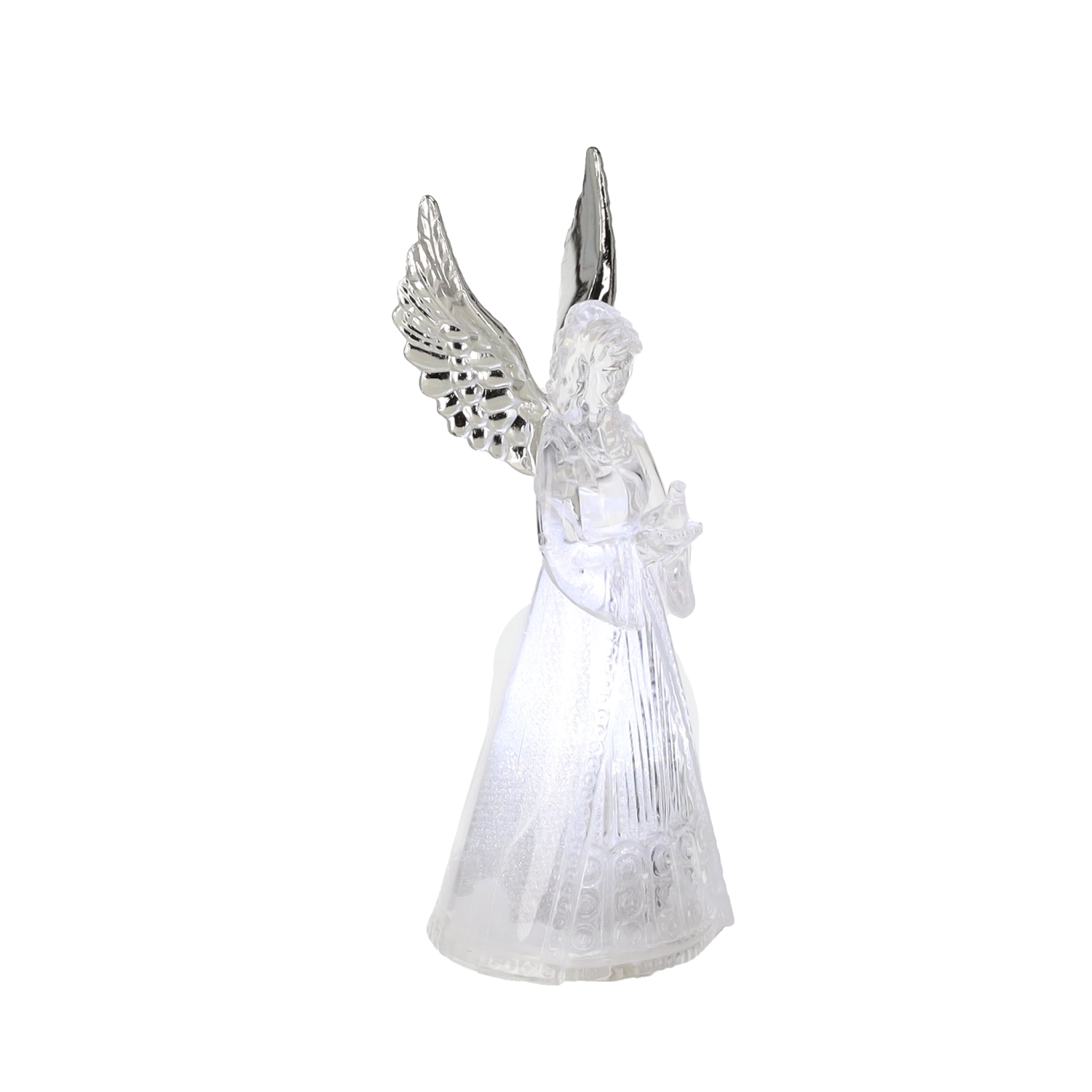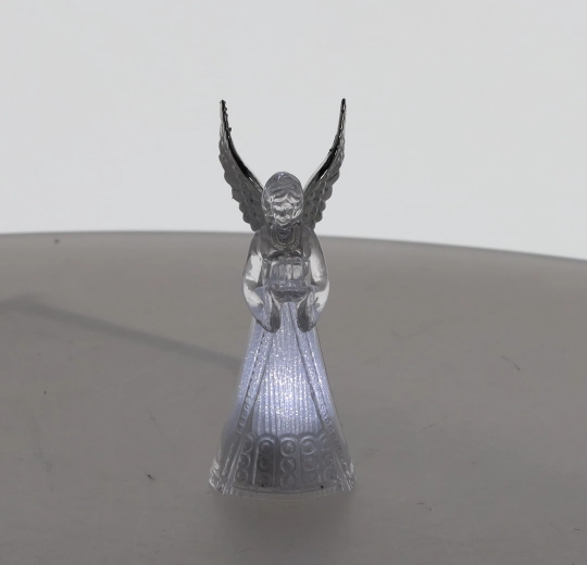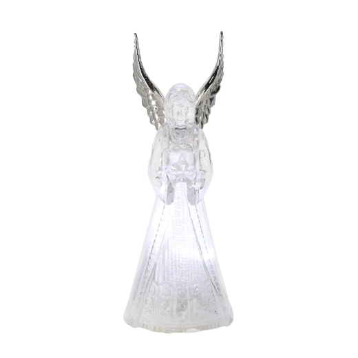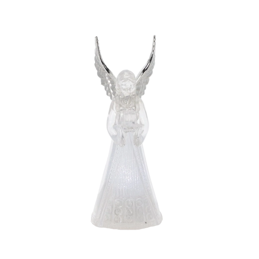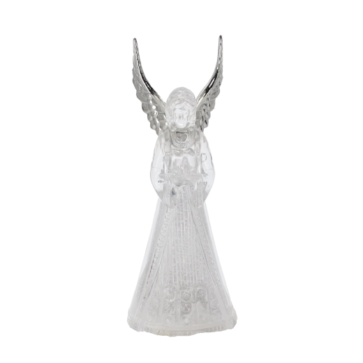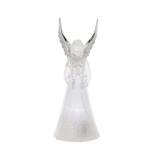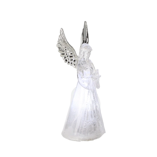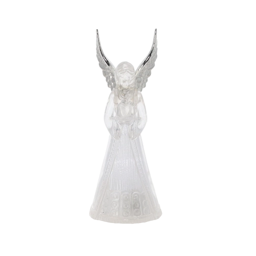 Corpul translucid al îngerului difuzează o lumină rece albă și creează o atmosferă calmă și elegantă, ideală pentru Crăciun și momentele liniștite de seară.