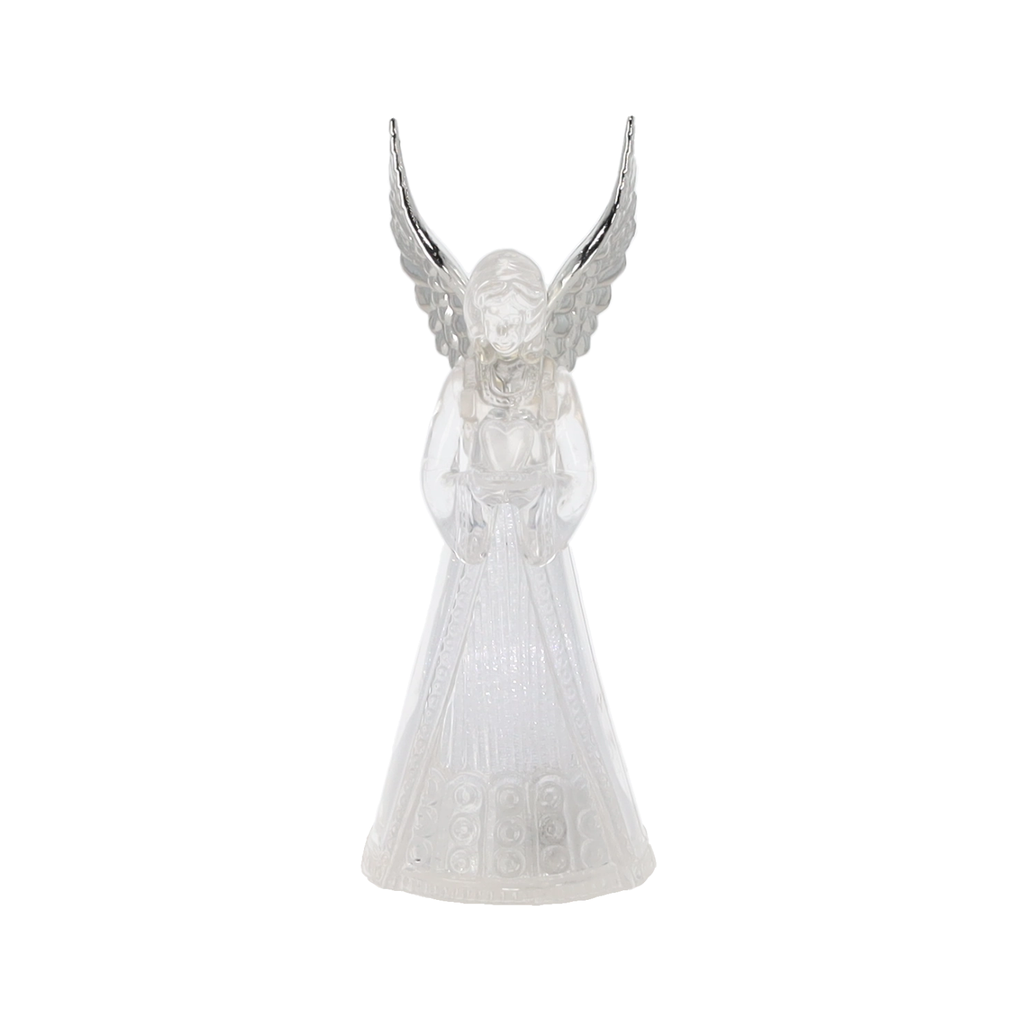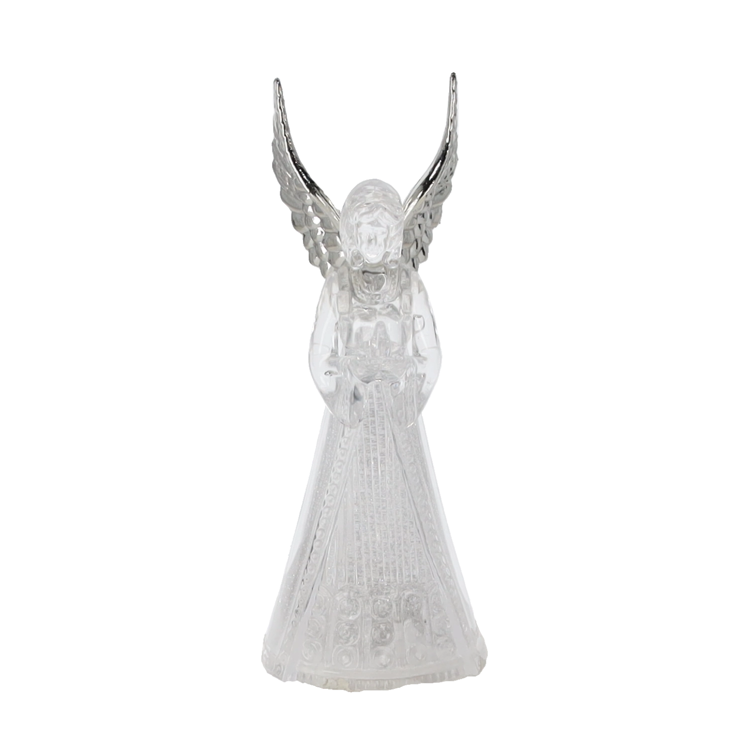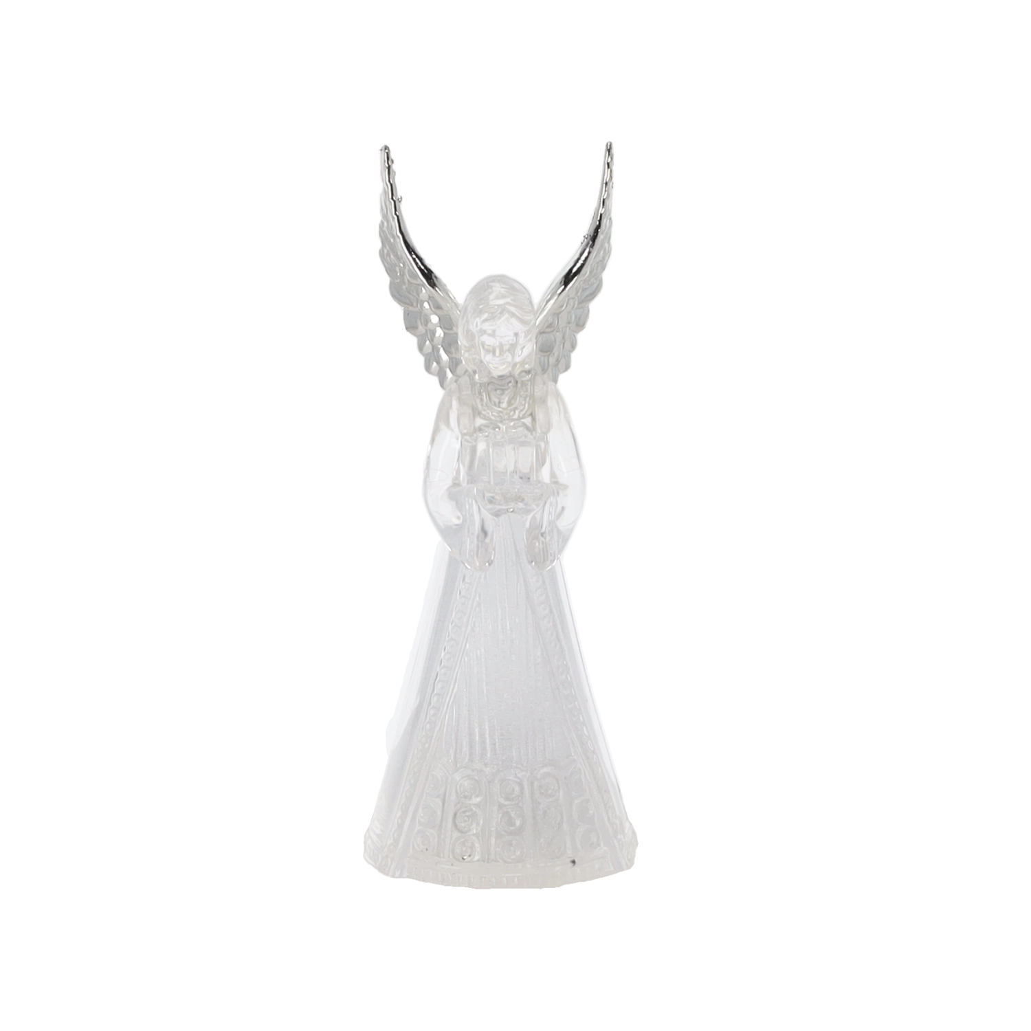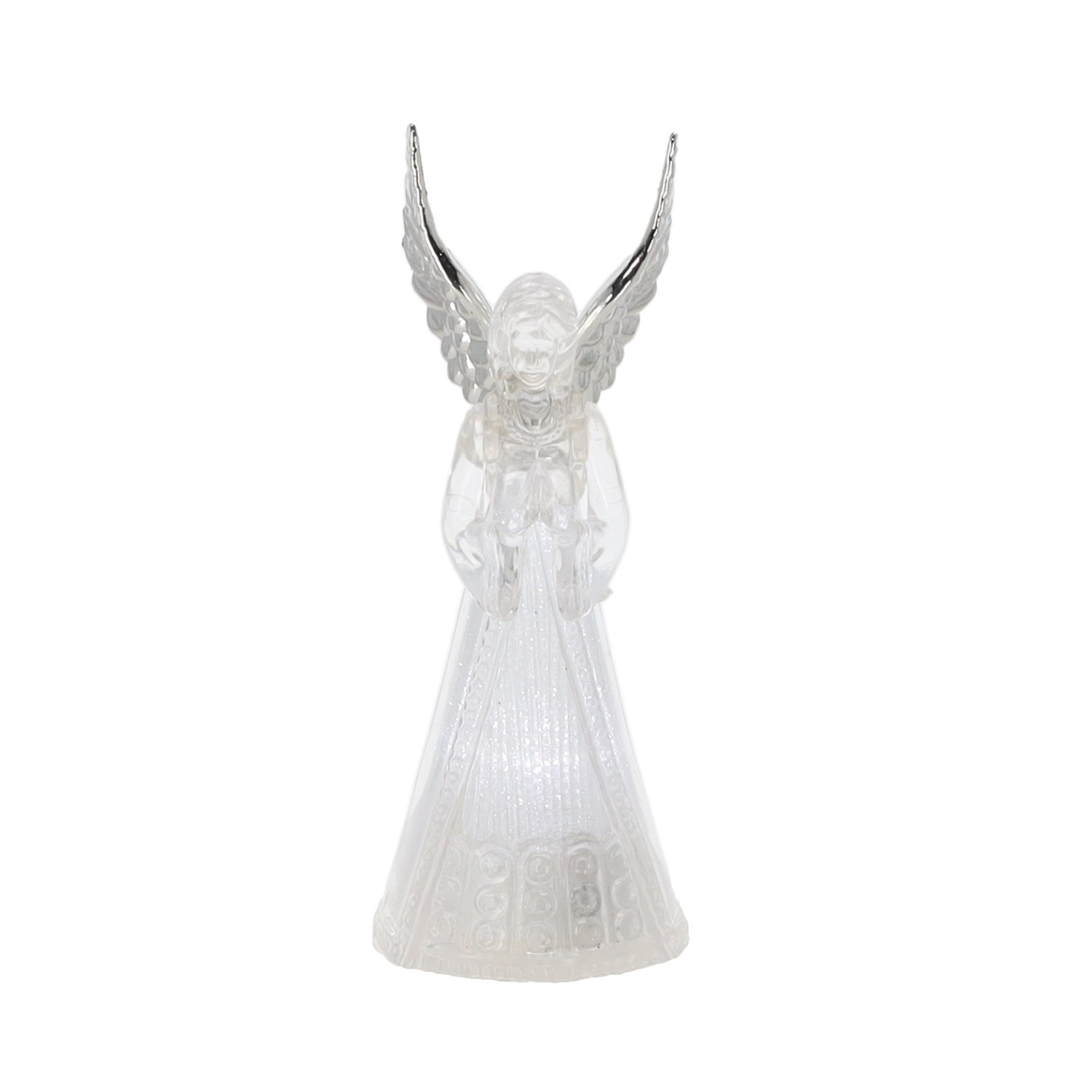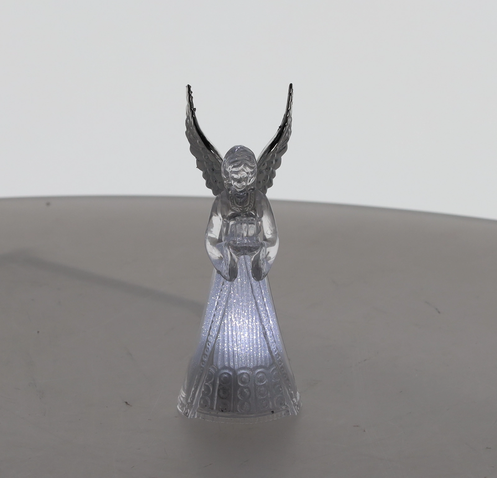 Corpul translucid al îngerului difuzează o lumină rece albă și creează o atmosferă calmă și elegantă, ideală pentru Crăciun și momentele liniștite de seară.