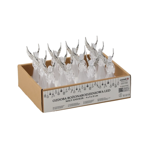 Decorațiune îngerească elegantă cu lumină rece albă delicată care iluminează orice interior. Datorită dimensiunilor compacte de 11 cm, se potrivește pe raft, masă sau pervaz. Figurina din plastic translucid este decorată cu aripi detaliate și modele fine ale rochiei, care difuzează frumos lumina. Alimentarea este asigurată de 3 baterii LR44 (incluse în pachet), iar controlul este facil prin comutatorul glisant ON/OFF. O decorațiune de Crăciun ideală pentru a crea o atmosferă magică.