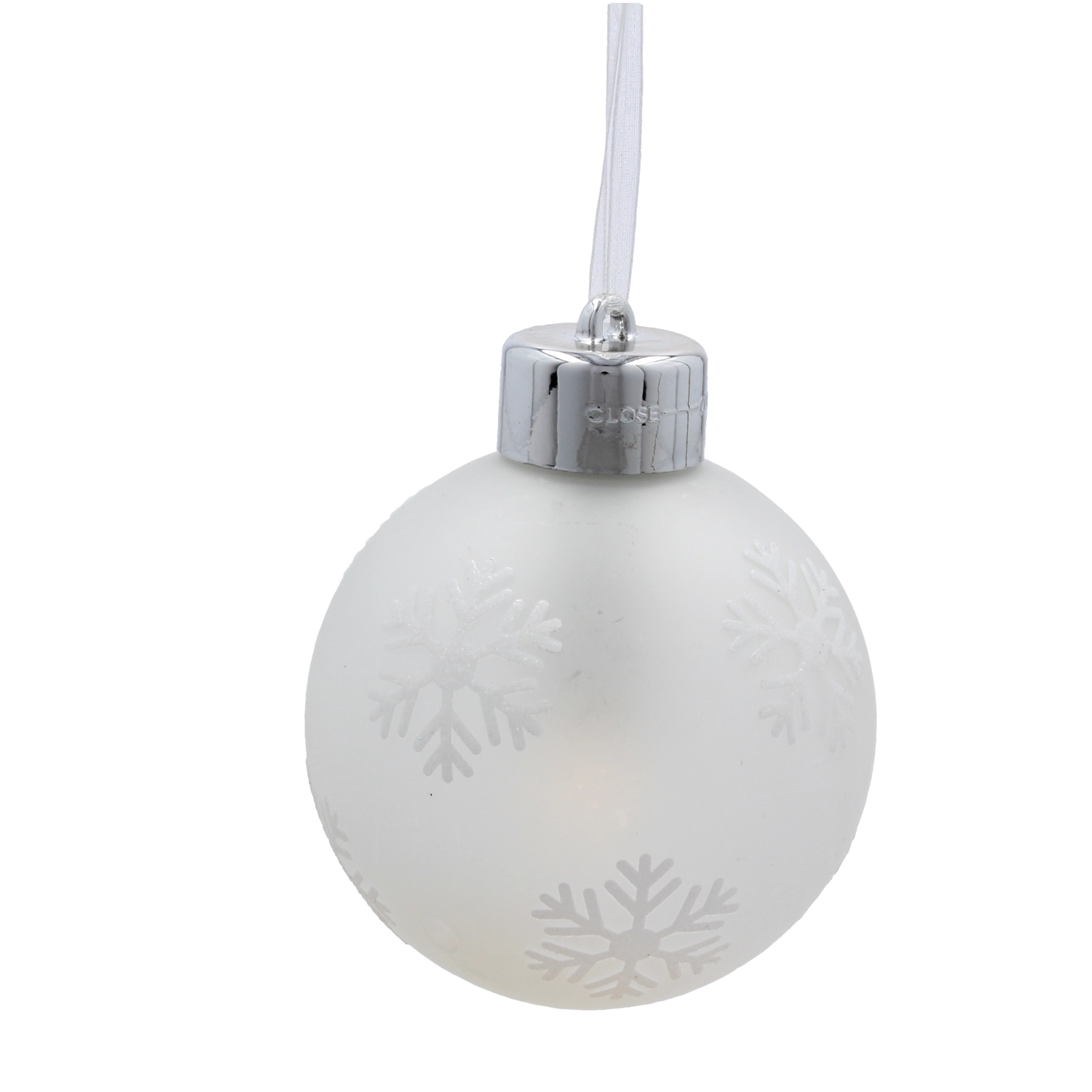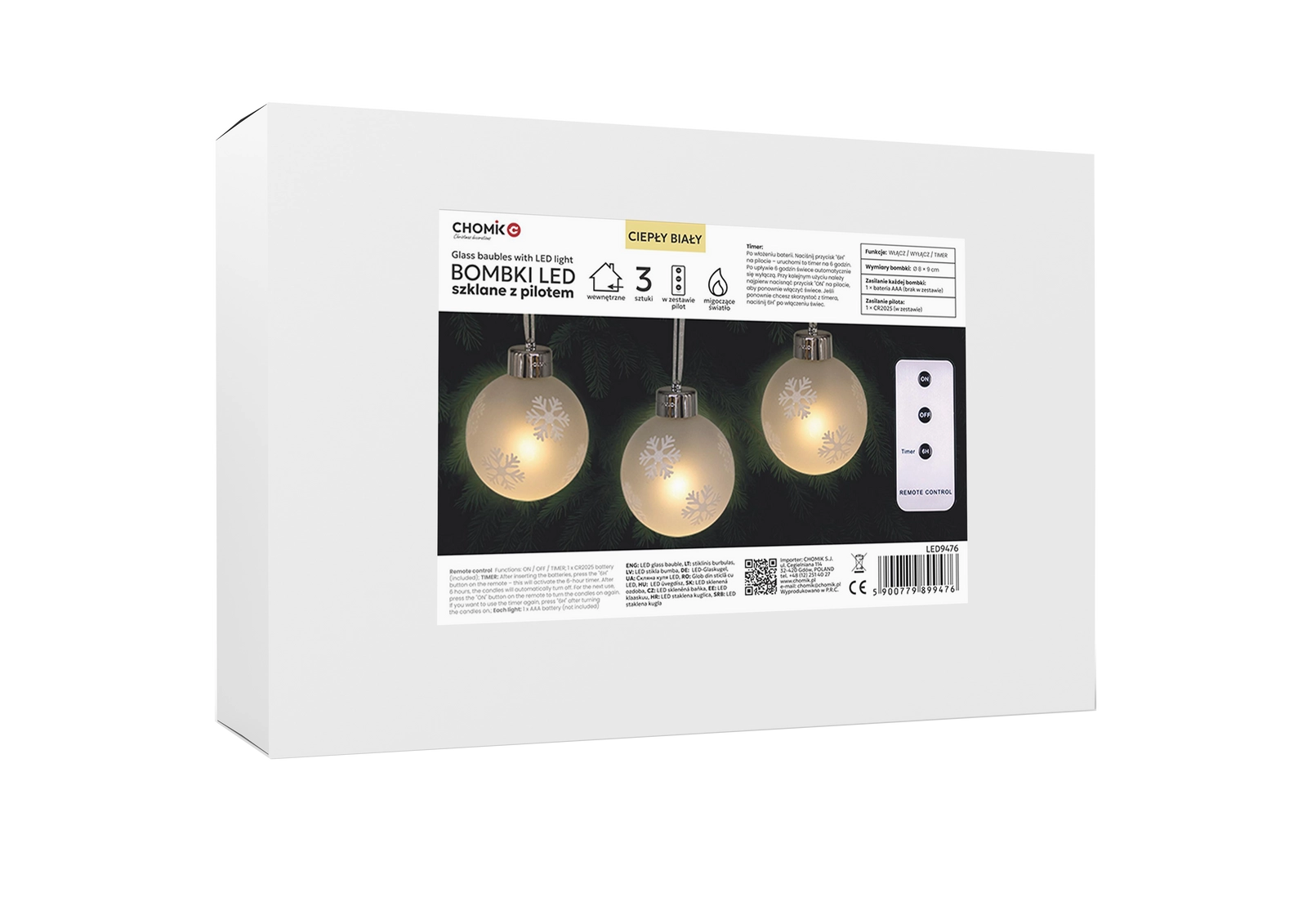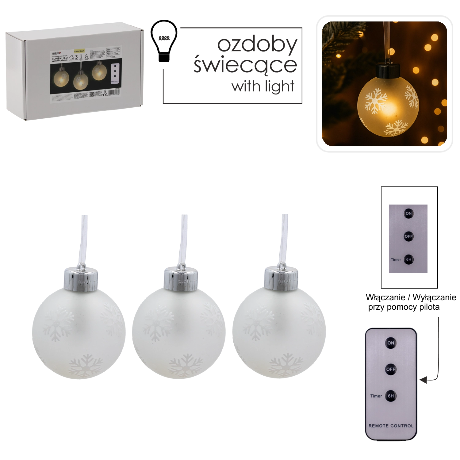 Creează acasă o atmosferă festivă magică cu setul de trei globuri de Crăciun din sticlă, cu model delicat de fulgi de zăpadă și lumină LED caldă. Datorită telecomenzii cu temporizator și alimentării pe baterii, decorațiunea este ușor de controlat, sigură și gata de utilizare imediat oriunde: pe brad, pe raft sau pe masă.