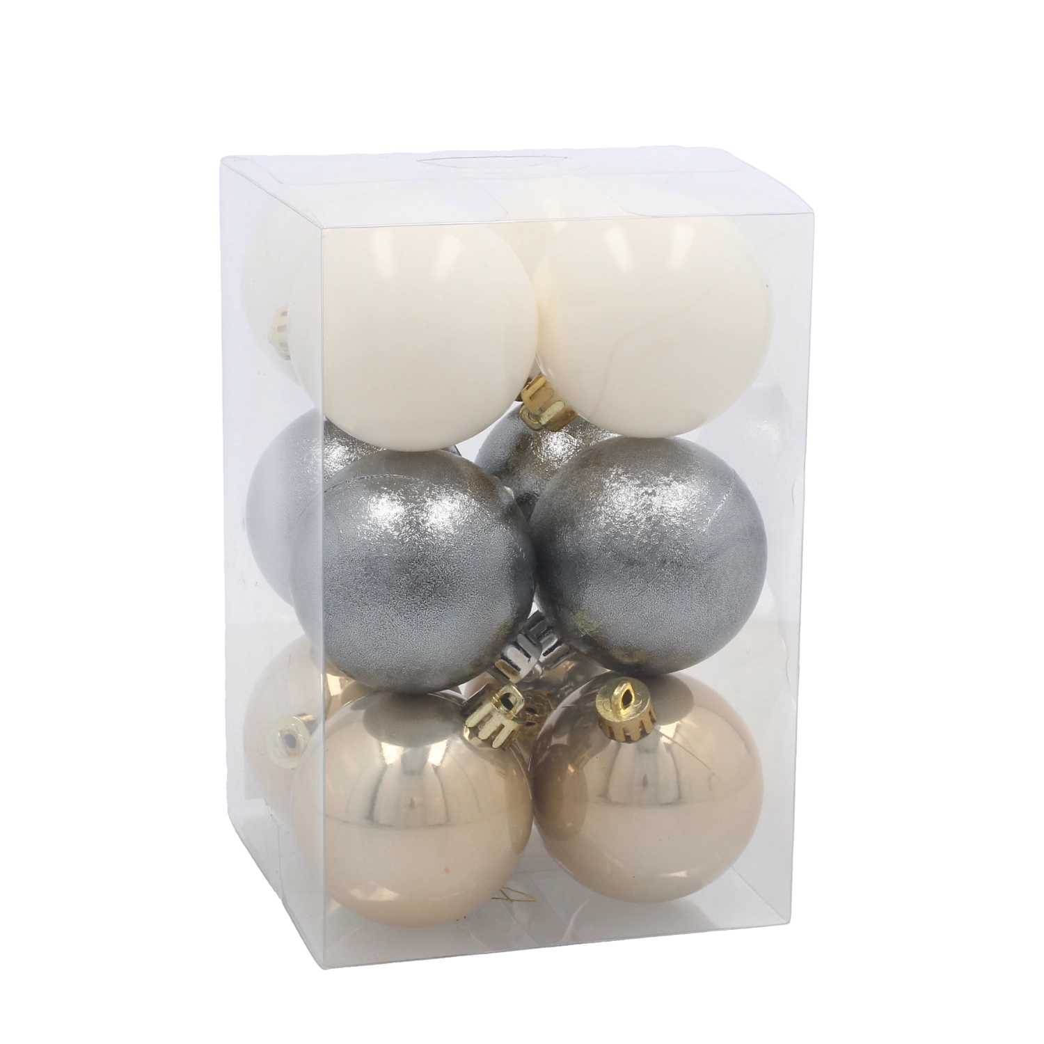 Set elegant de 12 globuri de Crăciun cu diametrul de 6 cm în nuanțe de șampanie, argintiu și alb, care oferă bradului un aspect armonios. Sunt fabricate din plastic care nu se sparge pentru siguranță sporită și au ochi de agățare practic pentru suspendare ușoară. Materialul ușor nu îngreunează ramurile și permite decorarea comodă atât în interioare clasice, cât și moderne.