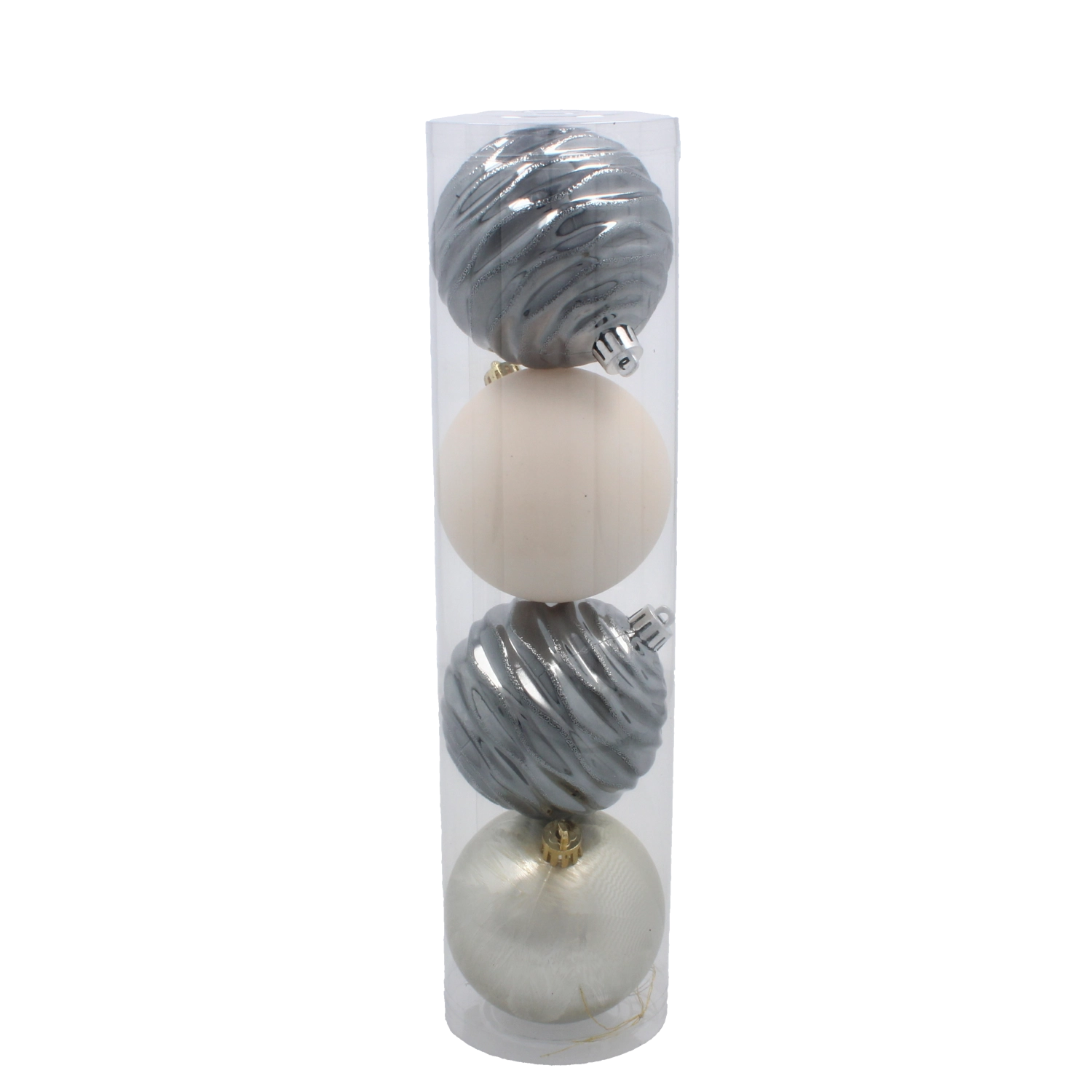 Un set elegant de patru globuri de Crăciun cu diametrul de 8 cm, în nuanțe de șampanie, gri și alb, care oferă decorațiunilor un aspect sofisticat și armonie. Plasticul rezistent asigură manipulare în siguranță și durată de viață lungă, iar mixul de suprafețe mate, lucioase și sclipitoare creează un contrast de efect. Tuba transparentă practică este ideală pentru depozitare, expunere și oferire facilă cadou.