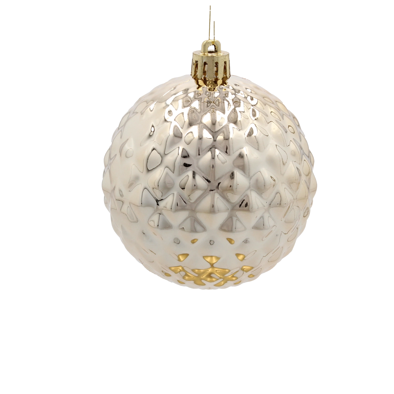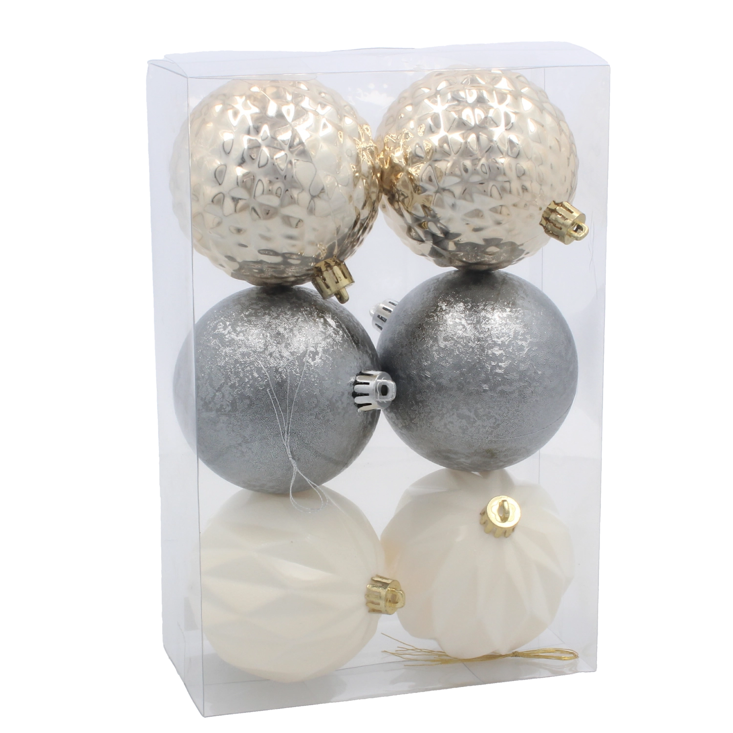 Acest set atent asortat de globuri din sticlă combină suprafețe texturate, mate și netede pentru un efect modern delicat. Paleta de culori în șampanie, argintiu și alb se combină ușor cu alte decorațiuni și creează un aspect unitar, fără haos vizual.