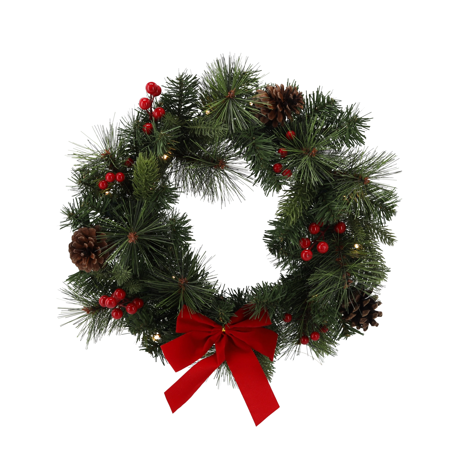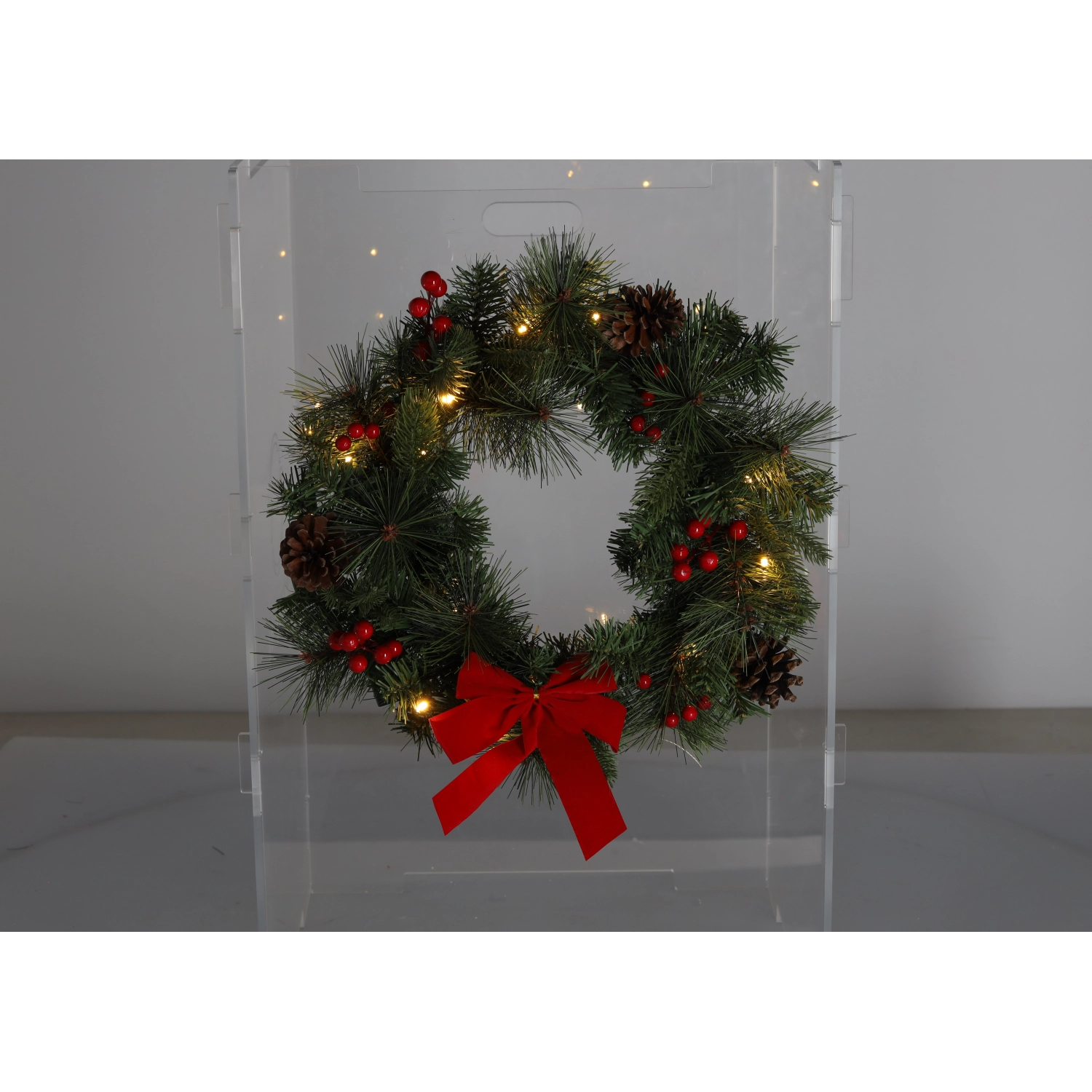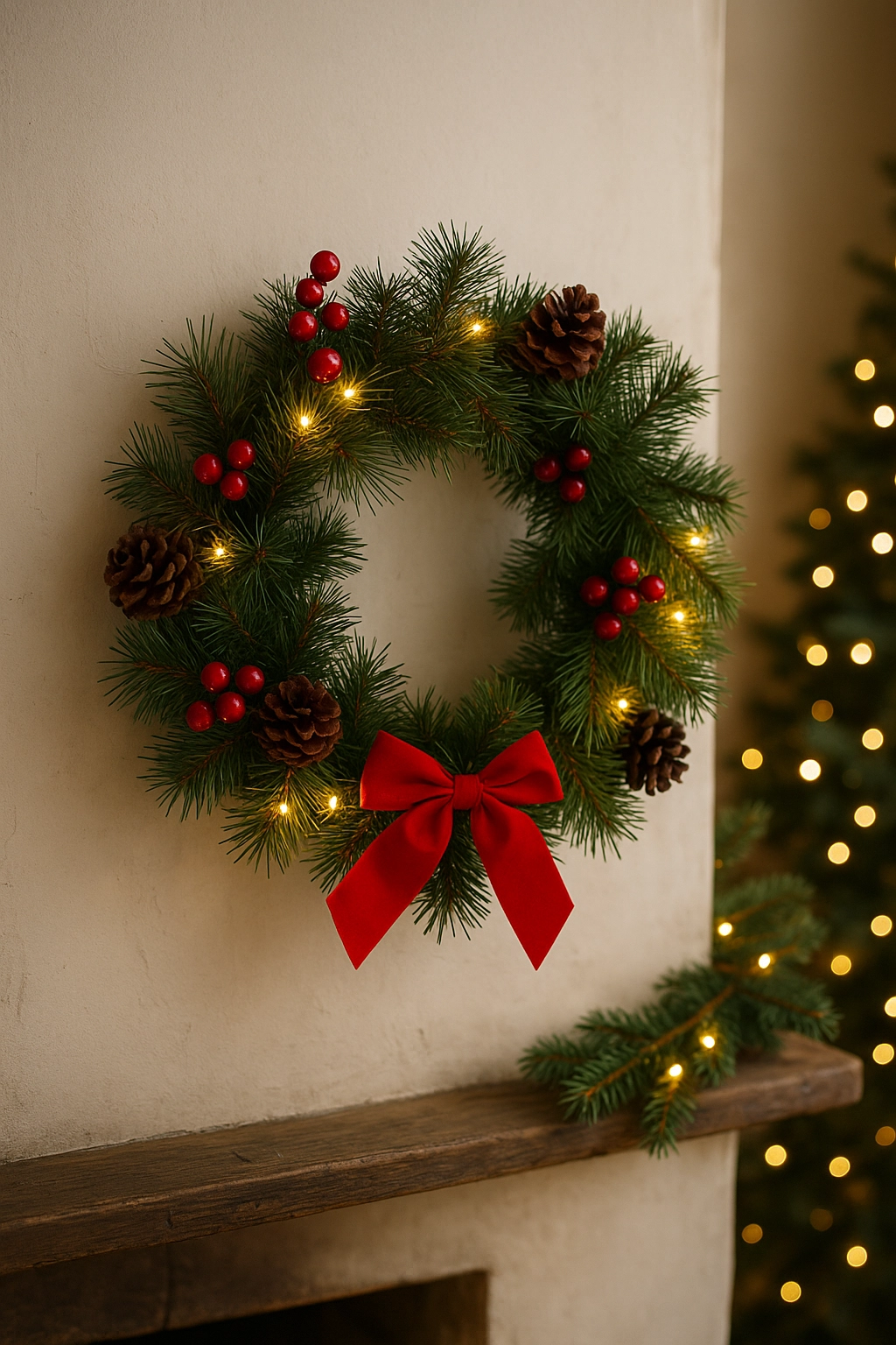 Cele 15 LED-uri alb cald integrate luminează uniform coronița și evidențiază decorațiunile, conurile și panglica – ideal pentru serile liniștite.
