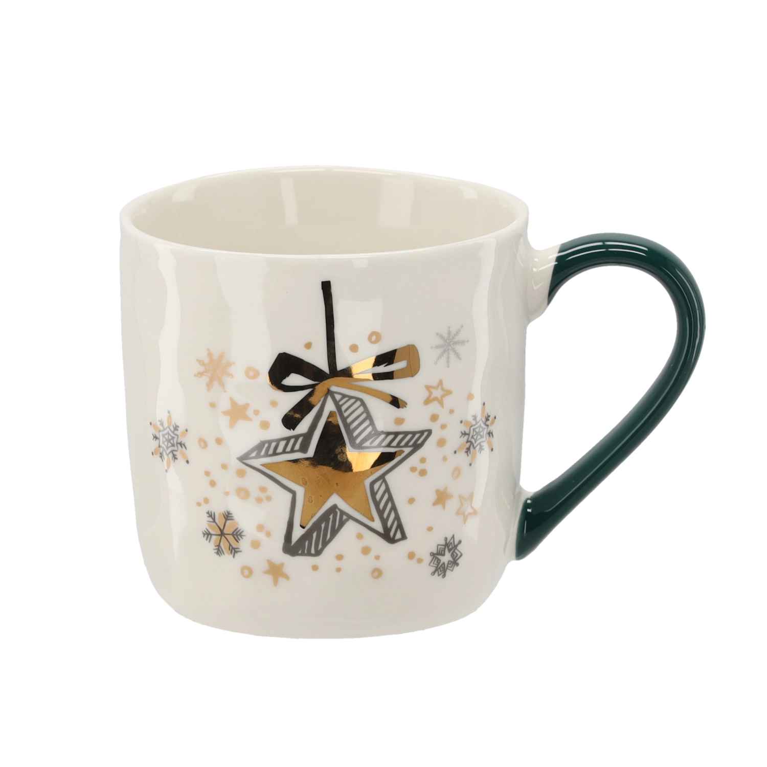 Răsfață-te sau bucură-ți apropiații cu o cană din porțelan în nuanță crem delicată și detalii festive în auriu, verde și alb. Motivele unice cu steluțe, clopoței și globuri subliniază atmosfera de sărbătoare și transformă fiecare băutură fierbinte într-un ritual plăcut.