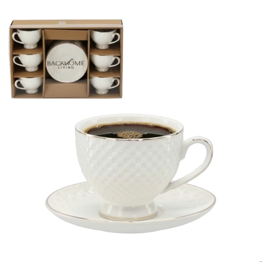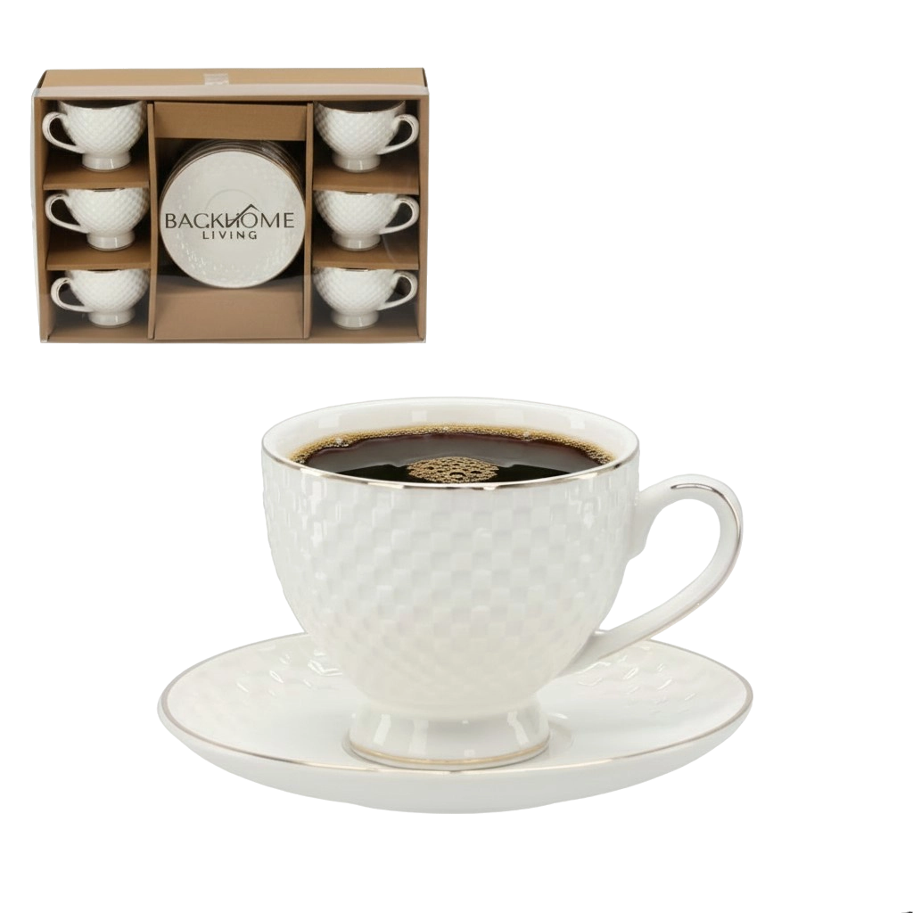 Set elegant de șase cești reliefate cu farfurioare, cu volum de 250 ml, decorate cu un brâu decorativ auriu. Relieful discret și designul atemporal conferă serviciului un caracter aparte – ideal atât pentru utilizare zilnică, cât și pentru ocazii festive.